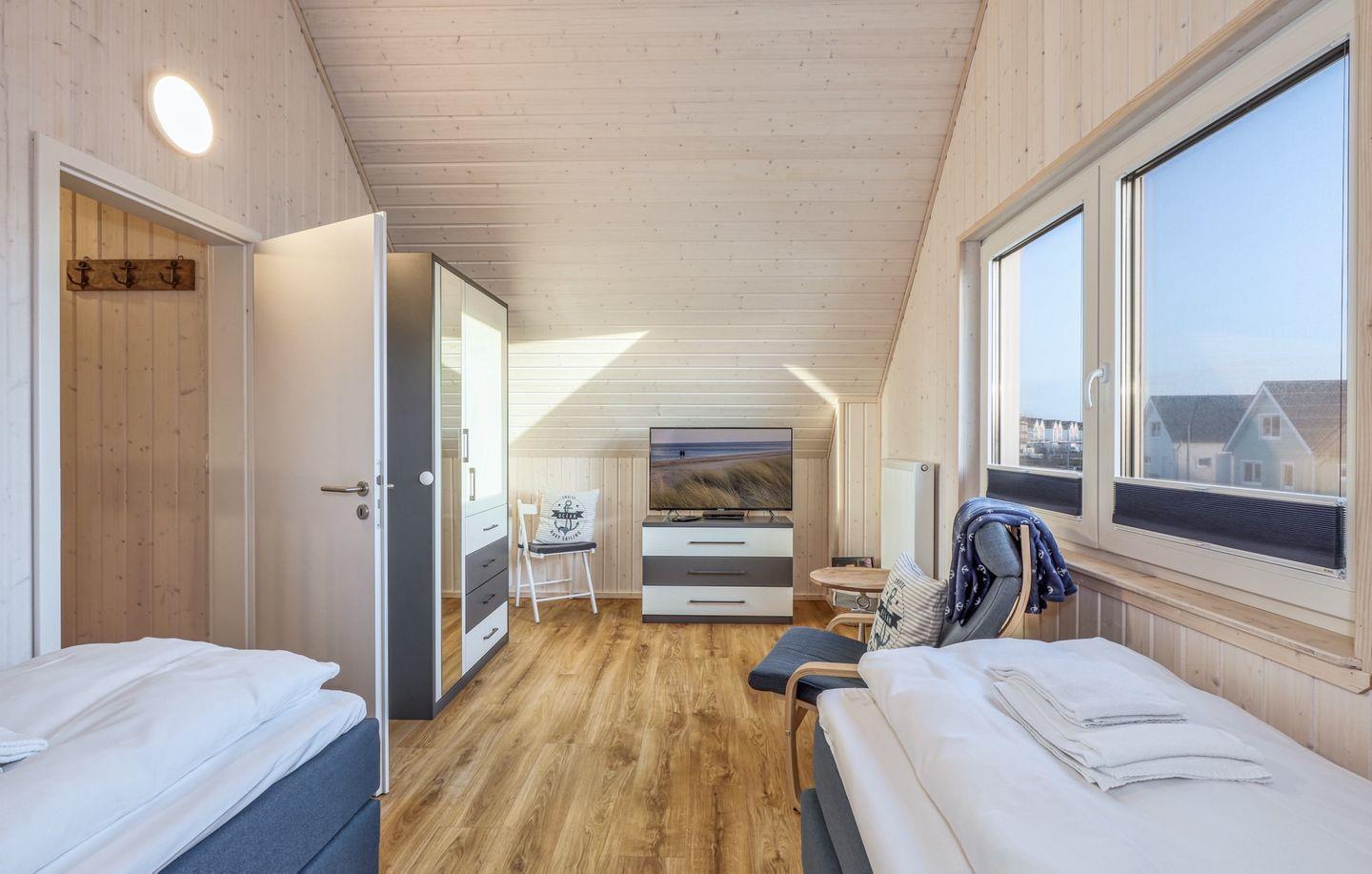 Das zweite Schlafzimmer ist mit zwei Einzelbetten (90x200 cm), einem Schrank, einer Kommode und einem Flachbild-TV ausgestattet.