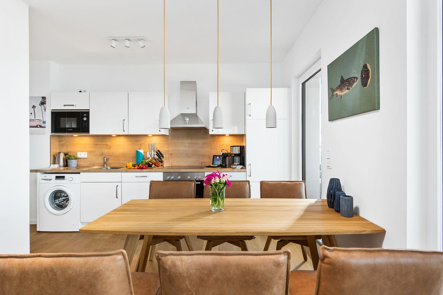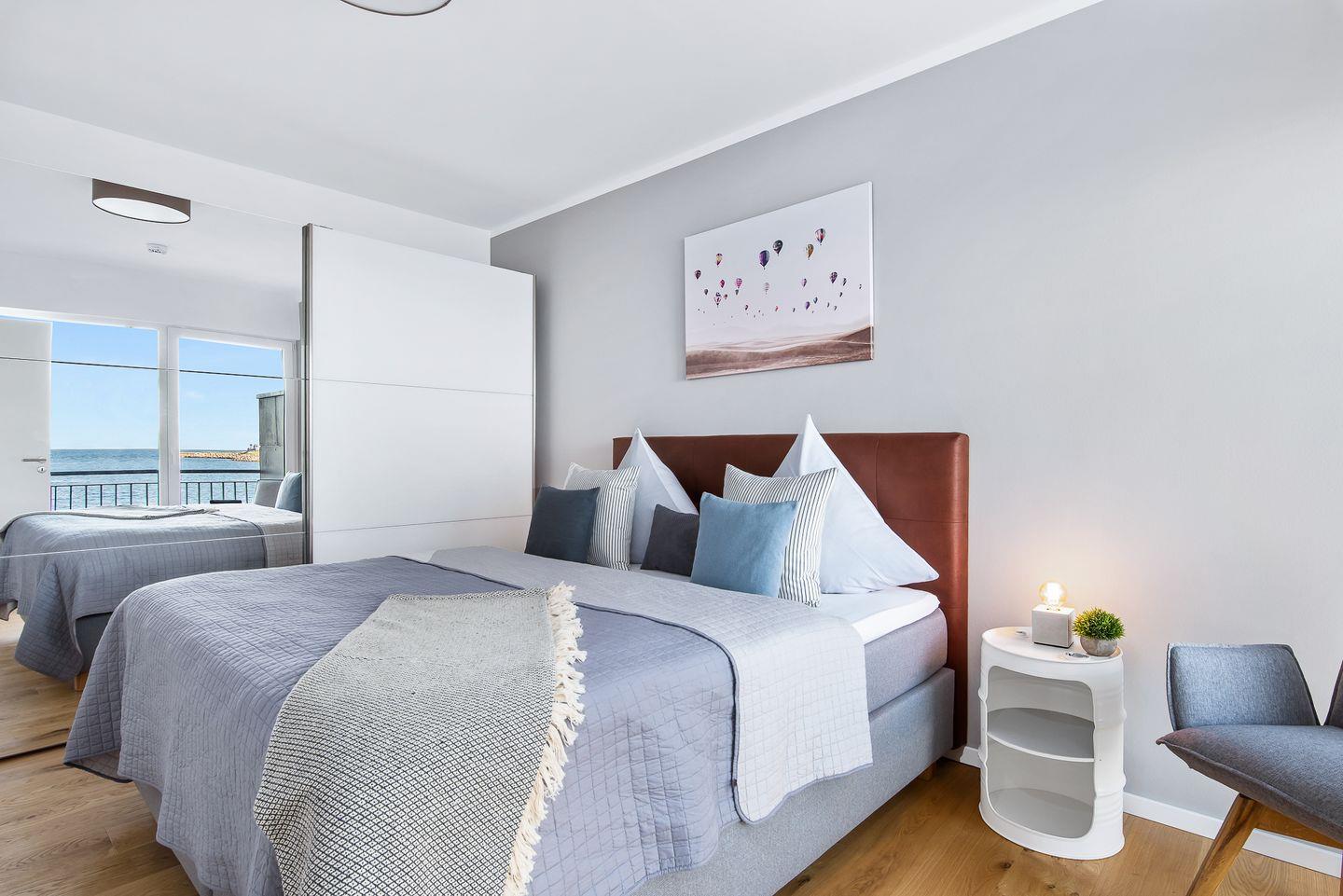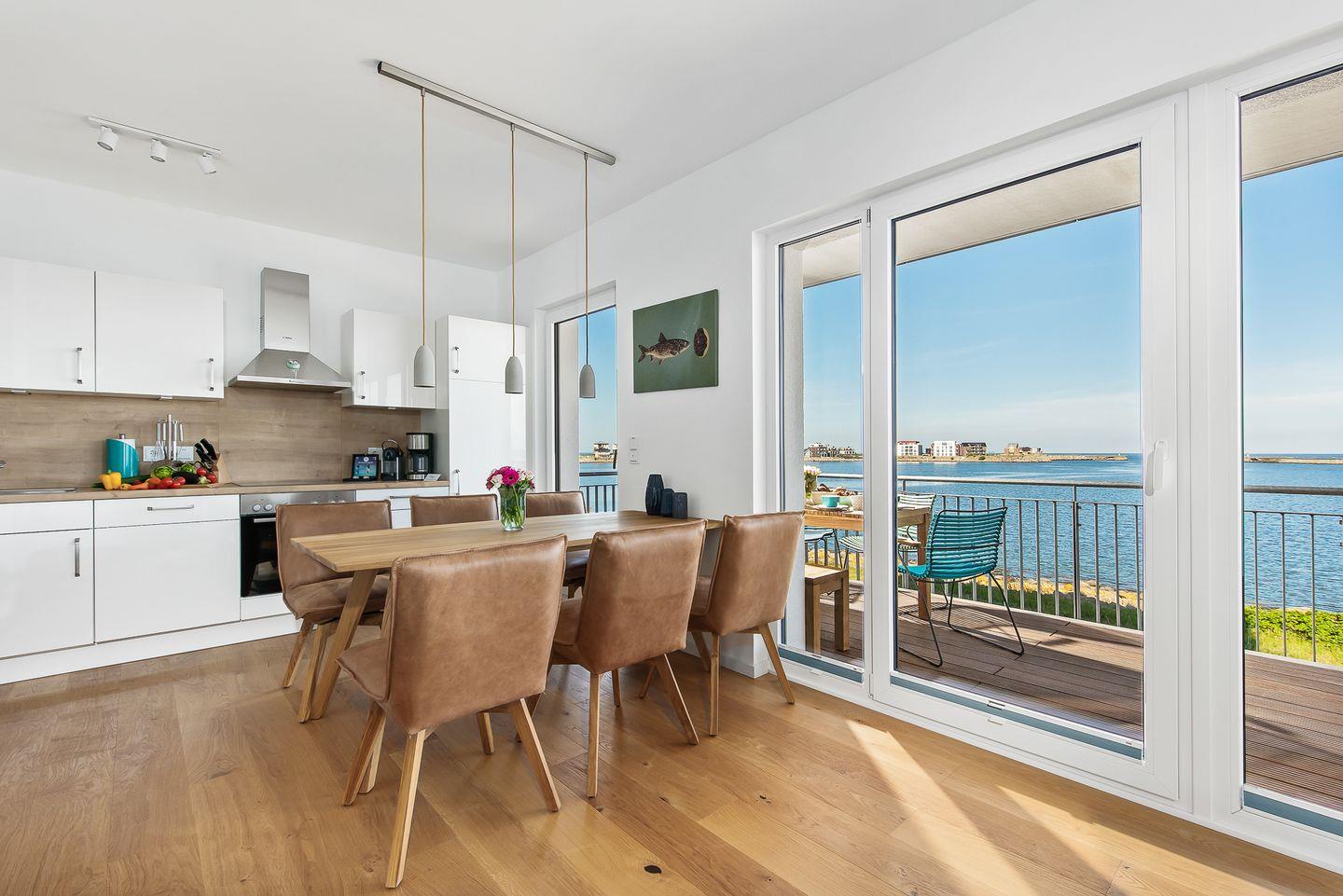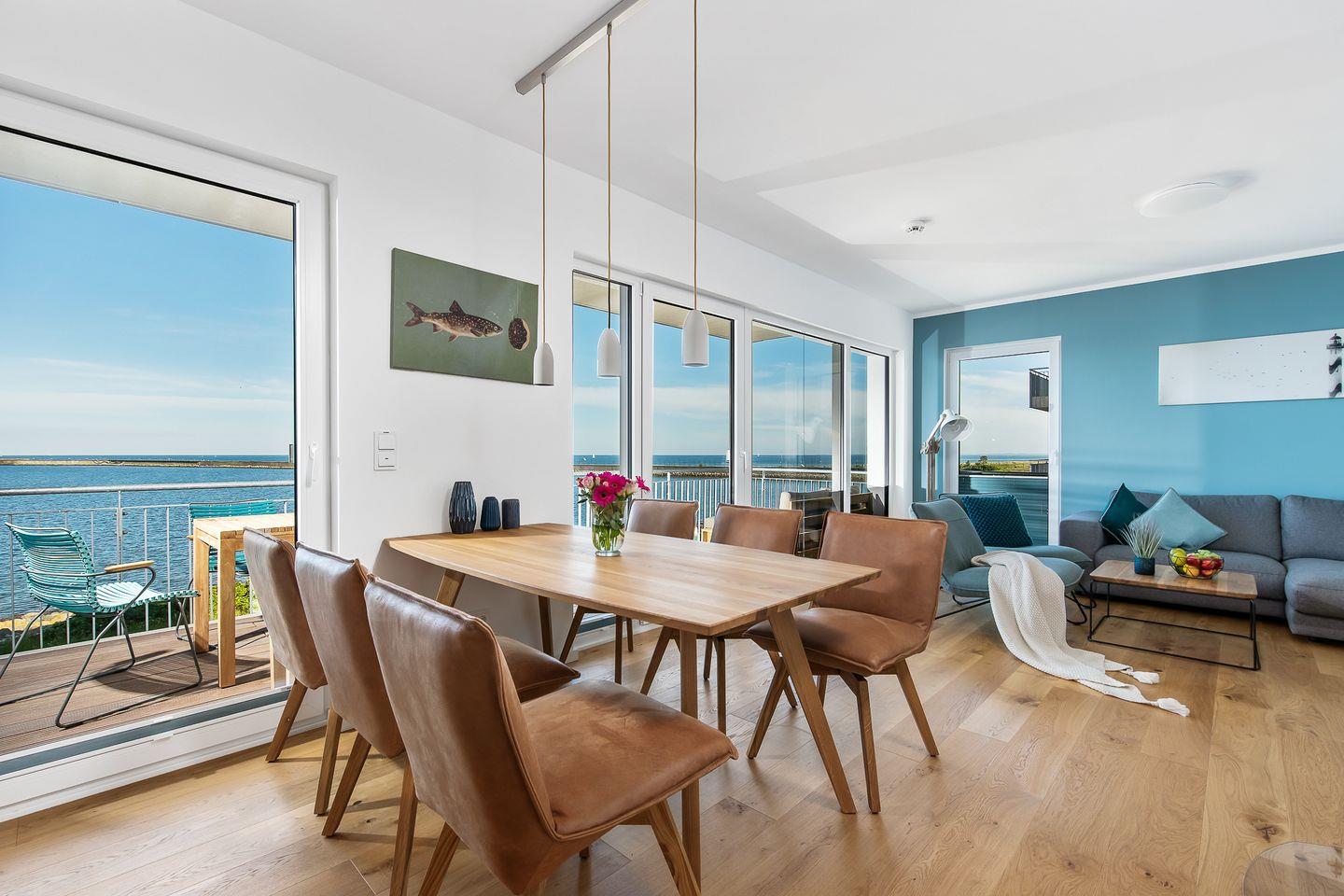 Direkt an der Ostsee gelegen, mit einem traumhaften Weitblick auf die freie Ostsee, bietet die Ferienwohnung "Perlentaucher" auf ca. 98m² Platz für 6 Personen. Vom Wohn- und Essbereich aus, mit bodentiefen Fenstern, haben Sie Zugang zum Herzstück dieser Ferienwohnung: den großen Balkon mit einem unvergesslichen Blick auf die freie Ostsee und die Hafeneinfahrt. Bestaunen Sie die Segelboote und genießen Sie die einzigartige Panoramasicht. Erholen Sie sich an kälteren Tagen auf dem Sofa mit der wohligen Wärme des gemütlichen Kaminofens und schauen Sie auf dem Flachbild-Fernseher Ihre Lieblingsserie. Die hochwertig ausgestattete Küche mit Meerblick ist offen zum Wohn- und Essbereich gestaltet und lädt zu gemeinsamen Kochabenden ein. Diese Ferienwohnung verfügt über zwei komfortable Doppelschlafzimmer mit Boxspringbetten (180x200cm), Kleiderschränken und Verdunkelungsmöglichkeiten, eines mit TV und eines mit Wasserblick. Das dritte Schlafzimmer sorgt mit zwei Einzelbetten (90x200cm) für Entspannung. Beide Badezimmer bieten ausreichend Platz, eine ebenerdige Dusche, einen Handtuchtrockner und einen großen Spiegel. Genießen Sie Ihr Frühstück auf den gemütlichen Gartenmöbeln bei Sonnenaufgang oder verbringen Sie gesellige Grillabende bei einem kühlen Getränk. Für die kleinen Gäste ist bestens gesorgt: Ein Kinderreisebett, ein Kinderhochstuhl und ein praktischer Kindertritthocker im Bad stehen bereit. Ein kostenfreier Parkplatz für ein Fahrzeug steht in der Tiefgarage zur Verfügung, ebenso wie ein gemeinschaftlicher abschließbarer Fahrradschuppen für Ihre Fahrräder.