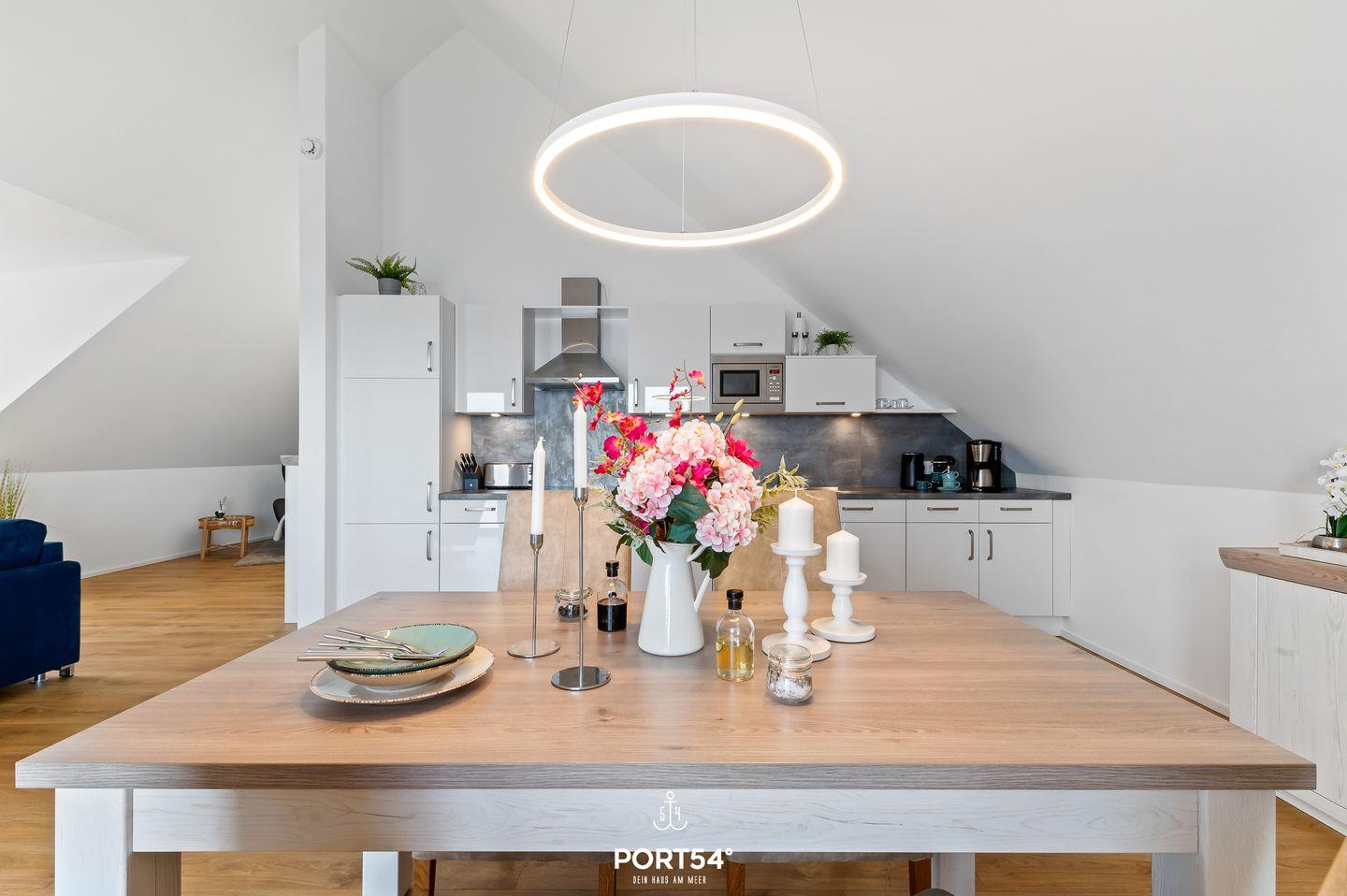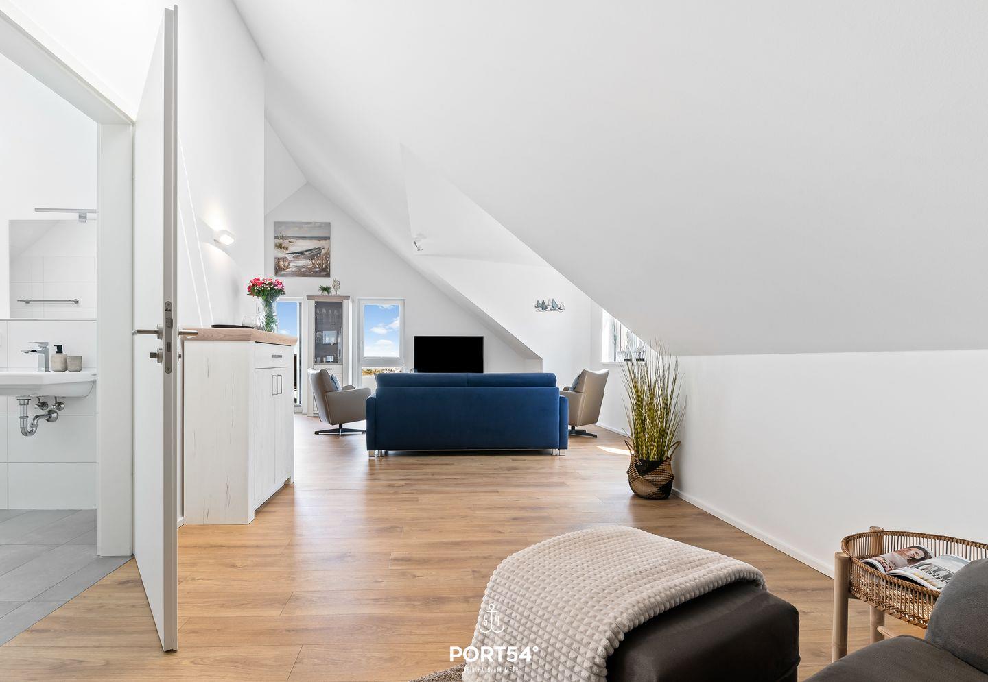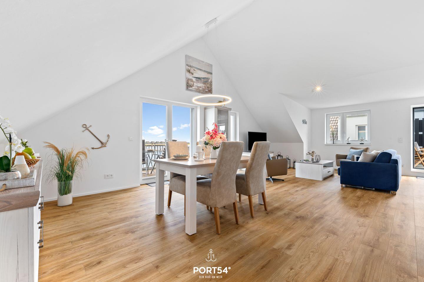 Genießen Sie in der Ferienwohnung "Hafenperle" einen unvergesslichen Panorama-Blick über das Hafenbecken von Olpenitz, den Yachthafen von Maasholm und die Schlei! Auf knapp 90m² bietet sie Ihnen ein Schlafzimmer mit einem Doppelbett, einen offenen Wohn-/Essbereich, eine Küche, sowie ein bequemes Schlafsofa. Das großzügige Bad verfügt über eine ebenerdige Dusche. Das Highlight ist der Balkon, auf dem Sie die Sonnenaufgänge genießen können. Ein kostenfreier Parkplatz befindet sich vor dem Haus.