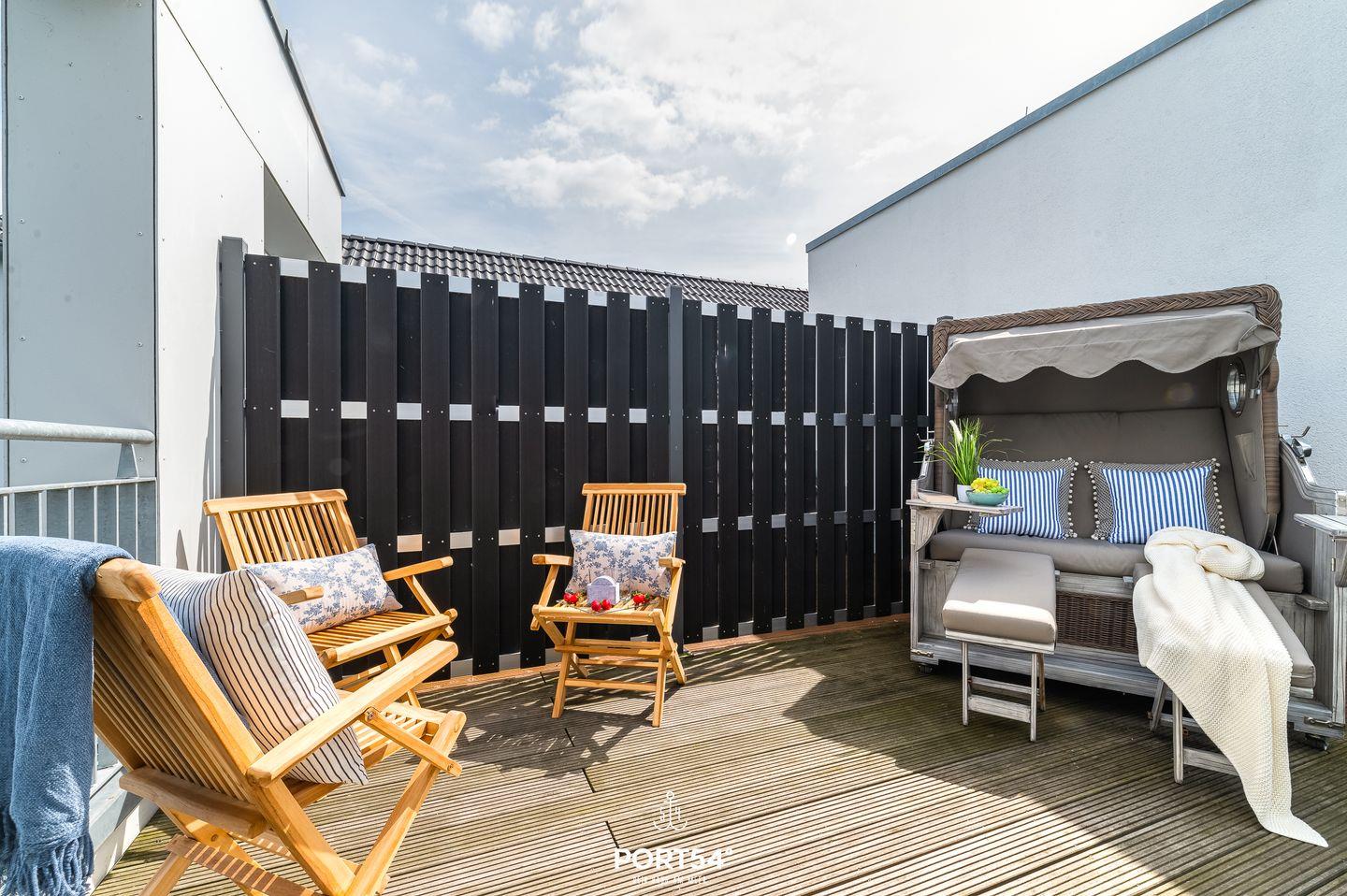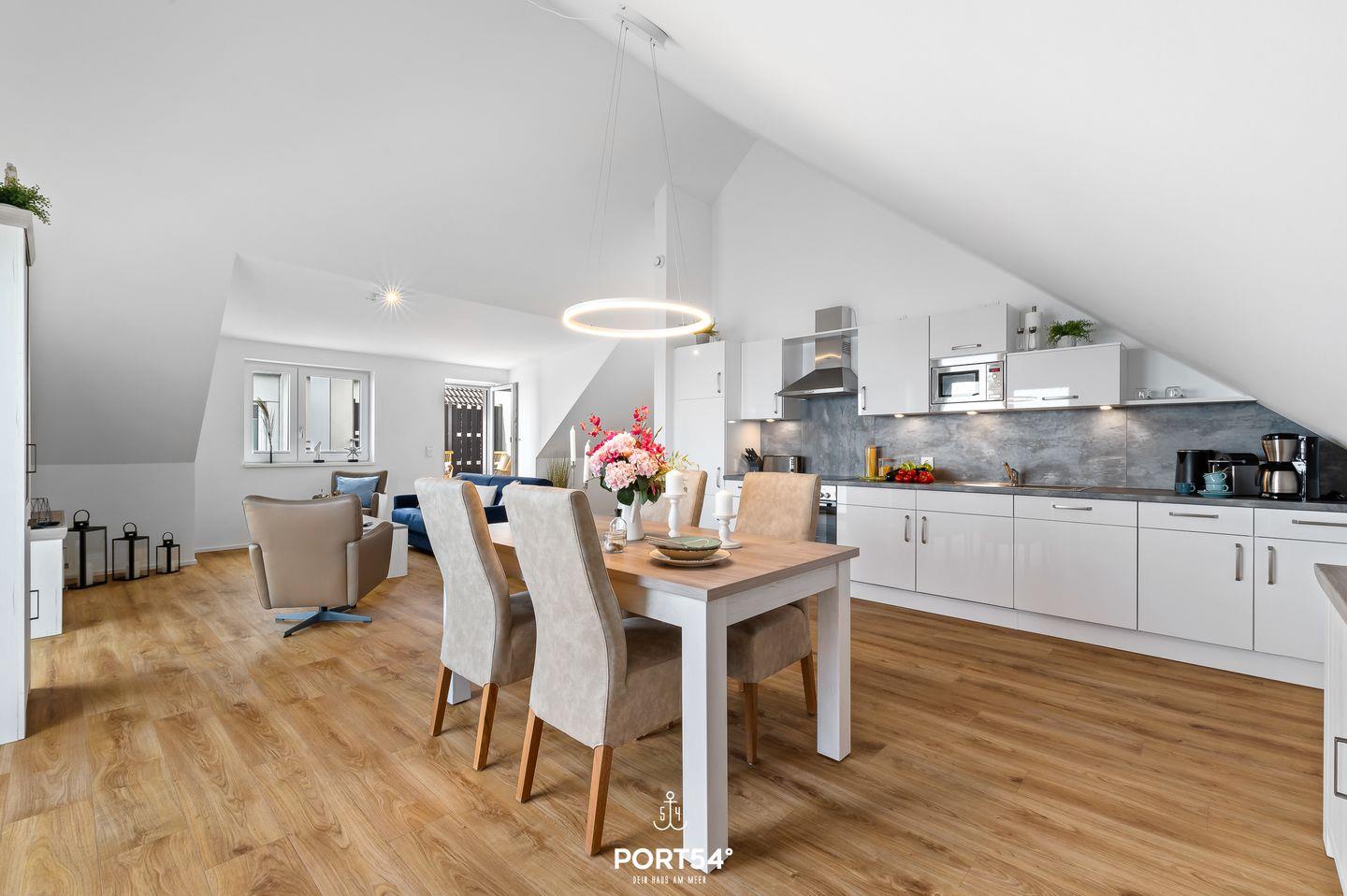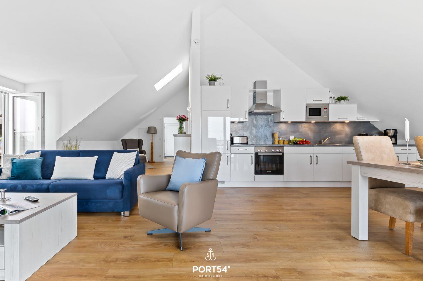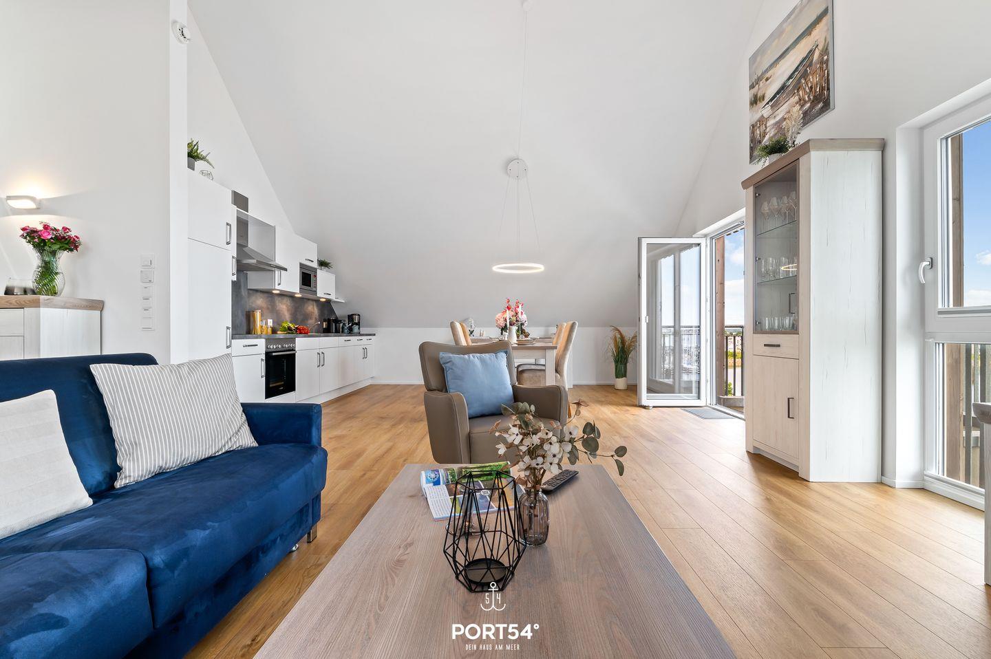 Genießen Sie, in der Ferienwohnung "Hafenperle" einen unvergesslichen Ausblick über das gesamte Hafenbecken des OstseeResorts - gleich zwei Balkone bieten Ihnen dazu die Gelegenheit! Auf 90m² finden Sie hier ausreichend Platz um einen entspannten Urlaub zu verbringen. Beim Betreten der Wohnung erwartet Sie ein großzügiger offener Wohn- und Essbereich, der dank großer Fensterflächen einen herrlichen blick auf das Hafenbecken freigibt. Das gemütliche Sofa lädt zum Verweilen ein und bietet Ihnen eine zusätzliche Schlafmöglichkeit für zwei Personen. Vom Wohnbereich aus gelangen Sie auf beide Balkone. Auf dem einen Balkon können Sie sichtgeschützt im Strandkorb sitzen und Seele baumeln lassen. Der zweite Balkon geht zur Promenade raus und lädt Sie dazu ein Ihren Blick über das Wasser schweifen zu lassen. Mit etwas Glück können Sie Schweinswale im Hafenbecken beobachten. Bei schlechtem Wetter können Sie es sich bei Ihrem Lieblingsfilm vor dem TV und einem Gläschen Wein so richtig gemütlich machen. Die offene Küche lässt keine Wünsche offen. Neben einem Herd mit Ceranfeld und Dunstabzug, Backofen, Mikrowelle sowie einem Kühlschrank mit Gefrierfach, stehen Ihnen hier auch eine Espressomaschine, Wasserkocher und Toaster sowie eine umfangreiche Auswahl an Koch- und Essgeschirr zur Verfügung. Das separate Schlafzimmer ist mit einem komfortablen Boxspring-Doppelbett (180x200cm), einem Kleiderschrank, Insektenschutzgitter, Verdunkelungsmöglichkeiten und einem eigenen Fernseher ausgestattet. Das moderne Tageslichtbad verfügt über eine ebenerdige Dusche und bietet zudem einen Kosmetikspiegel, einen Handtuchheizkörper und einen Föhn. Zusätzlich steht Ihnen eine Waschmaschine zur Verfügung, die besonders bei längeren Aufenthalt praktisch ist. Die Wohnung befindet sich im 3. Stock und ist über Außentreppen und einen Aufzug erreichbar. Vor dem Gebäude stehen Ihnen ein kostenloser PKW-Stellplatz und ein gemeinschaftlich genutzter Fahrradschuppen zur Verfügung. Die Hafenperle ist die perfekte Wahl für einen erholsamen Urlaub am Wasser mit direktem Zugang zur wunderschönen Natur und den Annehmlichkeiten der Hafenpromenade in Olpenitz.