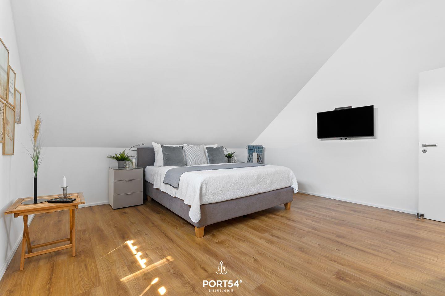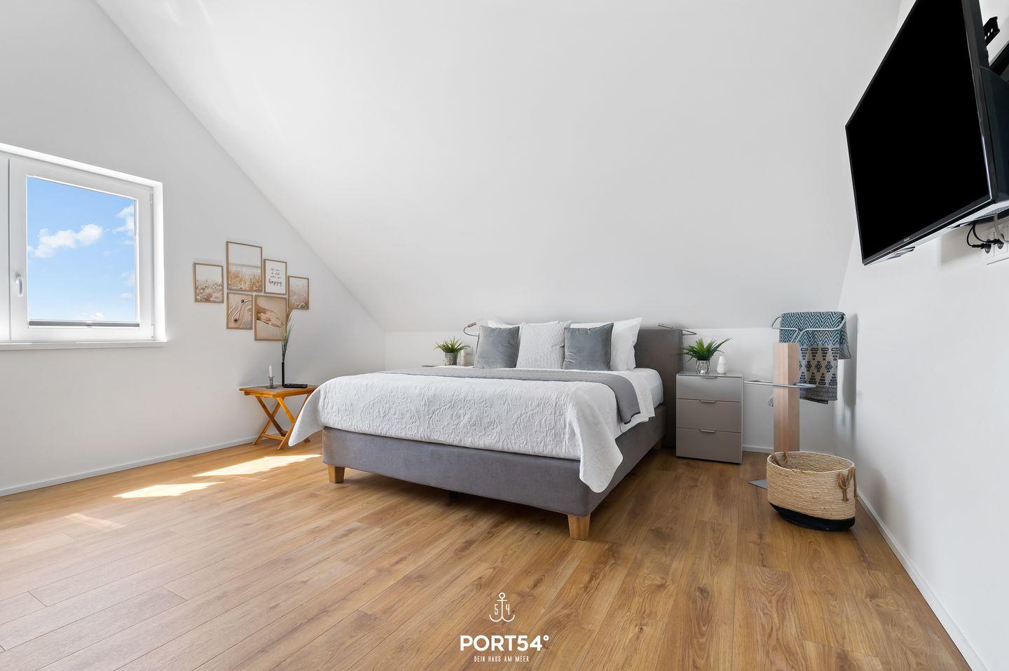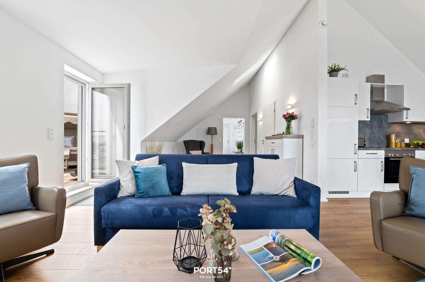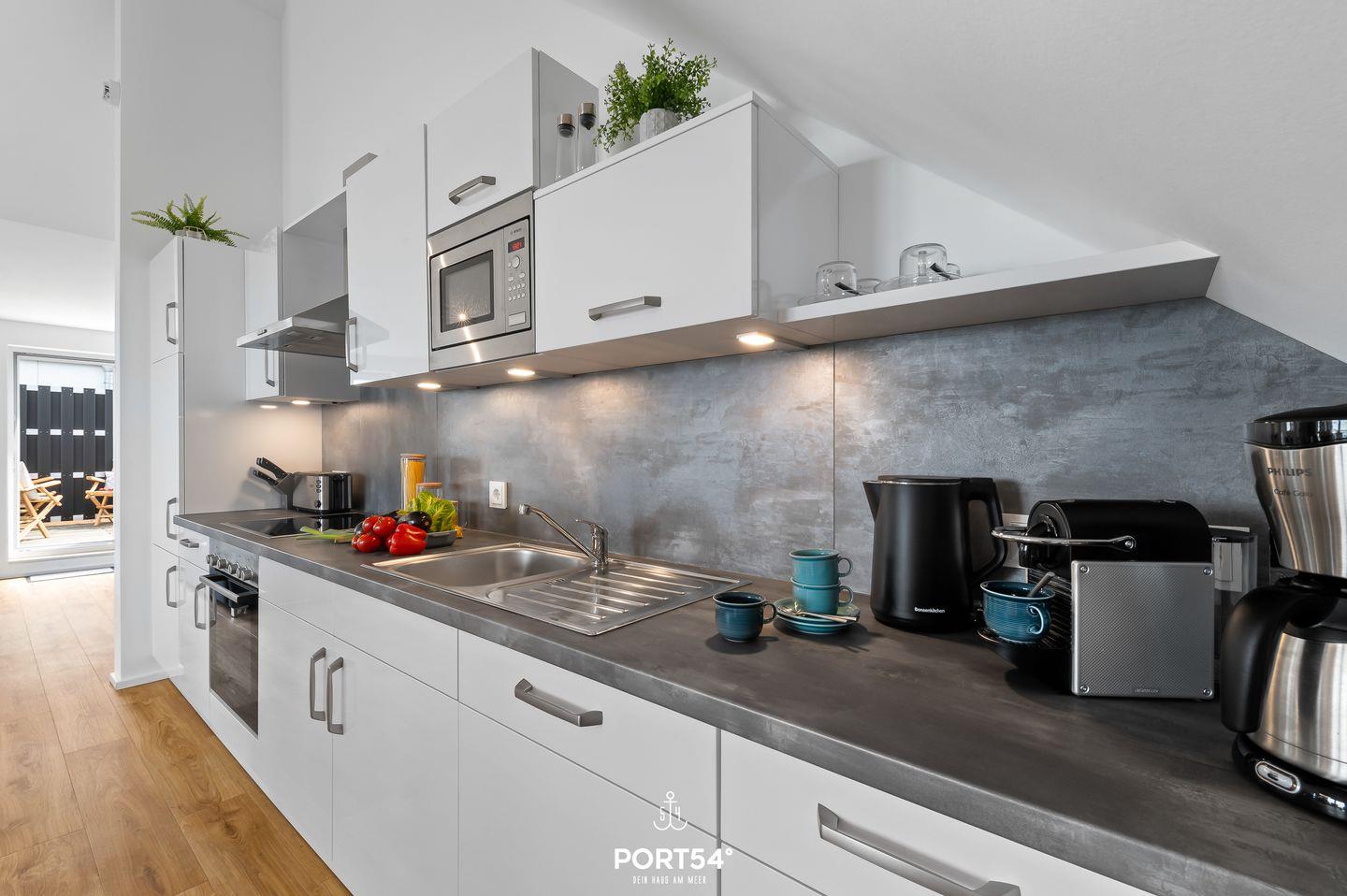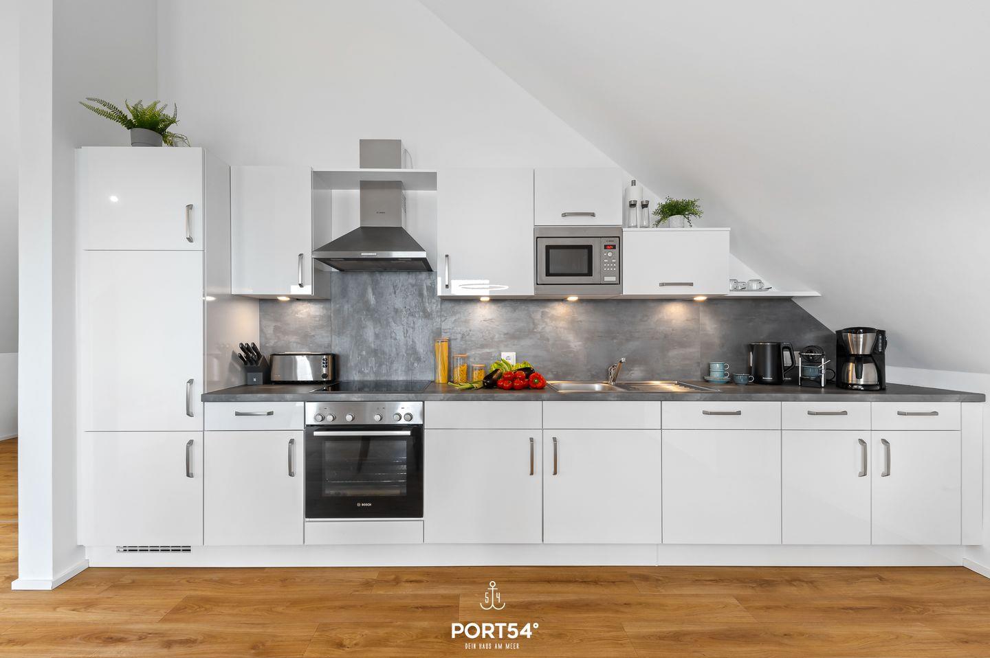 Genießen Sie, in der Ferienwohnung "Hafenperle" einen unvergesslichen Ausblick über das gesamte Hafenbecken des OstseeResorts - gleich zwei Balkone bieten Ihnen dazu die Gelegenheit! Auf 90m² finden Sie hier ausreichend Platz um einen entspannten Urlaub zu verbringen. Beim Betreten der Wohnung erwartet Sie ein großzügiger offener Wohn- und Essbereich, der dank großer Fensterflächen einen herrlichen blick auf das Hafenbecken freigibt. Das gemütliche Sofa lädt zum Verweilen ein und bietet Ihnen eine zusätzliche Schlafmöglichkeit für zwei Personen. Vom Wohnbereich aus gelangen Sie auf beide Balkone. Auf dem einen Balkon können Sie sichtgeschützt im Strandkorb sitzen und Seele baumeln lassen. Der zweite Balkon geht zur Promenade raus und lädt Sie dazu ein Ihren Blick über das Wasser schweifen zu lassen. Mit etwas Glück können Sie Schweinswale im Hafenbecken beobachten. Bei schlechtem Wetter können Sie es sich bei Ihrem Lieblingsfilm vor dem TV und einem Gläschen Wein so richtig gemütlich machen. Die offene Küche lässt keine Wünsche offen. Neben einem Herd mit Ceranfeld und Dunstabzug, Backofen, Mikrowelle sowie einem Kühlschrank mit Gefrierfach, stehen Ihnen hier auch eine Espressomaschine, Wasserkocher und Toaster sowie eine umfangreiche Auswahl an Koch- und Essgeschirr zur Verfügung. Das separate Schlafzimmer ist mit einem komfortablen Boxspring-Doppelbett (180x200cm), einem Kleiderschrank, Insektenschutzgitter, Verdunkelungsmöglichkeiten und einem eigenen Fernseher ausgestattet. Das moderne Tageslichtbad verfügt über eine ebenerdige Dusche und bietet zudem einen Kosmetikspiegel, einen Handtuchheizkörper und einen Föhn. Zusätzlich steht Ihnen eine Waschmaschine zur Verfügung, die besonders bei längeren Aufenthalt praktisch ist. Die Wohnung befindet sich im 3. Stock und ist über Außentreppen und einen Aufzug erreichbar. Vor dem Gebäude stehen Ihnen ein kostenloser PKW-Stellplatz und ein gemeinschaftlich genutzter Fahrradschuppen zur Verfügung. Die Hafenperle ist die perfekte Wahl für einen erholsamen Urlaub am Wasser mit direktem Zugang zur wunderschönen Natur und den Annehmlichkeiten der Hafenpromenade in Olpenitz.
