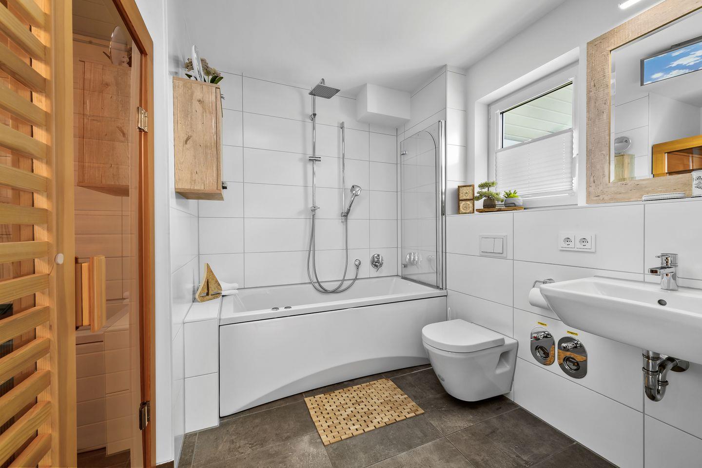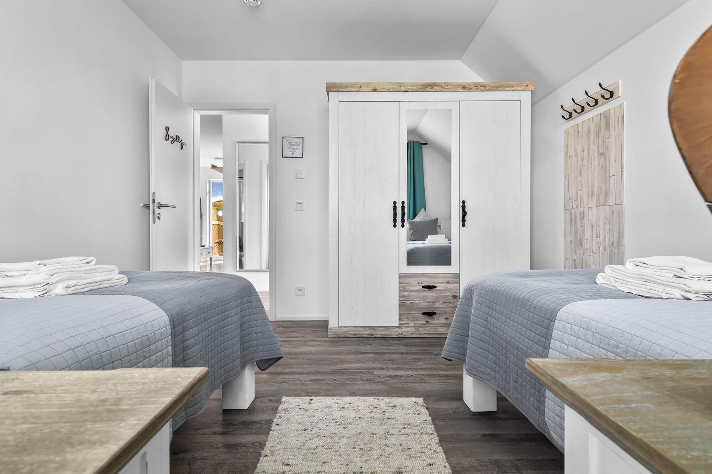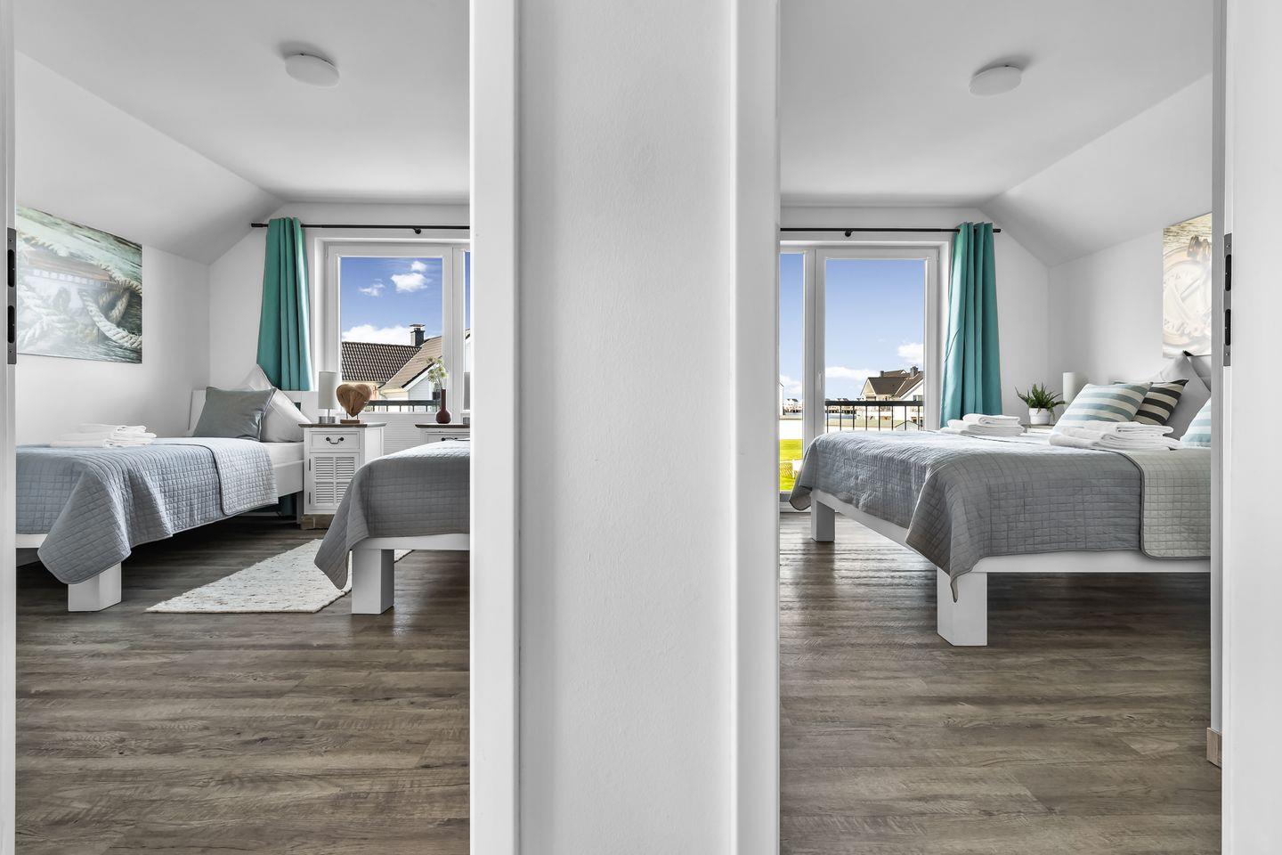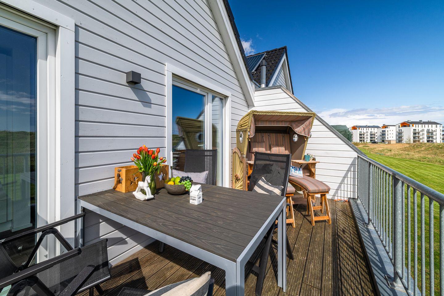 Das Hauptschlafzimmer hat ein King-Size-Doppelbett und das zweite Schlafzimmer bietet zwei Einzelbetten. Der Wohnbereich mit Kamin und Flachbildfernseher sorgt für Gemütlichkeit, die offene Küche ist voll ausgestattet. Das Bad bietet Whirlpool-Badewanne und Infrarot-Sauna. Für Kinder gibt es Reisebett, Hochstuhl, Tritthocker und Spielsachen. Der Balkon hat Gartenmöbel, Strandkorb, Sonnenschirm und Grill. PKW-Stellplatz und Fahrradschuppen sind vorhanden. Perfekt für Familien und Paare!