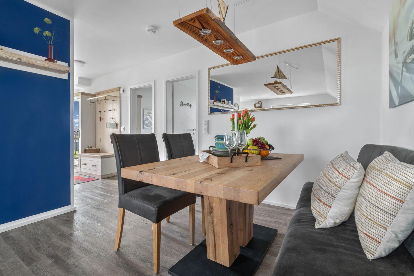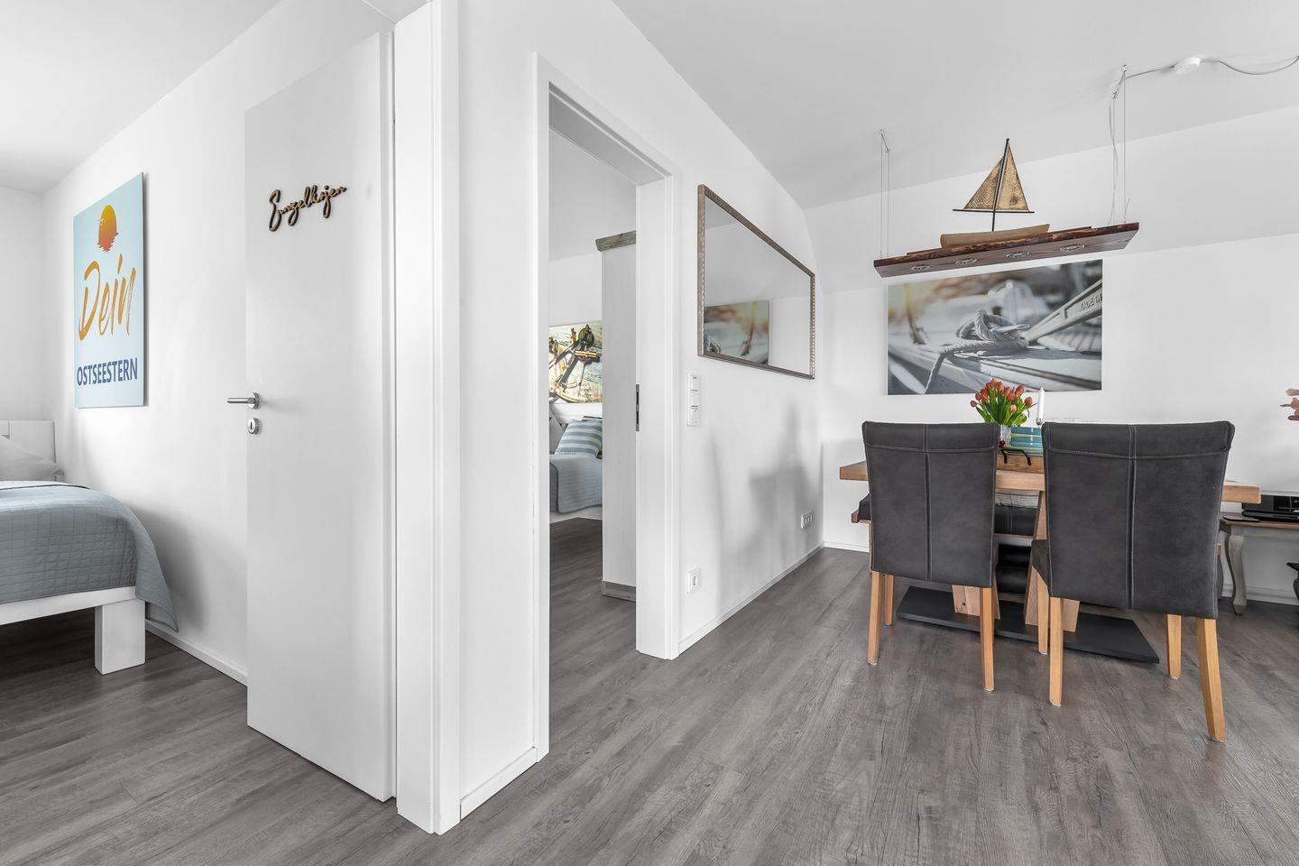 Dieses modern und hochwertig eingerichtete Apartment ist im schönen Ostseeresort Olpenitz zwischen Schlei und Ostseeküste gelegen. Ein großer Strandkorb, ein Kaminofen und eine Infrarotkabine gehören zur hochwertigen Ausstattung. Sie können sich auf zwei Sonnenterrassen bewegen, eine davon ist sogar überdacht. In 2020 wurde dieses Apartment fertig gestellt. Wir nannten es "Glück", denn uns macht es glücklich und wir hoffen sehr, Sie auch! Die Lage ist einzigartig, wenn man Ruhe mag. Es liegt am Rande der großen Freifläche auf der Kapitänshalbinsel, welche zurzeit Richtung Ostsee noch unverbaut ist und somit den Blick bis zur Ostsee frei gibt. Es ist ein Traum hier zu frühstücken! Die Bebauung ist hier auf der Kapitänshabinsel sehr, sehr locker. Das war es auch, was uns neben der Nähe zum Weidefelder Strand so gut gefiel. Bis zu 4 Personen und 3 Hunde finden hier genügend Platz in 2 Schlafzimmern und einem offenen Wohn-, Ess- und Küchenbereich. Von hier aus führen zwei bodentiefe Terrassen-Fenster auf die Ostterrasse Richtung Meerblick. Der große Strandkorb mit Bullaugen ermöglicht es auch bei Wind und niedrigeren Temperaturen gemütlich draußen zu sitzen und den Zugvögeln zuzusehen. Richtung Süden findet Sie den Zugang zur 2. Terrasse, welche überdacht ist und wo Sie gemütliche Holzmöbel finden. Von hier aus können Sie Richtung Hafen den Sonnenuntergang erleben. Das große L-Sofa steht mit Blick in Richtung Ostsee. Ein Smart-TV mit Netflixzugang und vielen weiteren Spielerein ist vorhanden. Für die Kleinen gibt es Kinderbücher und verschiedene Spielzeuge. Ein Fernglas hängt nur für Sie an der Wand. Es gibt ein Schlafzimmer mit Doppelbett (200x200cm) und TV, sowie ein zweites Schlafzimmer mit zwei Einzelbetten (90x200cm), welche natürlich auch zum Doppelbett zusammengeschoben werden können. Gemütliche skandinavische Betten mit hohem Einstieg und hochwertigen Matratzen waren hier die 1. Wahl. Bei der Essecke haben wir uns für eine Sitzbank und zwei Stühle entschieden. Es ist einfach gemütlich sich hier hin zu lümmeln, natürlich auch gemeinsam an dem massiven Naturholztisch zu essen. Dieser Bereich ist gut als Arbeitsplatz nutzbar. Das Internet ist hier schnell und stabil, eine Steckdose direkt neben der Bank, so dass man hier auch gut arbeiten kann, wenn nötig. Zum Weidefelder Strand sind es tatsächlich nur wenige Gehminuten. Der 1. Spaziergang am frühen Morgen kann also bereits direkt am Strand stattfinden. Der Hundestrand ist ca. 800 Meter entfernt. Jedoch können Hunde in der Nebensaison auch überall freilaufen. Sie können direkt vom Apartment bis nach Schönhagen und auch Damp laufen. Es gibt hier einfach unendlich viele Möglichkeiten zu laufen und auch Fahrrad zu fahren. Der Italiener "Ciao Bella" sowie der EDEKA, das Kunstcafé und ein Geschäft mit Dekoartikeln sind in Laufnähe. Der neue Beachclub, der 2024 eröffnet wurde, ist ebenfalls fußläufig, vorbei am Seglerhafen erreichbar. Ein Stellplatz befindet sich direkt am Apartment und ein Schuppen steht euch für Fahrräder, Bollerwagen oder sonstiges, was ihr nicht mit in das Apartment nehmen wollt, zur Verfügung. Ein Elektrogrill und ein Sonnenschirm stehen dort zu Ihrer Verwendung bereit. Die Ostsee und besonders auch dieses Apartment sind auch für die Wintermonate wunderbar geeignet. Ein Kaminofen und eine Infrarotsauna nach einem ausgiebigen Spaziergang, was will man mehr? Für diese Jahreszeit haben wir auch das indirekte Licht gestaltet. Es verläuft im Wohn-Essbereich am Fußboden sowie auf dem Bücherregal und kann in allen Farben und Helligkeitsstufen geschaltet werden. Apropos Bücherregal, es gibt eine kleine Tauschbörse mit Büchern. Hier können gerne Bücher getauscht werden. In der Mini-Ostseebibliothek finden Sie Bücher zum Thema Ostsee, Schleiregion, Reiseführer etc. Wir freuen uns sehr auf Ihren Besuch in unserem Traumapartment!