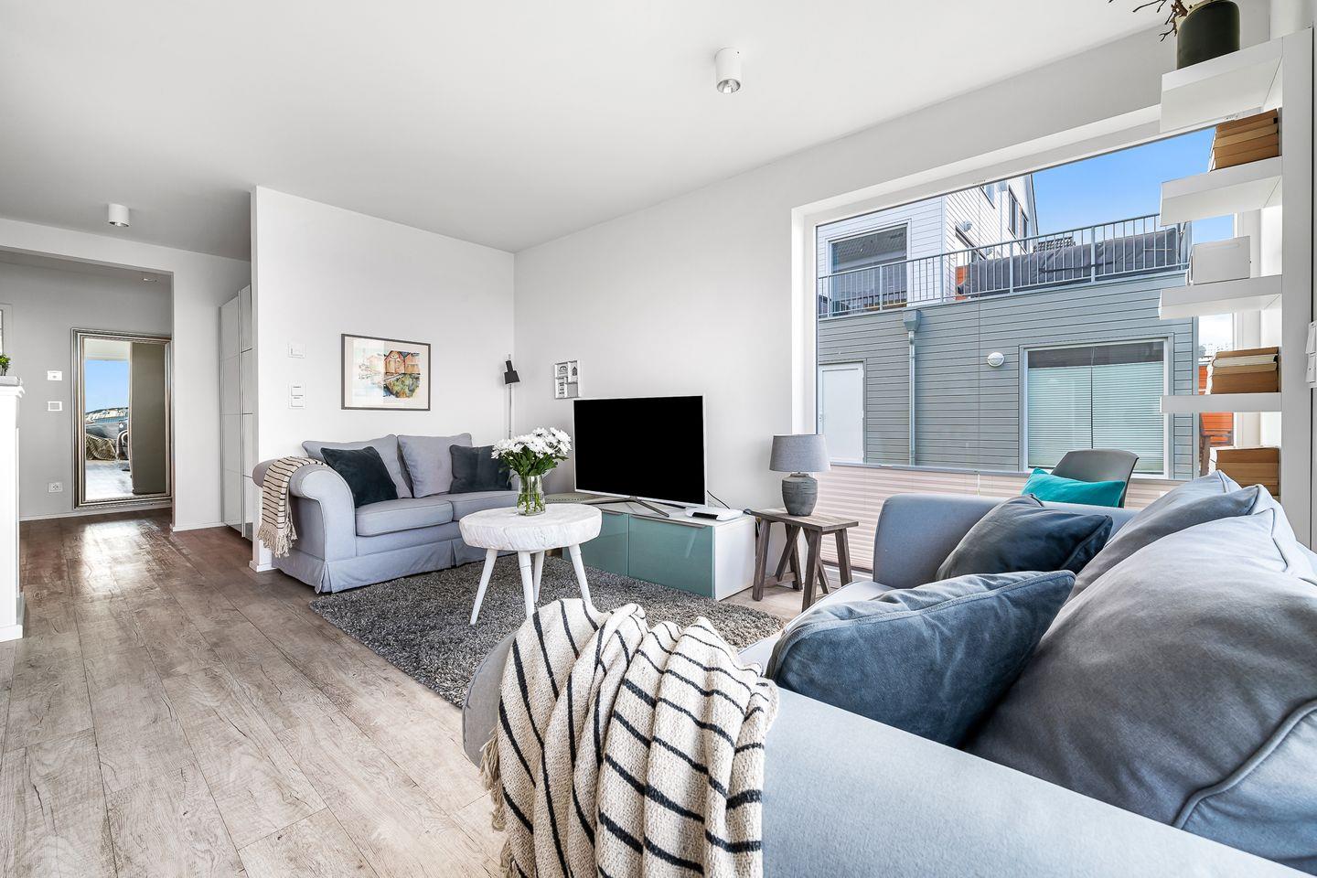 Der Wohnbereich lädt Dich zum Verweilen ein – mache es Dir auf dem bequemen Sofa gemütlich und genieße Deine Lieblingsserie auf dem Flachbild-TV.