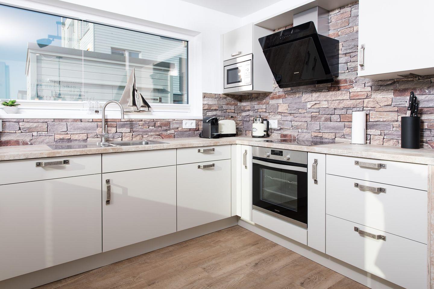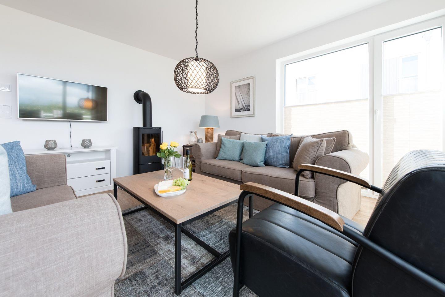 Im Inneren des Hauses erwartet Dich ein modernes und stilvolles Ambiente. Die offene Küche im Erdgeschoss ist vollständig ausgestattet und bietet Dir mit hochwertigen Elektrogeräten, darunter ein Induktionsherd, eine Mikrowelle, eine Espressomaschine und ein Geschirrspüler, alles, was Du für die Zubereitung und den Genuss Deiner Mahlzeiten benötigst. Der großzügige Essbereich und das gemütliche Wohnzimmer, ebenfalls in der unteren Etage gelegen, sind ideal für gesellige Abende und entspannte Stunden mit Familie und Freunden. Ein knisternder Kaminofen sorgt zu jeder Jahreszeit für Wärme und Gemütlichkeit. Dank digitalem TV-Anschluss und kostenfreiem WLAN stehen Dir vielfältige Unterhaltungsoptionen zur Verfügung.