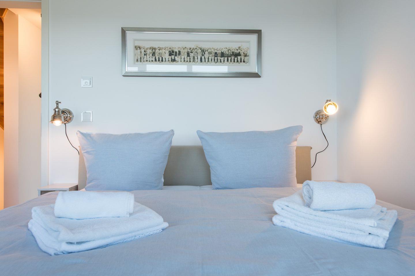 Das Ferienhaus verfügt über insgesamt drei komfortable Schlafzimmer, in denen Du erholsame Nächte verbringen kannst. Im 1. Obergeschoss findest Du ein Schlafzimmer mit Doppelbett (180 x 200 cm) und traumhaftem Meerblick durch bodentiefe Fenster sowie ein weiteres Schlafzimmer mit zwei gemütlichen Einzelbetten (90 x 200 cm). Beide Schlafzimmer sind mit einem Kleiderschrank ausgestattet, in dem Du Deine Kleidung bequem verstauen kannst. Zusätzlich befindet sich im Zimmer mit den Einzelbetten ein TV für entspannte Filmabende. Das dritte Schlafzimmer liegt im 2. Obergeschoss und ist mit einem komfortablen Schlafsofa ausgestattet, von dem aus Du direkten Zugang zur Dachterrasse hast.