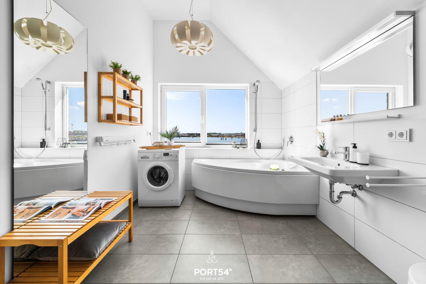 Ebenfalls auf dieser Etage befindet sich ein großzügiges Badezimmer. Genieße den traumhaften Ausblick aus der Whirlwanne oder erhole Dich in der privaten Infrarot-Wärmekabine.