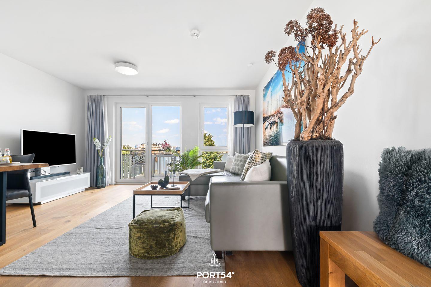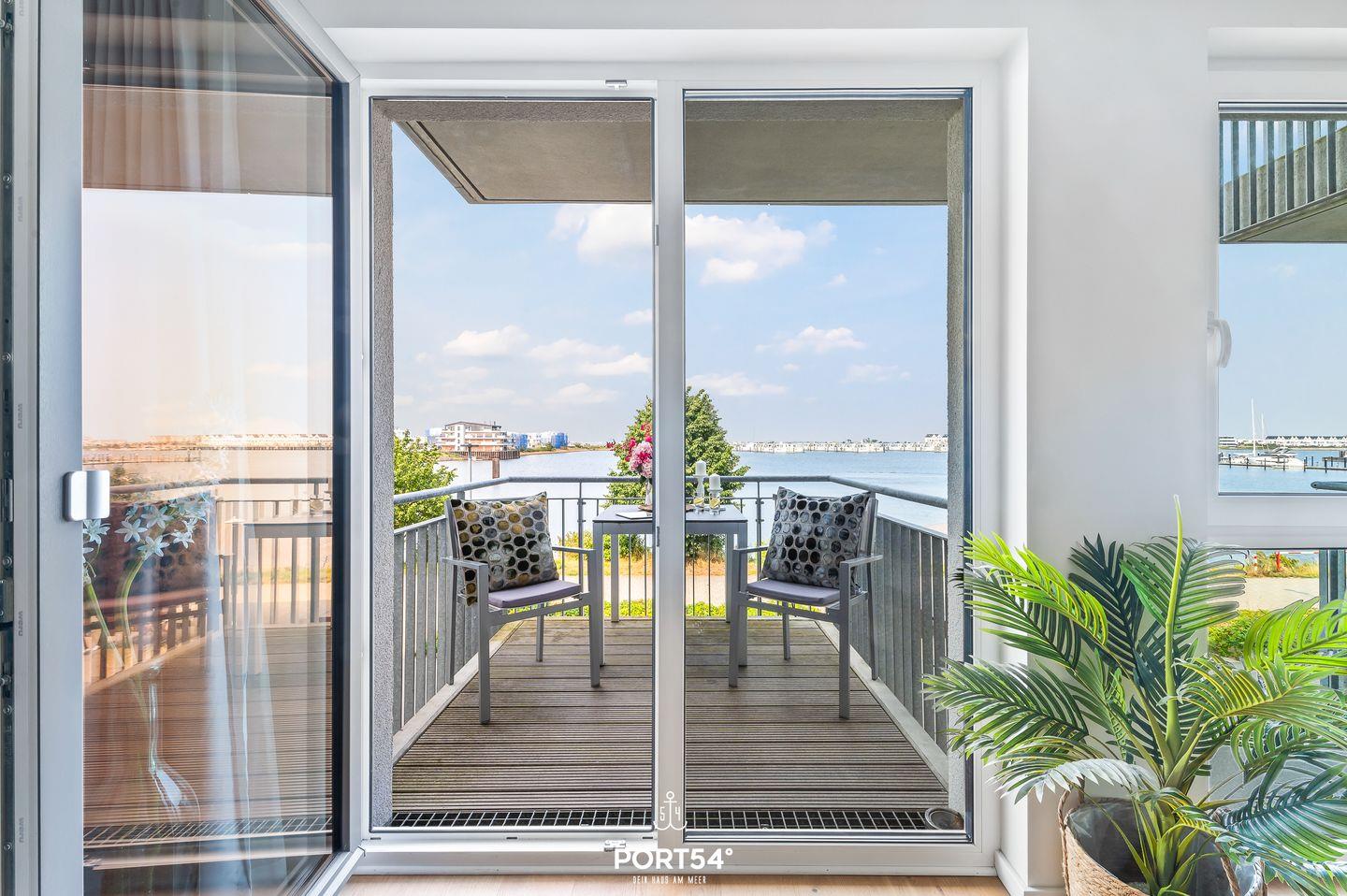 Moderne Ferienwohnung "Harbour Side" in Olpenitz mit Balkon und Meerblick, ideal für Erholung und Aktivitäten am Wasser.