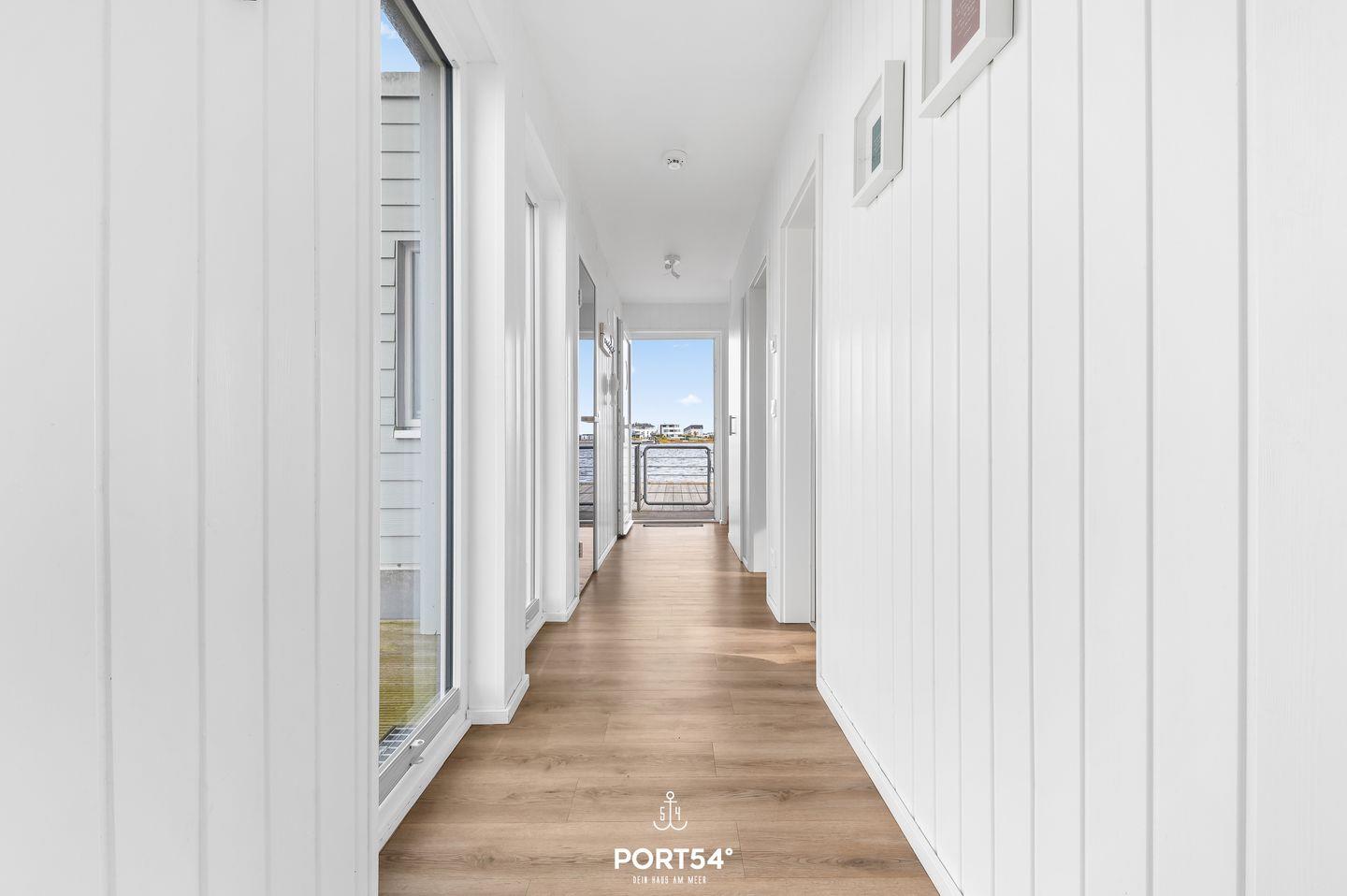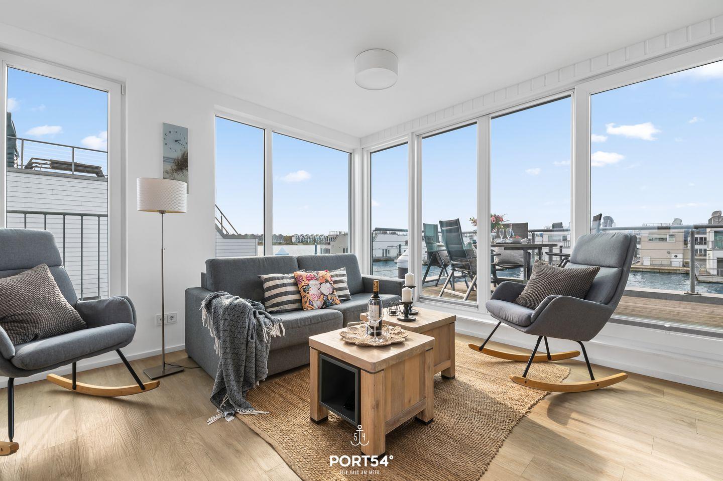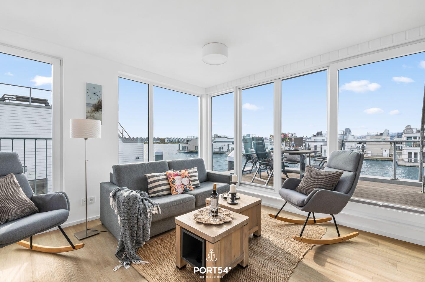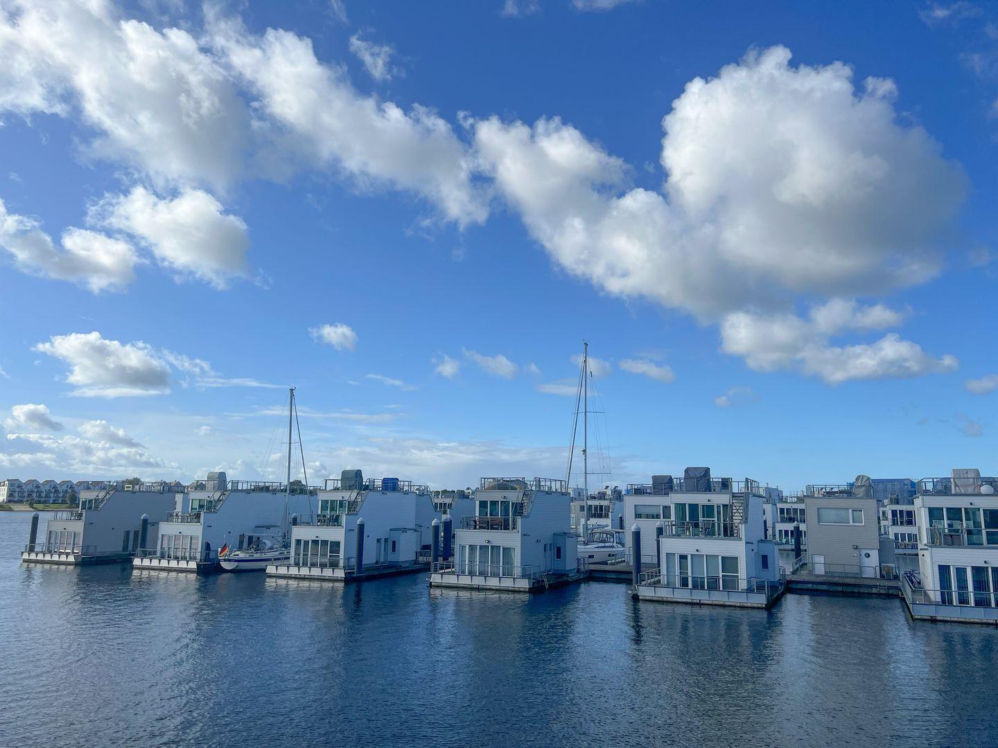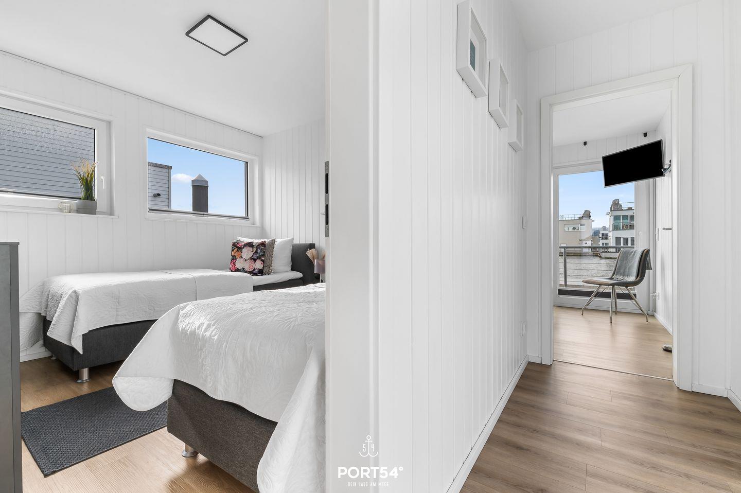 Stelle Dir vor, Du wachst im schwimmenden Ferienhaus „Am Pier“ mit direktem Blick aufs Wasser auf.