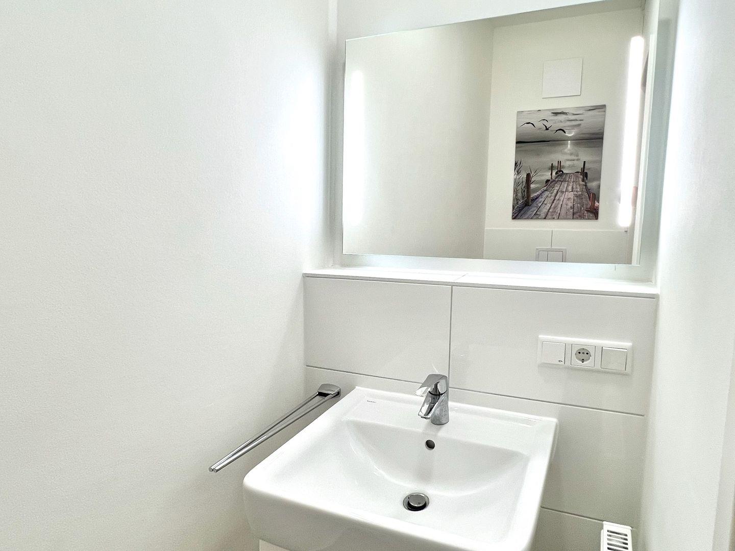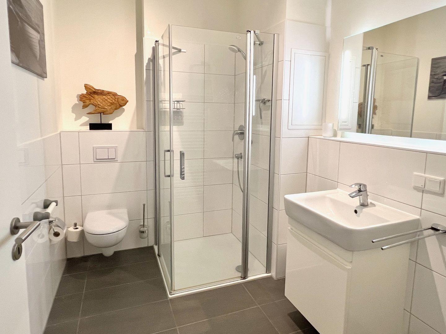 Das moderne Badezimmer bietet eine ebenerdige Dusche, zusätzlich gibt es ein separates Gäste-WC.