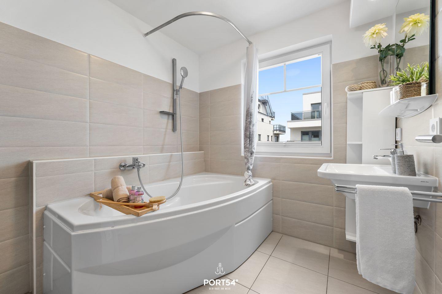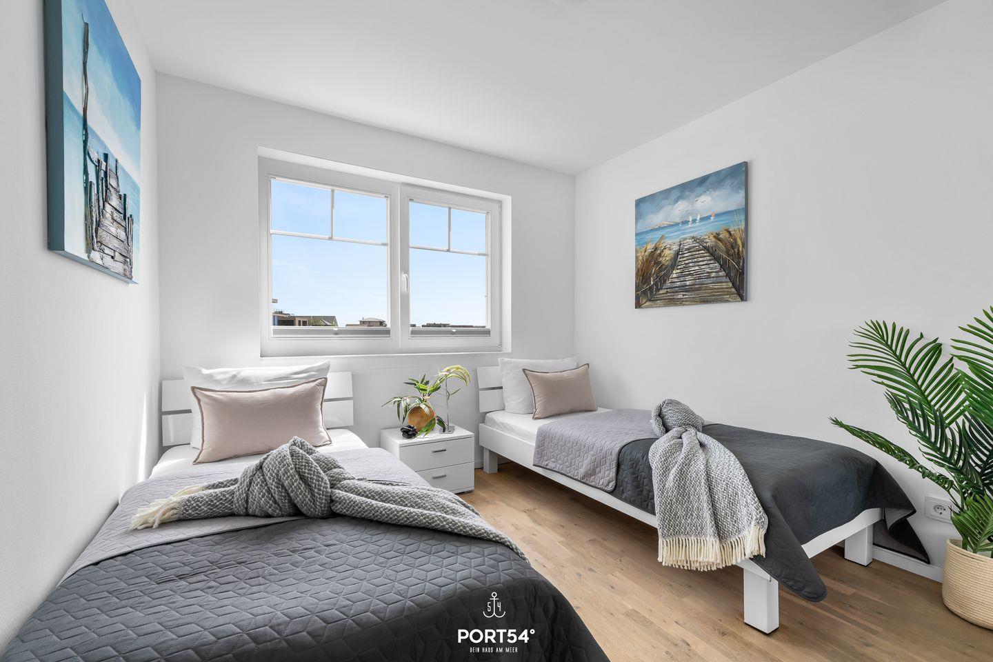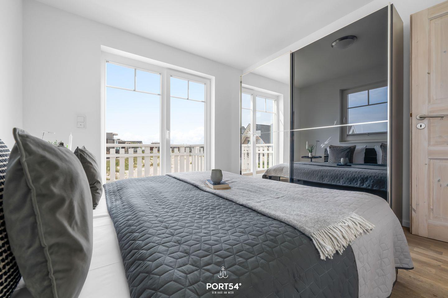 Im 1. Obergeschoss befindet sich ein Tageslichtbad mit einer Whirlwanne. Ein Kosmetikspiegel, ein Fön und Insektenschutzgitter sorgen für Komfort. Die beiden Schlafzimmer ermöglichen Dir dank Verdunkelungsmöglichkeiten und Insektenschutzgitter einen erholsamen Schlaf. Das Hauptschlafzimmer ist mit einem Doppelbett (180x200?cm), einem Kleiderschrank und einer Kommode ausgestattet und bietet Dir einen eigenen Balkon. So kannst Du direkt nach dem Aufstehen die frische Ostseeluft und die Aussicht auf den Strand genießen. Das andere Schlafzimmer verfügt über zwei Einzelbetten (80x200?cm) und einen Kleiderschrank.