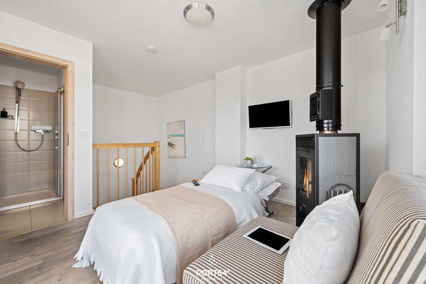 Im 2. Obergeschoss befindet sich das beeindruckende Studio der Wohnung. Mach es Dir auf den zwei Schlafsesseln (80x200?cm) gemütlich und lass Dich vom Flachbild-Fernseher unterhalten. Verdunkelungsmöglichkeiten und Insektenschutzgitter ermöglichen es Dir, hier gut zu schlafen. An den kälteren Tagen ist das Studio das Highlight der Strandvilla: Ein Kaminofen sorgt für wohlige Wärme. Angrenzend befindet sich die finnische Sauna mit Dusche. Der Balkon auf dieser Etage verspricht Dir einen tollen Blick auf die Schlei, die Schleimündung und auf das an das Resort angrenzende Naturschutzgebiet. Relax hier oben auf den Sonnenliegen oder lass Deinen Blick weiter schweifen über den Privatstrand und die Ostsee. Beobachte das bunte Treiben an Land und zu Wasser und verbringe traumhafte Stunden.