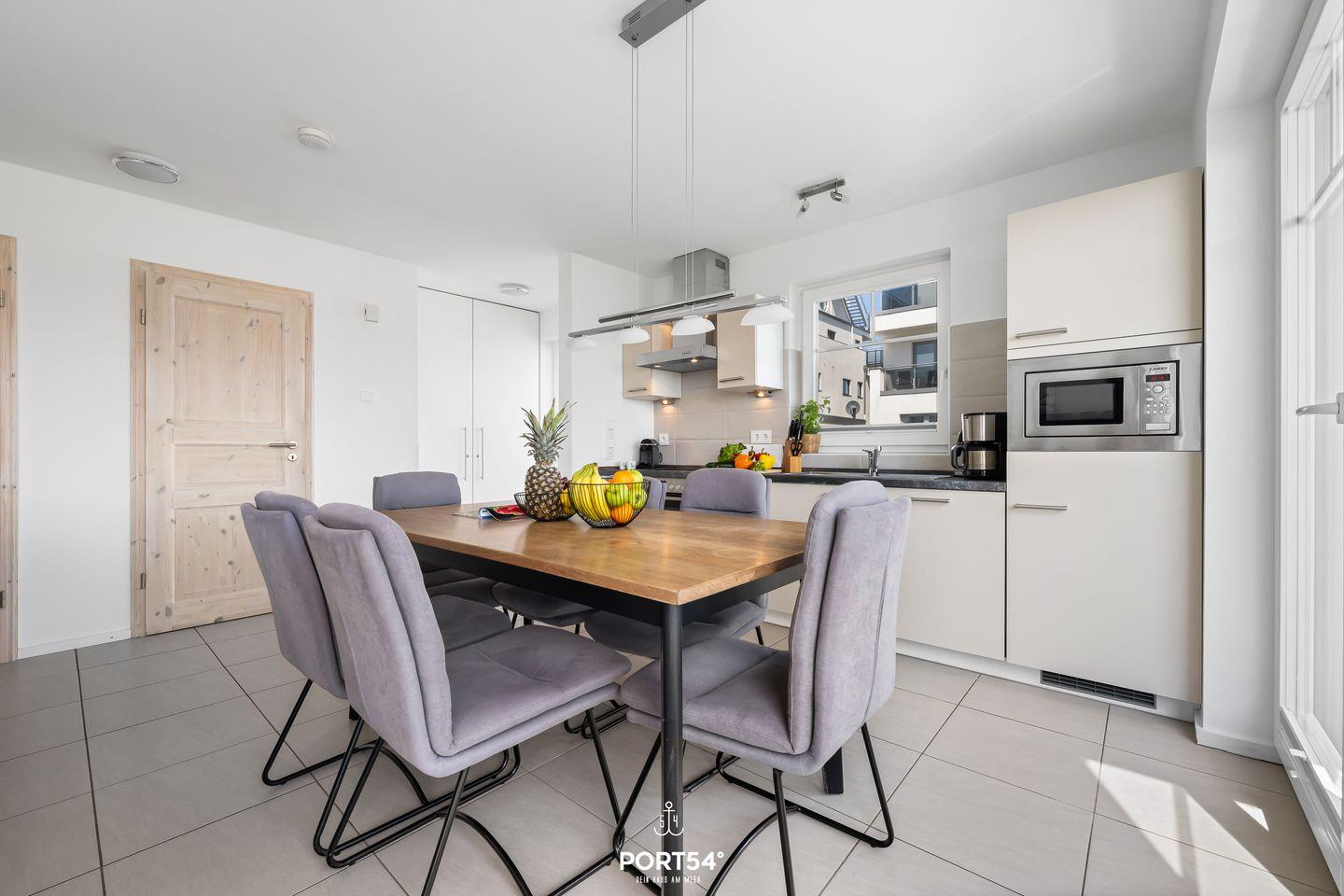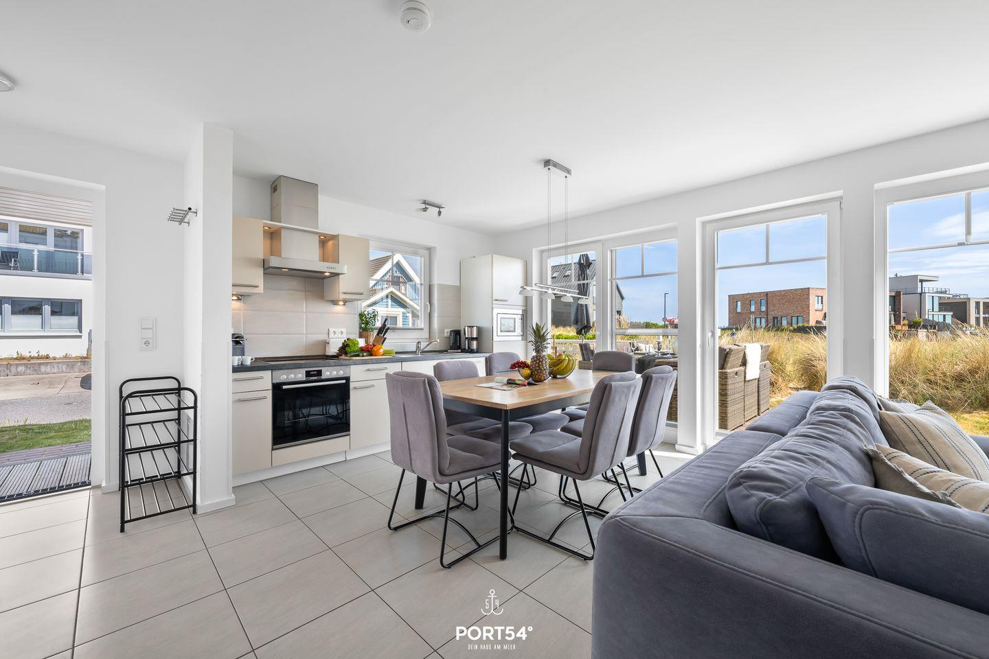 Im Erdgeschoss befindet sich der offene Wohn- und Essbereich. Mach es Dir auf dem Sofa bequem und lass Dich von einem spannenden Film auf dem Flachbild-Fernseher unterhalten. Ein Blu-Ray Player ist ebenfalls vorhanden. Die offene Küche ist voll ausgestattet. Von Espressomaschine über Eierkocher bis hin zum Toaster ermöglicht Dir die Küche, tolle Gerichte zuzubereiten. Genieße Dein Frühstück am Esstisch oder auf der möblierten Terrasse, die sich direkt am Strand befindet. Beim Blick auf den gepflegten Sandstrand und die Ostsee ist Urlaubs-Feeling garantiert. Stell Dir vor, wie Du tolle Grillabende unter einem Sonnenschirm beim Wellenrauschen verbringst. Im Erdgeschoss ist zudem ein Gäste-WC untergebracht.