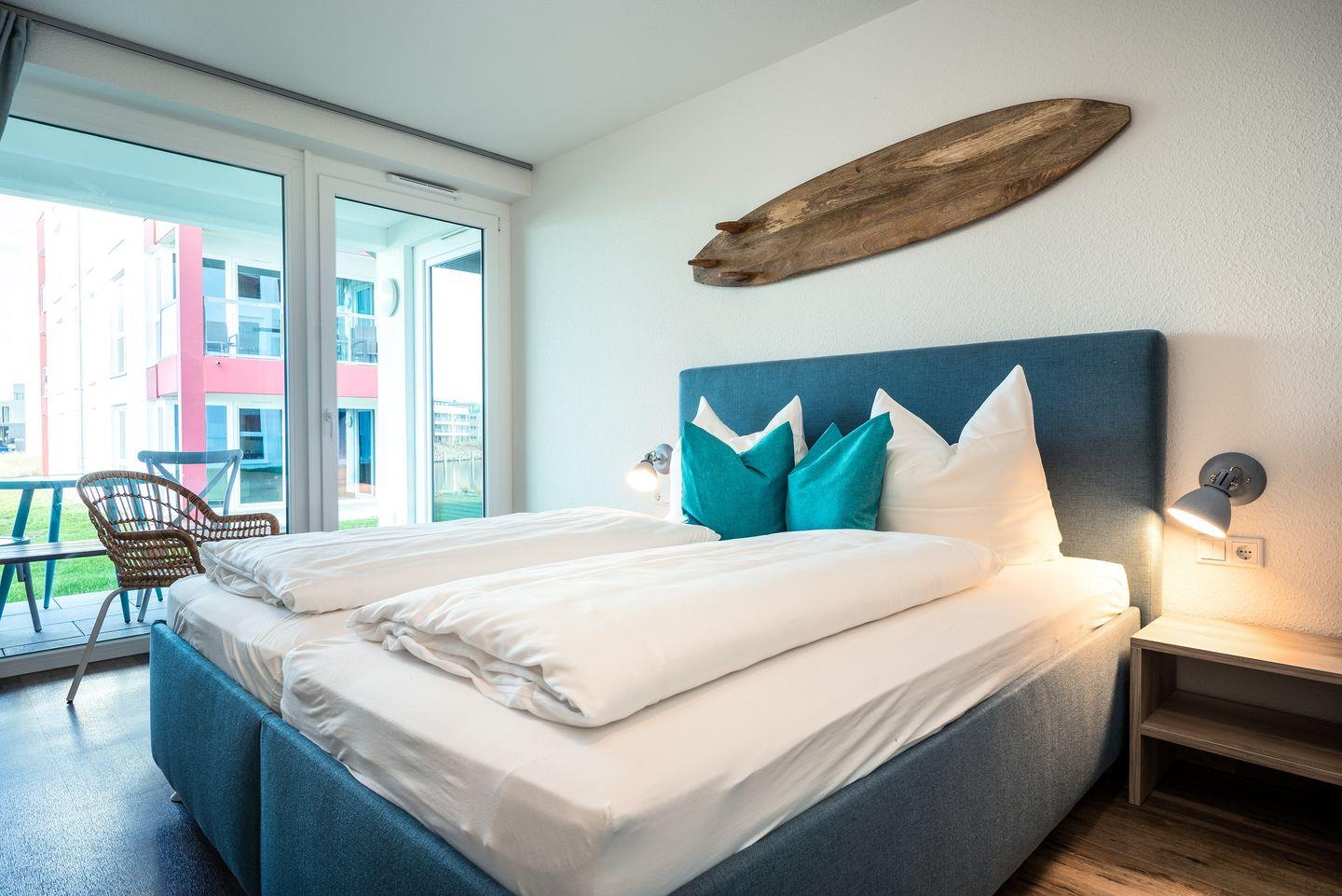 Das Schlafzimmer bietet ein bequemes Doppelbett (180 × 200 cm), in dem Du erholsam schlafen kannst. Das Zimmer ist zusätzlich mit einem Flachbild-TV, Kleiderschrank und Verdunkelungsmöglichkeiten ausgestattet. Das Schlafsofa (150 × 200 cm) im Wohnzimmer bietet 2 weiteren Personen eine Schlafmöglichkeit.