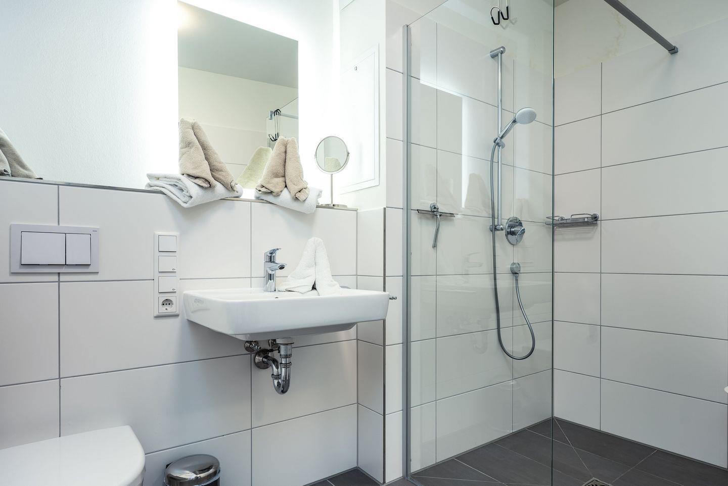 Das moderne Badezimmer verfügt über eine ebenerdige Dusche, einen Kosmetikspiegel, einen Handtuchheizkörper, einen Kindertritthocker und einen Föhn.