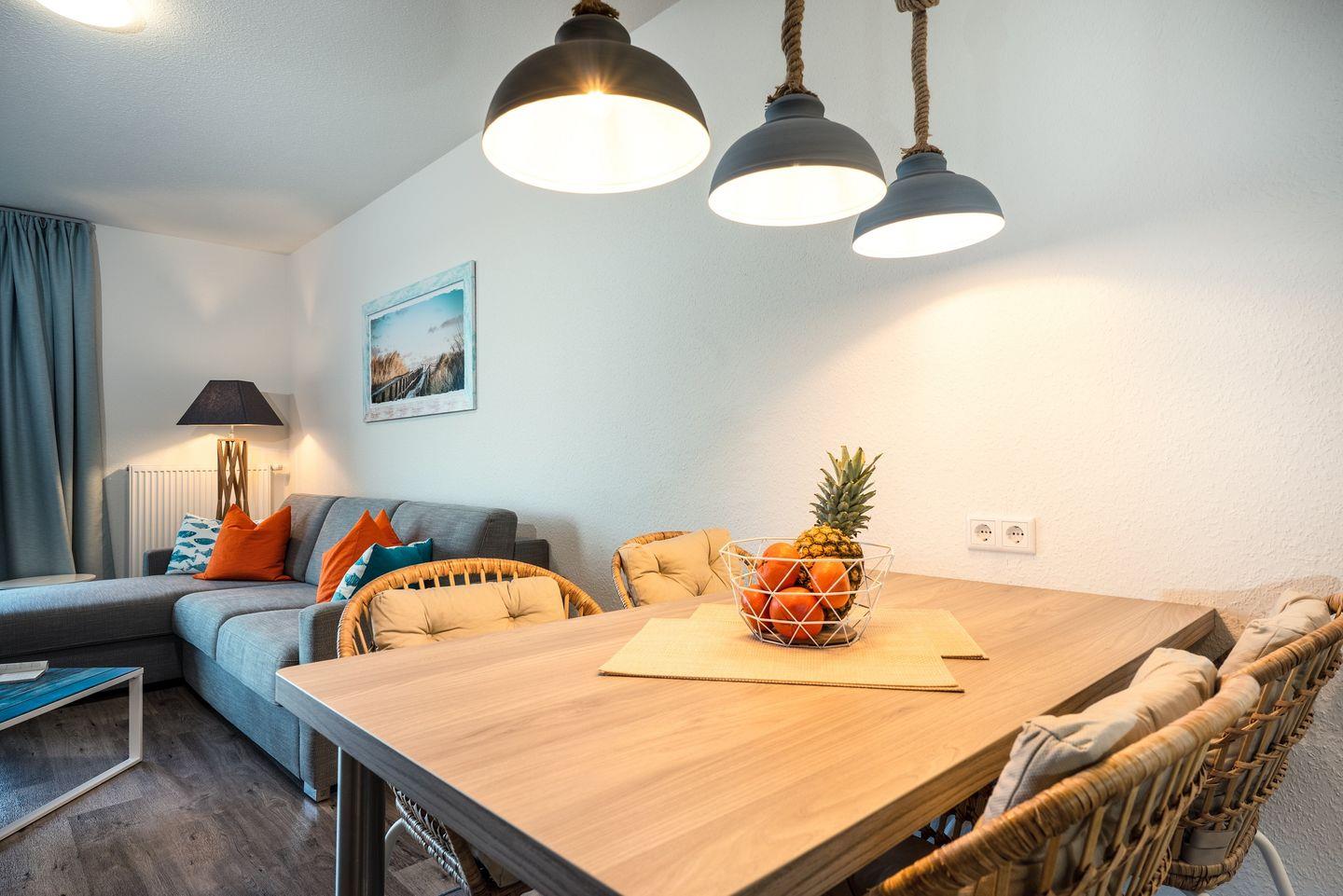Der Wohnbereich ist mit einem gemütlichen Sofa ausgestattet, und ein Flachbild-TV sowie ein Blu-ray-Player ermöglichen Dir entspannte Filmeabende. Direkt angrenzend findest Du die offene Küchenzeile mit Essbereich. Die Küche ist mit Eierkocher, Toaster und vielem mehr hervorragend ausgerüstet für die Zubereitung eines köstlichen Frühstücks oder Abendessens.