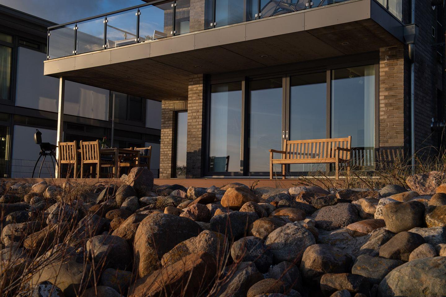 Ein Highlight der Ferienwohnung ist die großzügige, überdachte Terrasse, auf der Du beim Frühstück im Freien den Blick auf die Ostsee genießen kannst. Die Terrasse ist mit Gartenmöbeln und Sonnenliegen ausgestattet – ideal für entspannte Stunden im Freien.