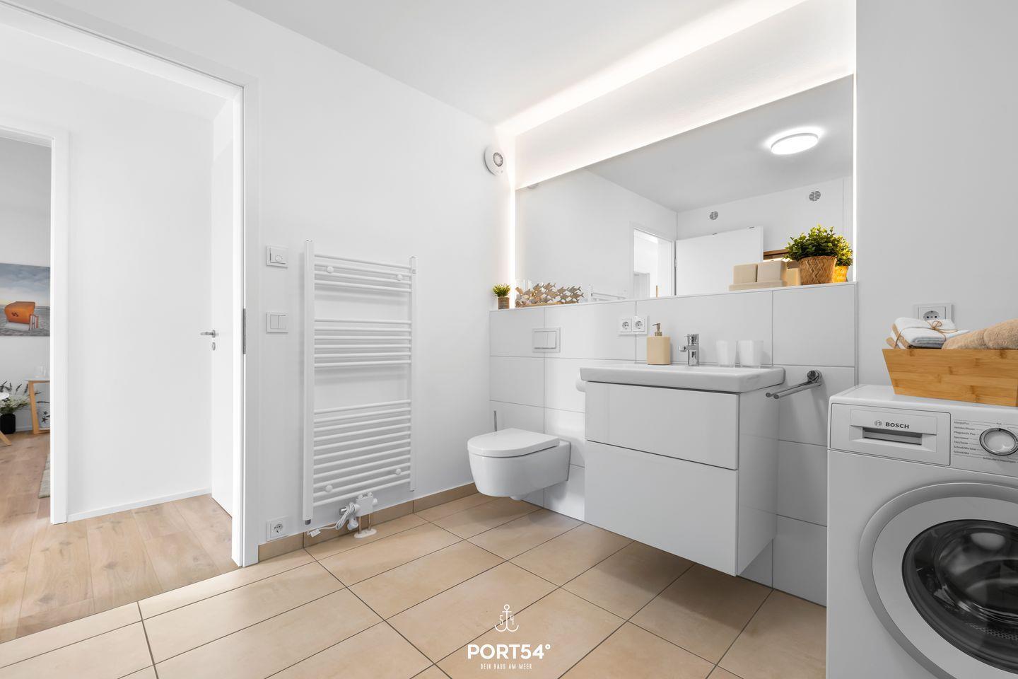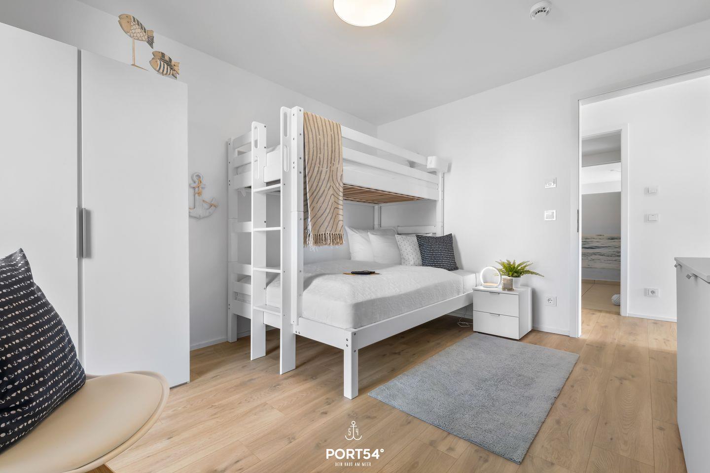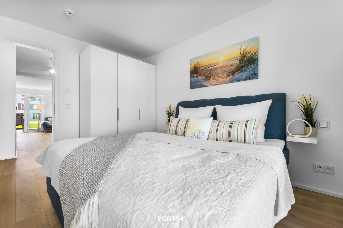 Die Wohnung verfügt über zwei Schlafzimmer. Das erste Schlafzimmer ist mit einem komfortablen Boxspringbett (180x200 cm) ausgestattet und bietet zusätzlich einen TV, sodass Sie sich auch im Bett entspannen können. Das zweite Schlafzimmer bietet mit einem Etagenbett Schlafmöglichkeiten für bis zu drei Personen – perfekt für Familien mit Kindern. Die Schlafräume sind lichtdurchflutet und garantieren durch Verdunklungsmöglichkeiten einen erholsamen Schlaf. Das moderne Duschbad ist ein weiteres Highlight der Wohnung. Es verfügt über eine hochwertige Ausstattung und bietet mit einer Infrarotsauna einen zusätzlichen Ort der Entspannung, ideal für erholsame Stunden nach einem Spaziergang an der Ostsee oder einem aktiven Tag in der Umgebung.