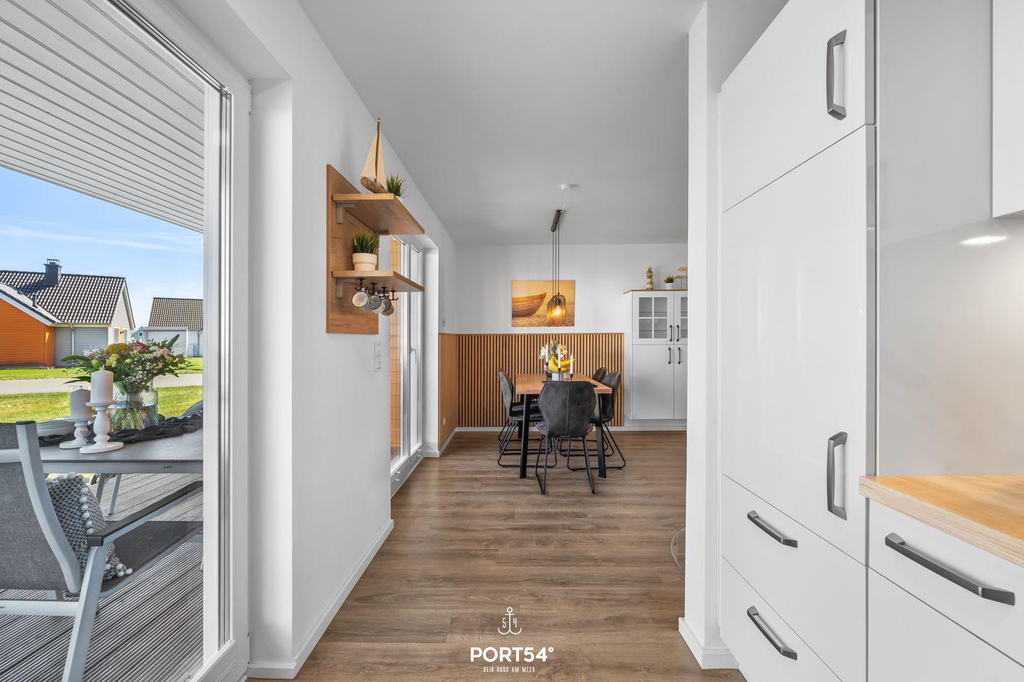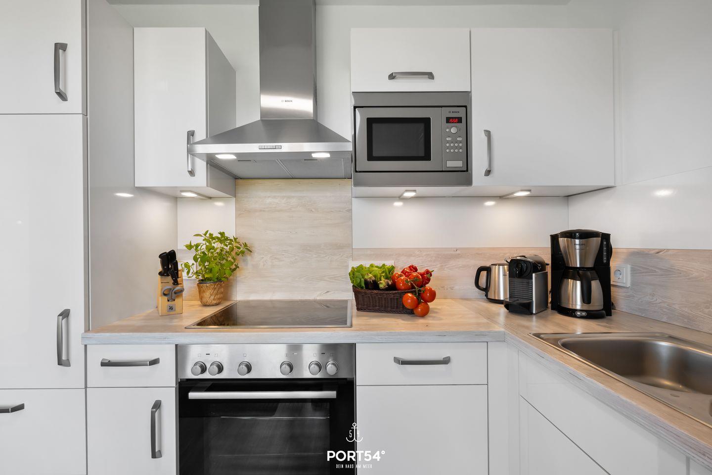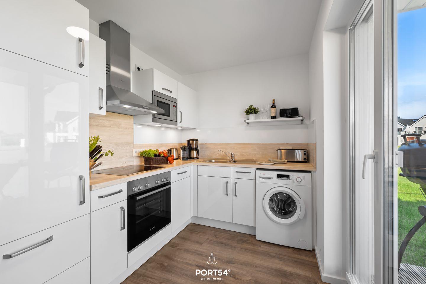 Die angrenzende offene Küche ist voll ausgestattet, sodass Dir während Deines Aufenthalts nichts fehlt, um leckere Gerichte zuzubereiten. Von der Küche und dem Essbereich aus gelangst Du auf die überdachte Terrasse. Hier kannst Du an der frischen Meeresluft frühstücken oder unvergessliche Grillabende am Elektro-Grill verbringen. Auf den Sonnenliegen lässt es sich hervorragend entspannen.