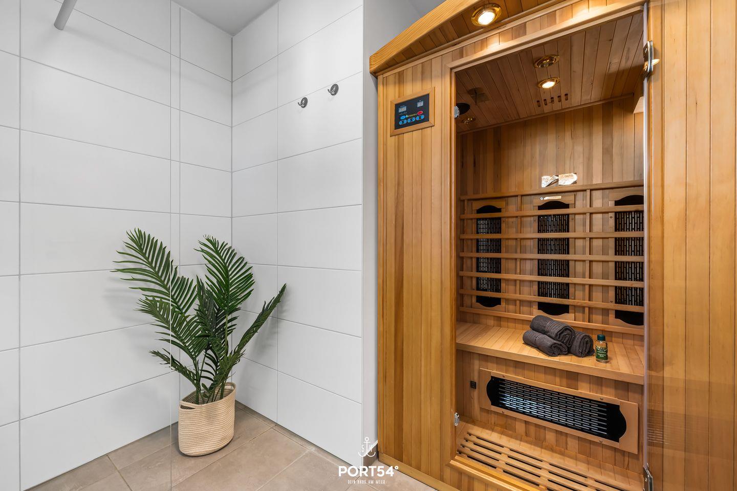 Die große Ferienwohnung „Nordisch 54“ bietet Dir Platz für 5 Personen und verfügt über einen gemütlichen Wohnbereich mit Kaminofen.Die offene Küche ist voll ausgestattet und die Terrasse lädt Dich zum Entspannen ein.Im Badezimmer erwarten Dich eine Infrarot-Sauna und eine ebenerdige Dusche. Zwei Schlafzimmer mit TV sorgen für Deinen Komfort.