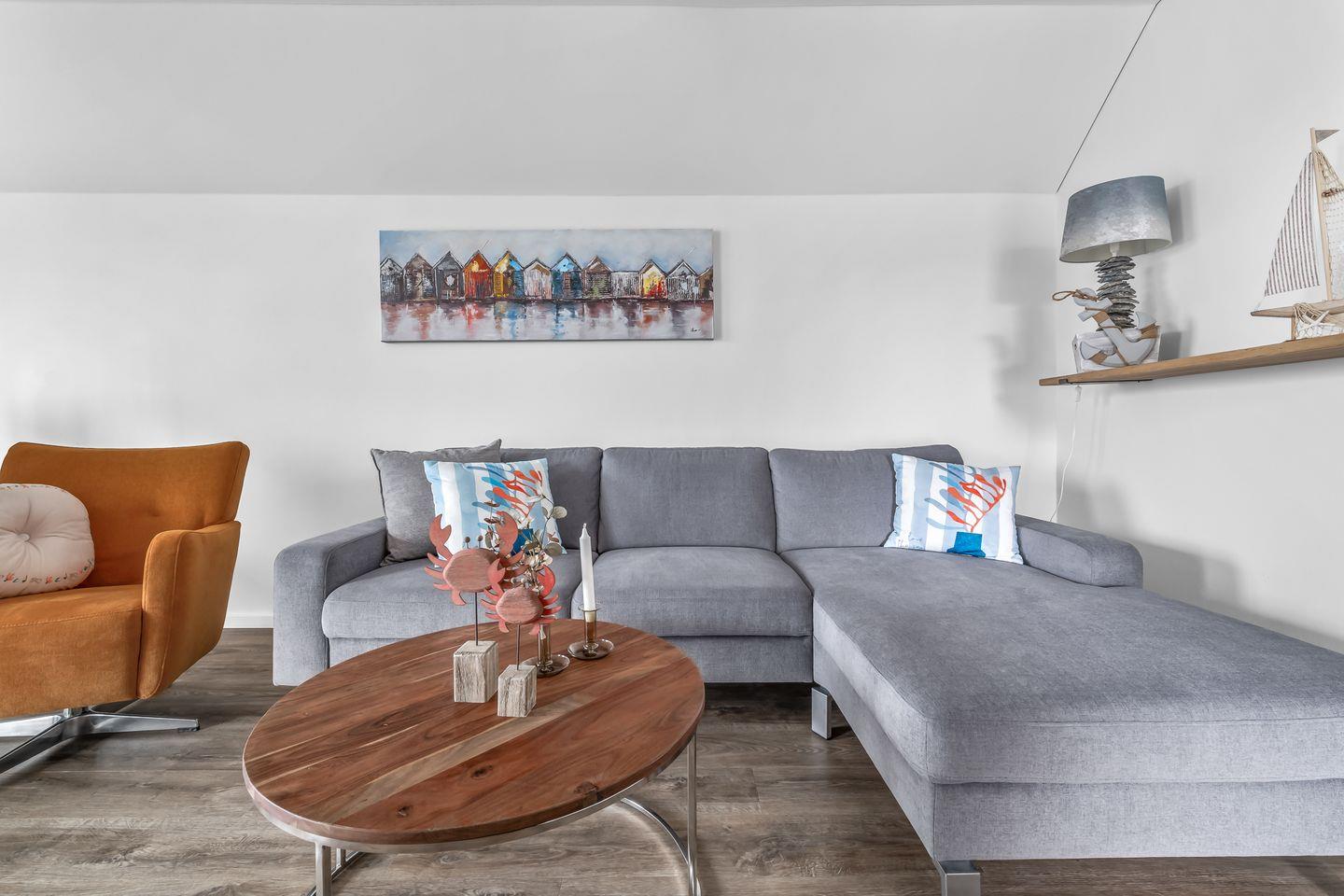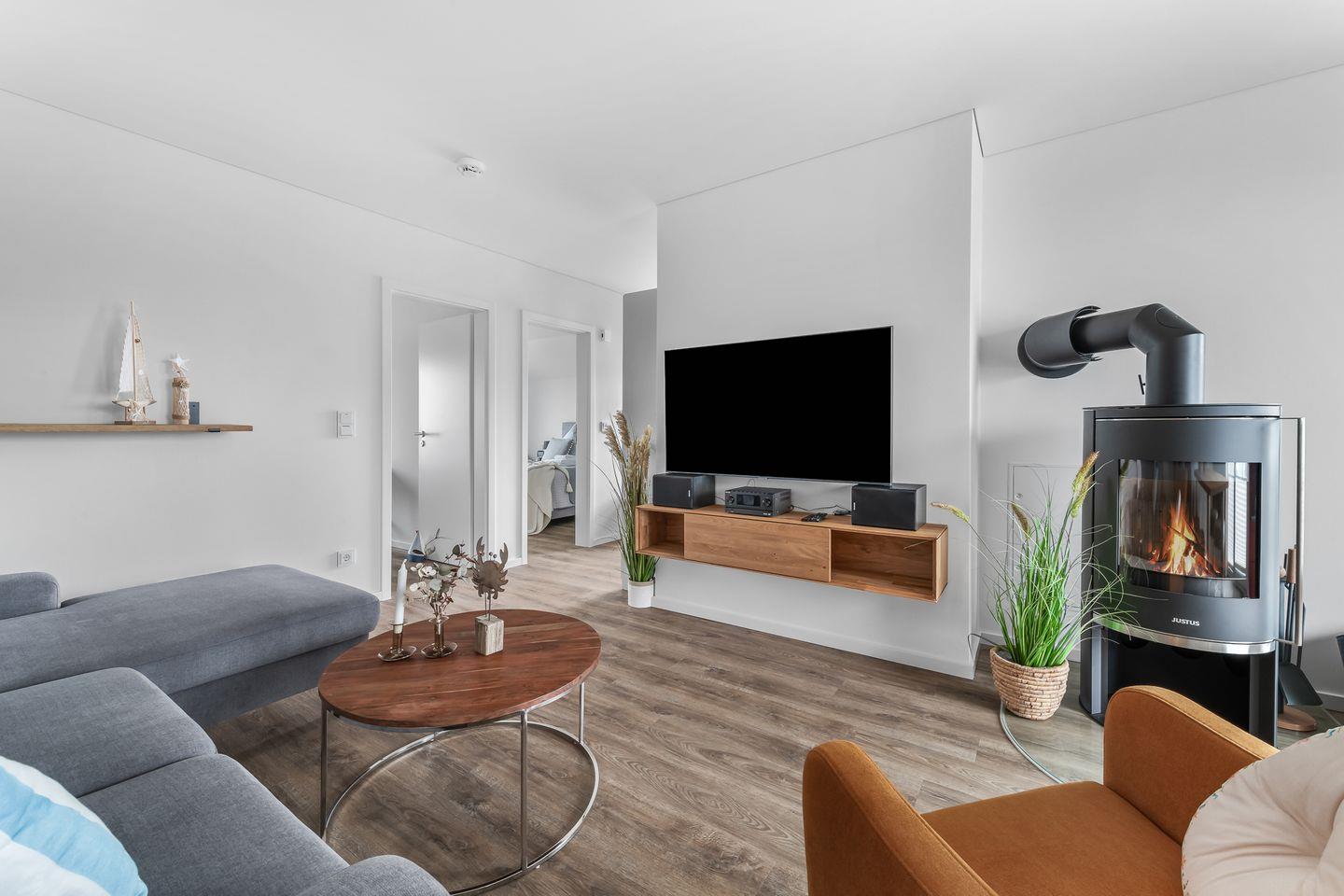 Moderne Ferienwohnung Sunset Suite in Olpenitz mit Sauna, Kamin und Strandkorb, ideal für erholsame Urlaubstage.