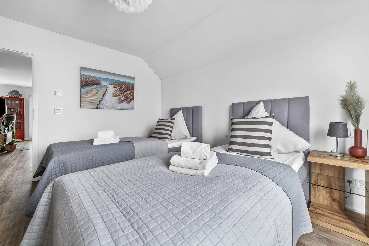 Eintreten und wohlfühlen. Diese Ferienwohnung bietet Platz für bis zu 4 Personen. "Sunset Suite" ist modern, stilvoll und sehr gemütlich, sie besticht durch zeitlose Eleganz und wurde mit viel Liebe zum Detail eingerichtet. Neben zwei Schlafzimmern, einem hellen und freundlichen Bad mit Infrarot-Sauna, einem sehr ansprechenden Wohn- und Essbereich, sowie einer vollausgestatteten Küche, bietet diese im Obergeschoss gelegene Wohnung einen voll möblierten Balkon. Das Wohnzimmer ist mit einer großzügigen Wohnlandschaft und einem großen Multimedia-Smart-TV eingerichtet - hyggelige Abende sind garantiert. Kostenfreies WLAN und Magenta-TV stehen Ihnen ebenfalls zur Verfügung. An kühleren Tagen sorgt ein Kaminofen für eine wohlige Wärme. In beiden Schlafzimmern finden Sie hochwertige Boxspringbetten. In einem Schlafzimmer befindet sich ein Doppelbett (180x200cm) und in dem anderen sind zwei Einzelbetten (90x200cm), die Sie jederzeit zu einem Doppelbett zusammenschieben können. Auch verfügen beide Schlafzimmer über Multimedia-Smart-TVs und einen Kleiderschrank. Verdunklungsmöglichkeiten sowie Fliegengitter ermöglichen Ihnen eine angenehme Nachtruhe. Die Küche ist von der Nespresso-Maschine über den Wasch-Trockner bis hin zur Spülmaschine mit allen erdenklichen, modernen Annehmlichkeiten ausgestattet. Kochen und backen machen hier wirklich Spaß. Das lichtdurchflutete Bad bietet Ihnen eine große, ebenerdige Dusche, einen Kosmetikspiegel, einen Föhn und einen Handtuchheizkörper. Für Wellnessfeeling sorgt die eingebaute Infrarot-Sauna mit Soundanlage. Der Balkon lädt zum Chillen ein und der hochwertige Elektrogrill lässt auch Grillfreunde auf Ihre Kosten kommen. Auf dem Balkon können Sie den Tag in Ruhe ausklingen lassen und die schönen Sonnenuntergänge im Strandkorb genießen. Für gesellige Abende mit Freunden oder der Familie steht Ihnen ein Elektro-Grill zur Verfügung. Für unsere kleinen Gäste stehen ein Kinderreisebett, ein Hochstuhl und ein Kindertritthocker bereit. Direkt vor der Unterkunft befinden sich 2 kostenfreie Parkplätze und ein abschließbarer Fahrradschuppen.