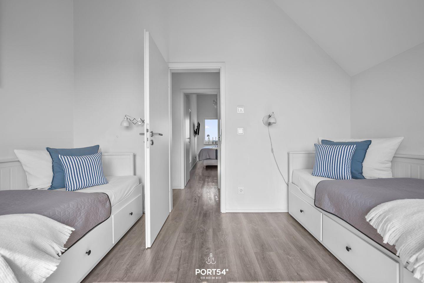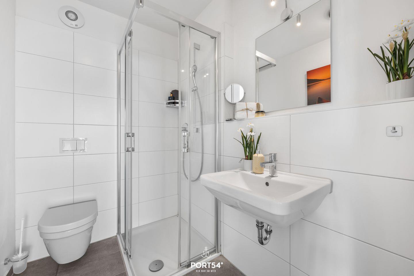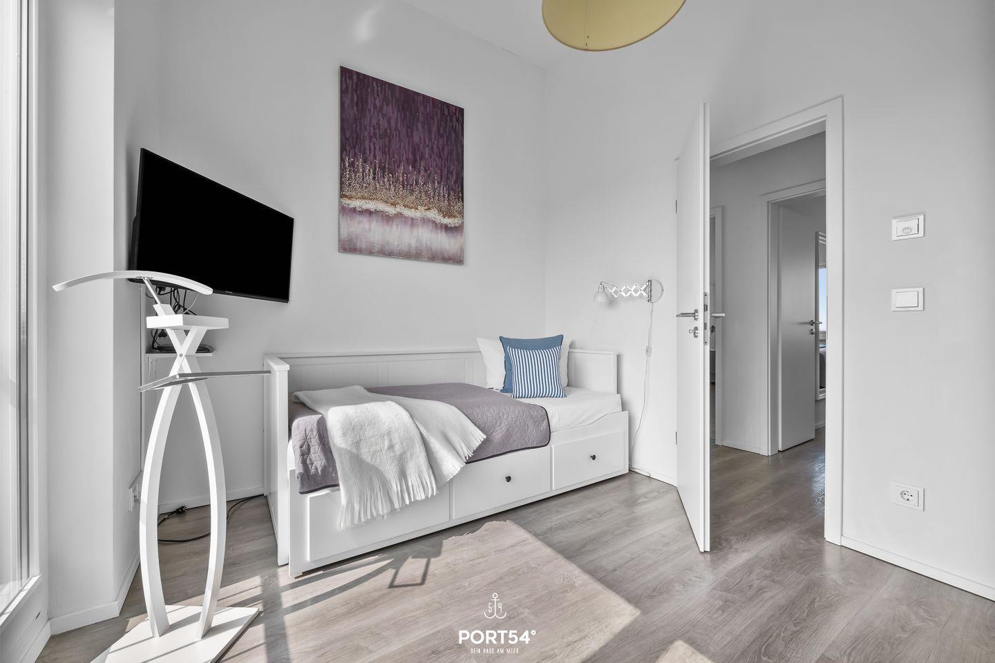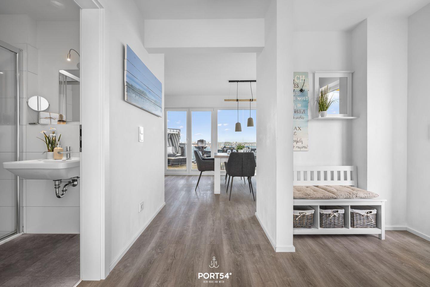 Willkommen in der Ferienwohnung "But Meere" im OstseeResort Olpenitz – Ihrem perfekten Rückzugsort an der Ostsee! Diese großzügige und moderne Ferienwohnung bietet Ihnen auf 100 m² alles, was Sie für einen erholsamen Urlaub benötigen. Die Wohnung erstreckt sich über zwei Etagen und beinhaltet zwei gemütliche Schlafzimmer und zwei Badezimmer. Jedes Schlafzimmer ist stilvoll eingerichtet und sorgt dank Verdunkelungsmöglichkeiten für eine entspannte Nachtruhe. In dem einen Schlafzimmer ist ein komfortables Boxspring-Doppelbett (180x200cm), ein Kleiderschrank und ein Flachbild-Fernseher zu finden. Das zweite Schlafzimmer ist mit zwei Einzelbetten (80x200cm), einer Kommode und ebenfalls mit einem Flachbild-Fernseher ausgestattet. Das Bad im 1. Obergeschoss verfügt über eine Dusche und einen Kosmetikspiegel. Während das Badezimmer im 2. Obergeschoss Sie mit einer Whirlwanne verwöhnen wird – perfekt, um nach einem langen Tag am Strand abzuschalten. Zusätzlich lädt die Infrarot-Sauna hier zu entspannten Stunden ein. Auch ein Kosmetikspiegel, ein Föhn, ein Handtuchheizkörper und auch eine Waschmaschine sind hier zu finden. Mit einer offenen Küche, die zum Wohnbereich übergeht, können Sie Ihre Kochkünste ausleben und anschließend die gemeinsamen Mahlzeiten am Esstisch genießen. Die moderne Ausstattung verfügt über alles, was das Herz begehrt, einschließlich einer Spülmaschine, einer Mikrowelle und einer Espressomaschine – ideal für die ersten Kaffeestunden am Morgen. Der helle Wohnbereich lädt zum Entspannen ein, mit einer bequemen Couch und einem Kaminofen, der an kühleren Abenden für Wohlfühlatmosphäre sorgt. Genießen Sie entspannte TV-Abende auf dem Sofa oder lassen Sie den Tag auf dem Balkon im Strandkorb bei einem Glas Wein ausklingen. Der Außenbereich der Unterkunft verfügt zudem über Gartenmöbel und einen Elektro-Grill, perfekt für gesellige Grillabende mit der Familie oder Freunden. Genießen Sie die Aussicht auf das Hafenbecken und die Marina des Resort. Die Ferienwohnung ist kinderfreundlich und bietet dementsprechende Ausstattung, einschließlich eines Hochstuhls und eines Babybetts. Haustiere sind ebenfalls willkommen, sodass die ganze Familie, einschließlich der vierbeinigen Freunde, einen traumhaften Urlaub genießen kann. Ein Parkplatz befindet sich vor der Unterkunft. Ihre mitgebrachten oder im Tourguide ausgeliehenen Fahrräder können Sie bequem im abschließbaren Fahrradschuppen unterstellen.