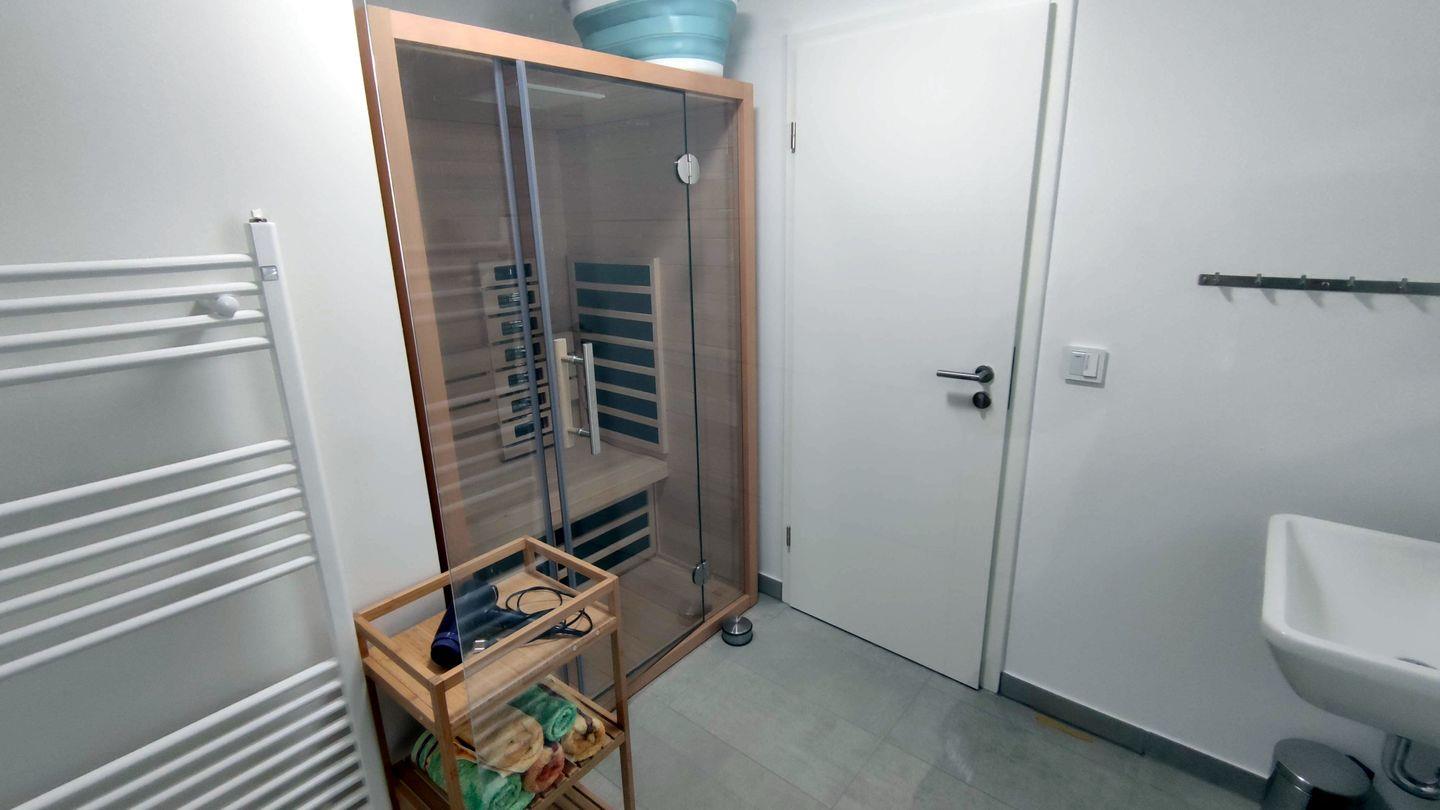 Erlebe Wellness pur im Badezimmer. Die Infrarot-Wärmekabine garantiert Dir wohlverdiente Stunden der Entspannung. Nach einem Tag voller Aktivitäten kannst Du hier neue Energie tanken und Dich vom Alltag erholen. Zudem bietet Dir das Bad eine ebenerdige Dusche, einen Handtuchheizkörper, einen Kosmetikspiegel und einen Föhn.