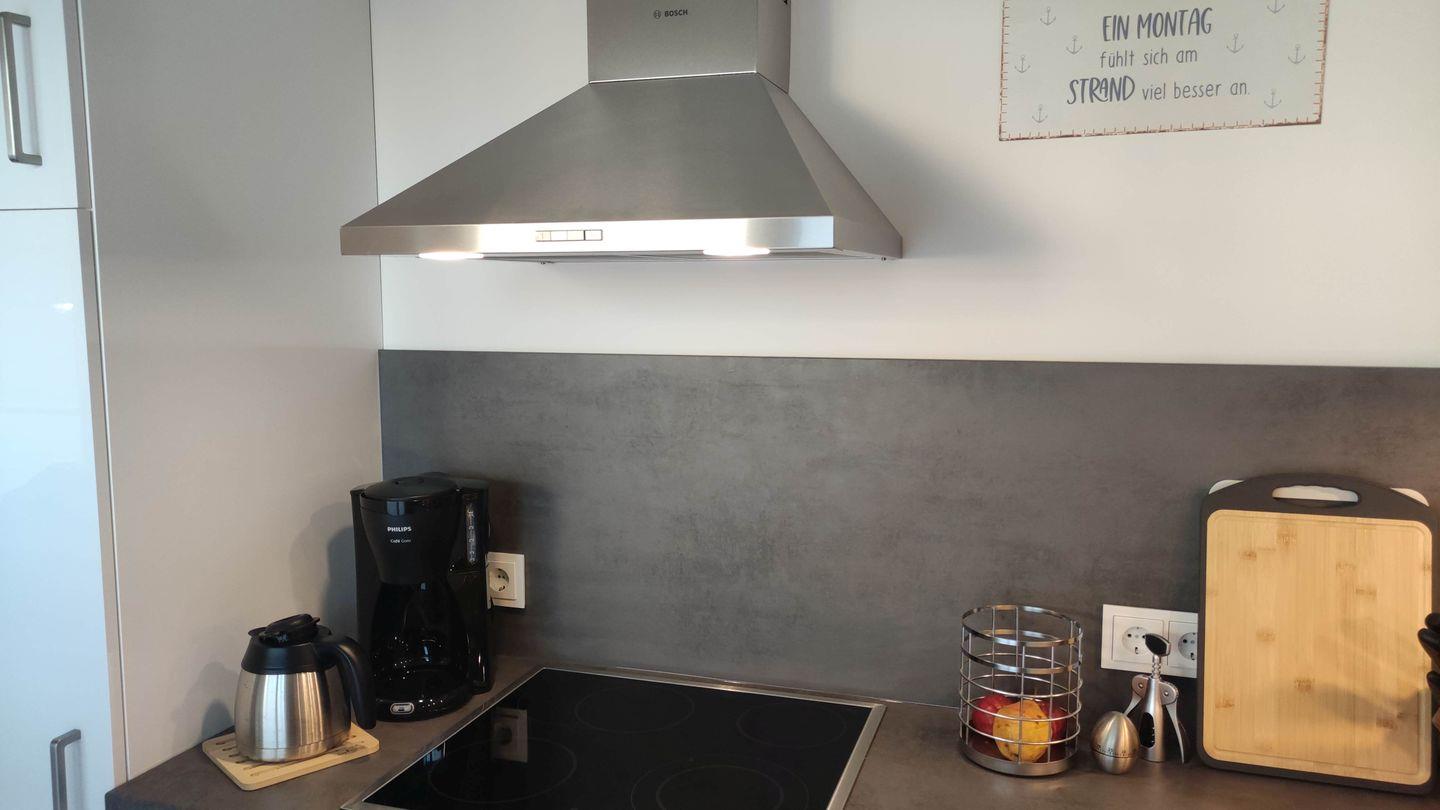 Im offenen Wohnbereich kannst Du es Dir ideal auf dem Sofa gemütlich machen und einen unterhaltsamen Film auf dem Flachbild-Fernseher schauen, während Du an kälteren Tagen vom Kaminofen gewärmt wirst. Am Esstisch kannst Du hervorragend Spieleabende mit den hauseigenen Spielen verbringen. Angrenzend befindet sich die voll ausgestattete Küche, in der Du kulinarische Köstlichkeiten zaubern kannst. Die moderne Küche bietet Dir alles, was Du für Deinen Aufenthalt benötigst – von der Nespresso-Espressomaschine bis hin zum Eierkocher – sodass Du keinen Komfort missen musst. Auch die Waschmaschine ist hier untergebracht.