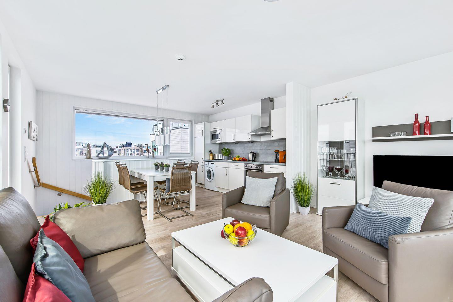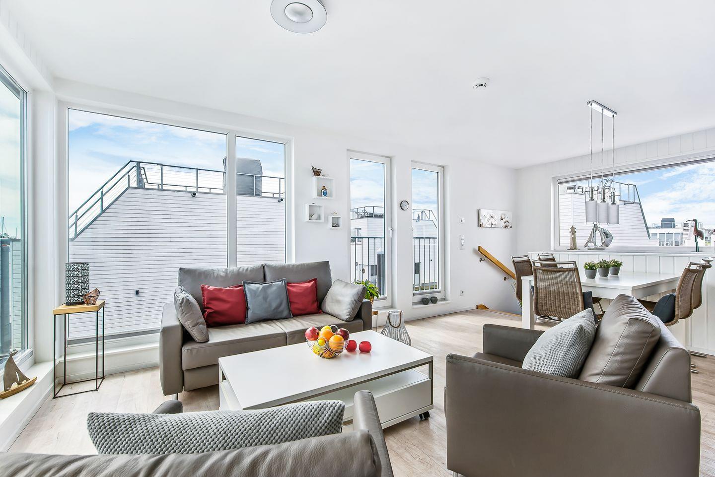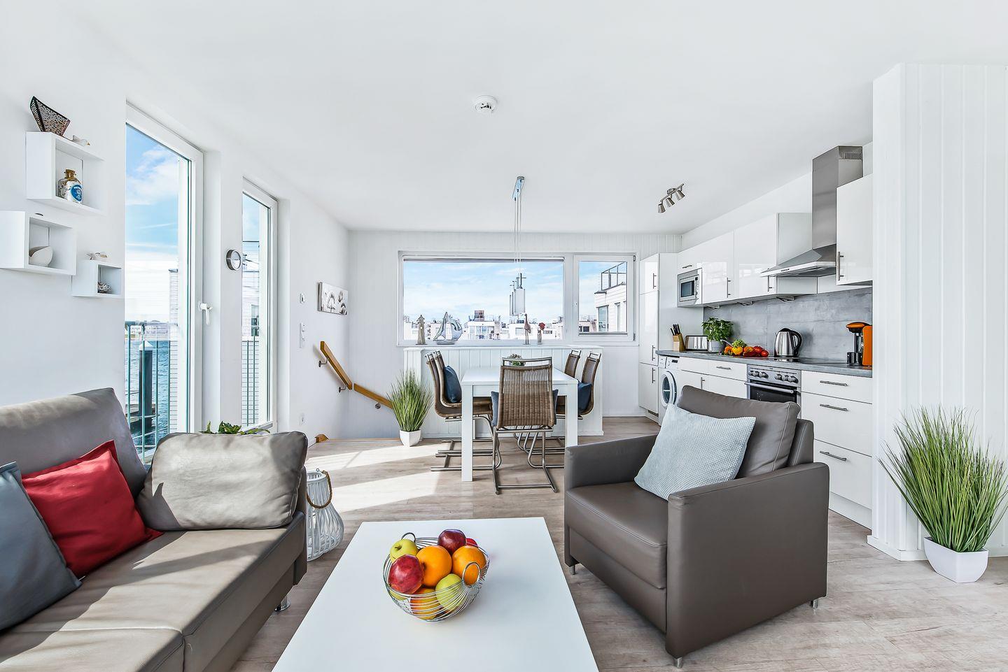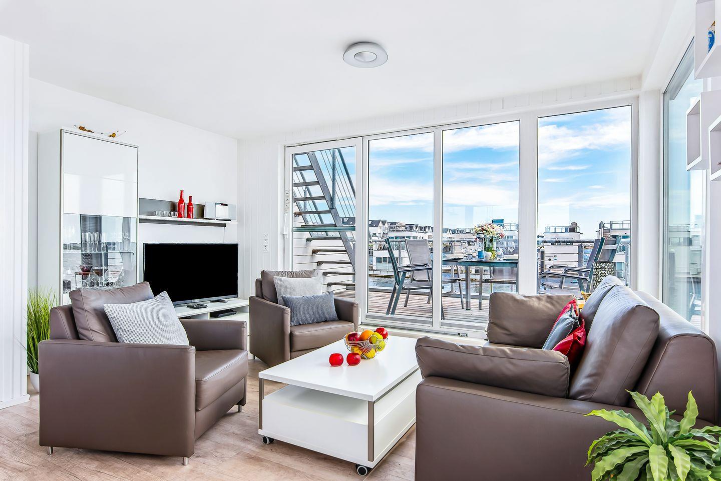 Die gemütliche Sitzecke im Wohnzimmer lädt Dich zum Entspannen ein, während der Smart-TV auch bei nordischem Schietwetter für Unterhaltung sorgt.