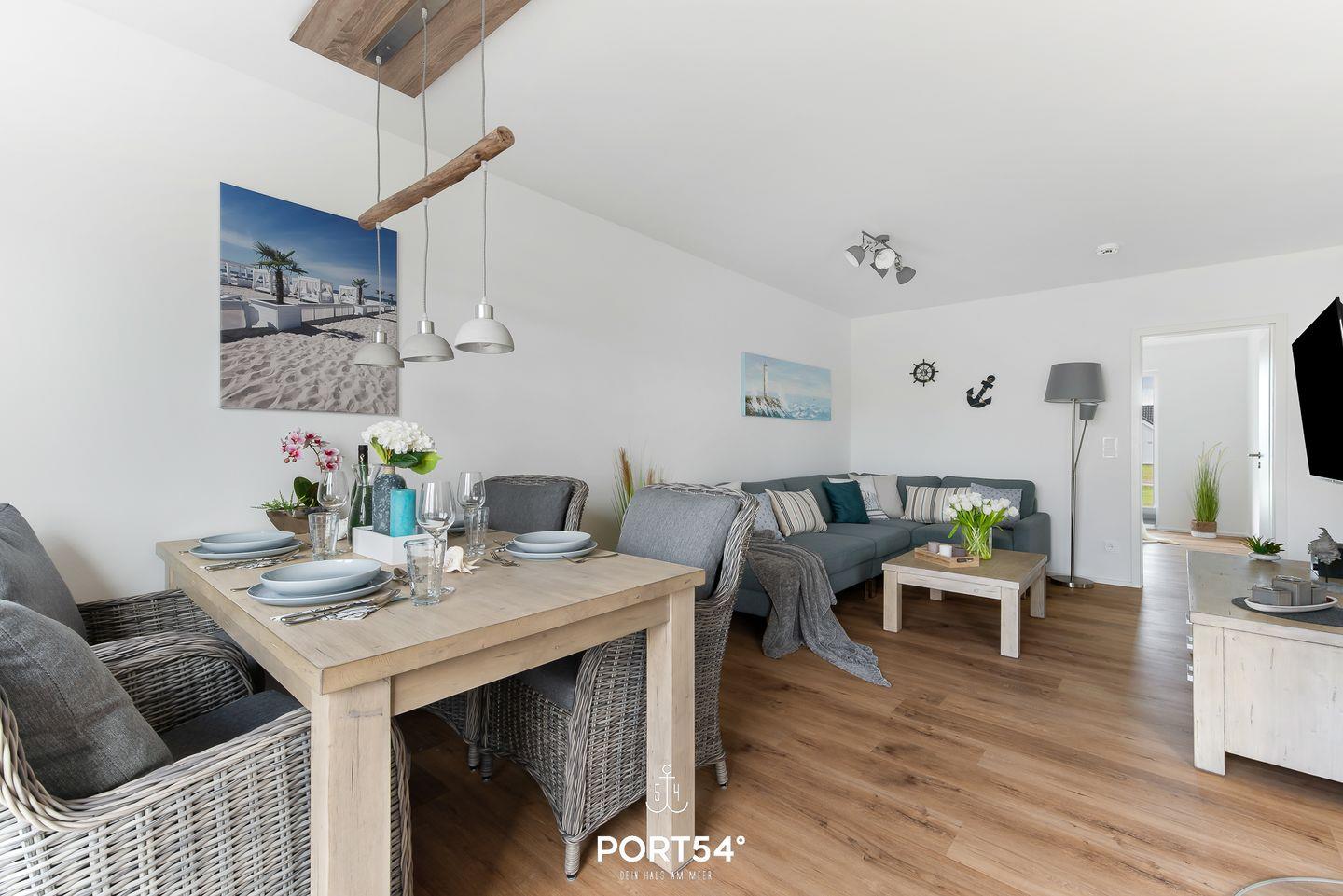 Das Ferienhaus "Wiedeblick" begrüßt Sie in erstklassiger Lage direkt im OstseeResort Olpenitz und bietet ideale Voraussetzungen für einen erholsamen wie abwechslungsreichen Aufenthalt. Im Erdgeschoss gelegen erwartet Sie ein modernes und hochwertig eingerichtetes Ferienhaus, das mit einer tollen Ausstattung komfortable Rückzugsorte für Paare, Familien oder kleine Reisegruppen bis zu fünf Personen schafft. Der großzügige Wohn- und Essbereich überzeugt durch seine offene Gestaltung und wird durch die bodentiefen Fenster mit viel Tageslicht versorgt. Im Wohnzimmer lädt ein gemütliches Sofa zum Entspannen ein, während der Kaminofen an kühleren Tagen für wohlige Wärme sorgt und eine besondere Atmosphäre schafft. Zur Unterhaltung steht ein Fernseher bereit sowie verschiedene Gesellschaftsspiele, sodass auch bei weniger gutem Wetter für Abwechslung gesorgt ist. Die offene Wohnküche ist umfassend ausgestattet und lässt keine Wünsche offen: Neben einem Ceranherd, einem Backofen und Geschirrspüler stehen eine Nespresso-Espressomaschine, Wasserkocher, Toaster sowie vielfältige Küchenutensilien zur Verfügung. Am großen Esstisch können Sie Ihre Mahlzeiten gemeinsam genießen. Das Ferienhaus verfügt über zwei separate Schlafzimmer, die mit hochwertigen Doppel- bzw. Einzelbetten und Verdunklungsmöglichkeiten zum erholsamen Schlaf einladen. Für die kleinsten Gäste stehen ein Babybett und ein Kinderhochstuhl sowie ein Tritthocker bereit, sodass Familien hier besten Komfort vorfinden. Im modern eingerichteten Badezimmer befinden sich eine bodengleiche Dusche, ein WC, ein Waschbecken mit Spiegel sowie ein Kosmetikspiegel und ein Haartrockner. Die Fußbodenheizung sorgt ganzjährig für angenehme Temperaturen. Genießen Sie hier entspannende Stunden in der hauseigenen Infrarotkabine, die exklusiv für Sie zur Verfügung steht. Ein Ganzkörperspiegel steht für Sie ebenfalls bereit. Waschmaschine, Bügelbrett und Bügeleisen ermöglichen Ihnen eine unabhängige Haushaltsführung. Die private Terrasse ist mit Gartenmöbeln, einem Strandkorb und einem Elektrogrill ausgestattet – ideal für erholsame Stunden im Freien oder ein gemeinsames Essen an lauen Sommerabenden. Hier ist eine Rasenfläche zur Mitnutzung angrenzend. Der kostenfreie Privatparkplatz direkt am Haus garantiert einen entspannten Start in den Urlaub. Der Strand befindet sich nur einen kurzen Spaziergang entfernt. Aktive Gäste finden zahlreiche Sport- und Freizeitangebote in der näheren Umgebung, darunter Angeln, Wassersport, Nordic Walking oder auch Radfahren. Ob als Ausgangspunkt für ausgedehnte Spaziergänge am Meer, tolle Radtouren oder für pure Entspannung: Das Ferienhaus "Wiedeblick" bietet Ihnen perfekte Voraussetzungen für einen abwechslungsreichen Urlaub. Sichern Sie sich Ihren Aufenthalt in diesem Ferienhaus und erleben Sie gelungene Urlaubstage an der Ostsee.