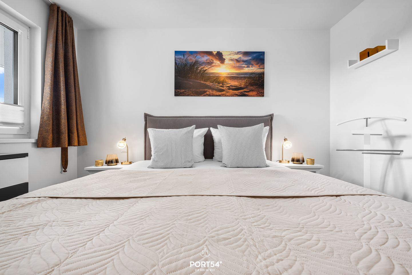 Das Schlafzimmer ist mit einem Doppel-Boxspringbett (160x200cm) ausgestattet und bietet Dir dank Verdunkelungsmöglichkeiten hohen Schlafkomfort für erholsame Nächte. Für Familien mit Kleinkindern stehen Dir ein Babybett und ein Kinderhochstuhl bereit. Die Fenster sind mit Sichtschutz versehen, sodass Du Deine Privatsphäre genießen kannst.