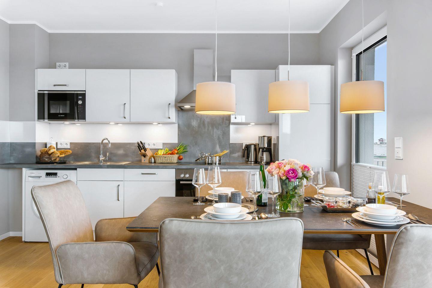 Mit zwei Schlafzimmern und insgesamt drei Zimmern eignet sich dieses Domizil sowohl für Paare als auch für Familien mit Kindern oder kleine Reisegruppen. Die Ferienwohnung ist voll ausgestattet und überzeugt durch ihre offene, zum Wohnzimmer hin gestaltete Küche. Diese ist umfassend eingerichtet mit Cerankochfeld, Backofen, Mikrowelle, Kühlschrank mit Gefrierfach, Spülmaschine, Toaster, Wasserkocher, Nespresso-Espressomaschine und Kaffeemaschine sowie sämtlichen notwendigen Küchenutensilien, Geschirr und Besteck.