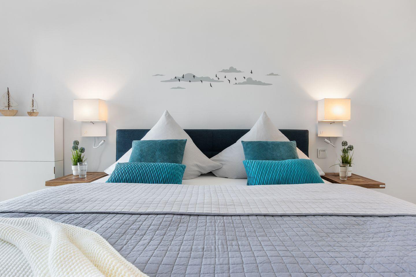 In einem Schlafzimmer befinden sich ein Boxspring-Doppelbett (180x200cm), in dem anderen findest Du zwei gemütliche Einzel-Boxspringbetten, die einfach zu einem Doppelbett zusammengeschoben werden können.