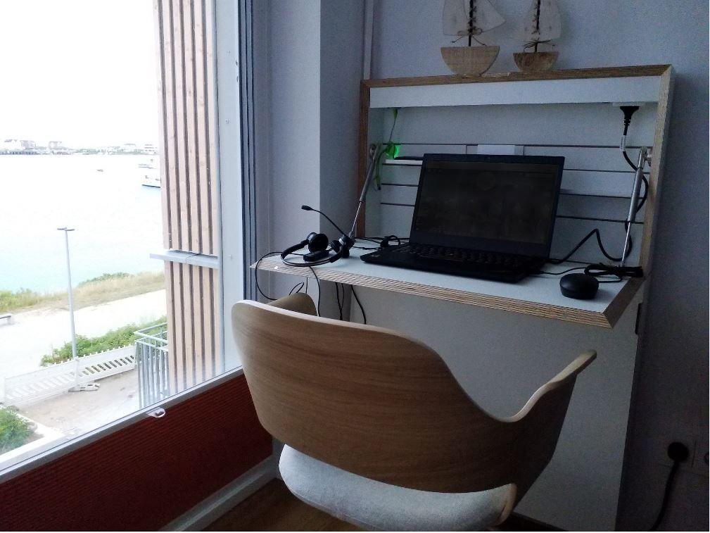 Dank des Schreibtisches im Schlafzimmer ist in der Wohnung auch mobiles Arbeiten möglich – und das sogar mit Blick auf den Hafen.
