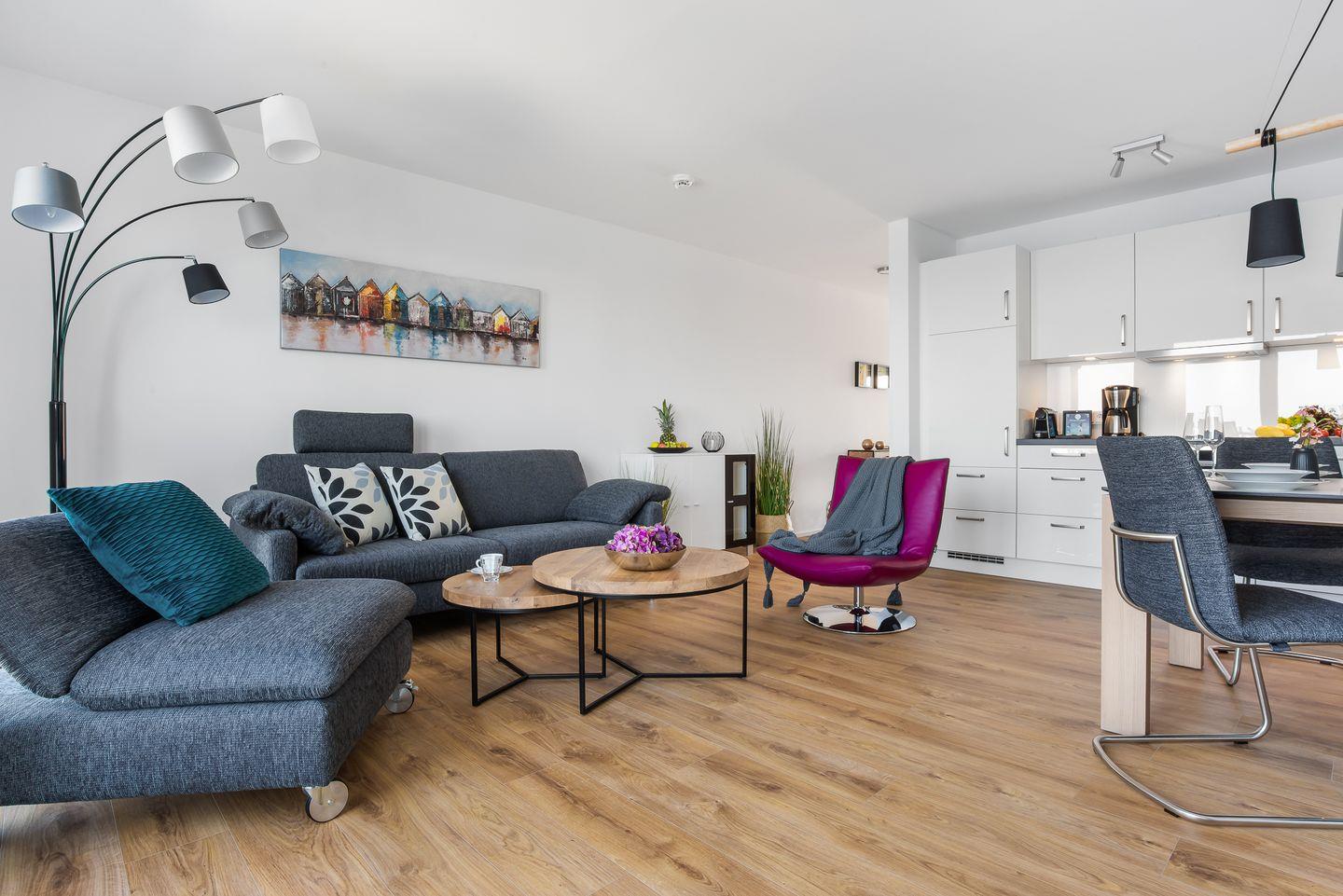 Das offene Wohn- und Esszimmer bildet das Herzstück der Unterkunft: Hier erwarten Dich ein komfortables Sofa, ein Sessel sowie ein moderner Essbereich mit Esstisch.
