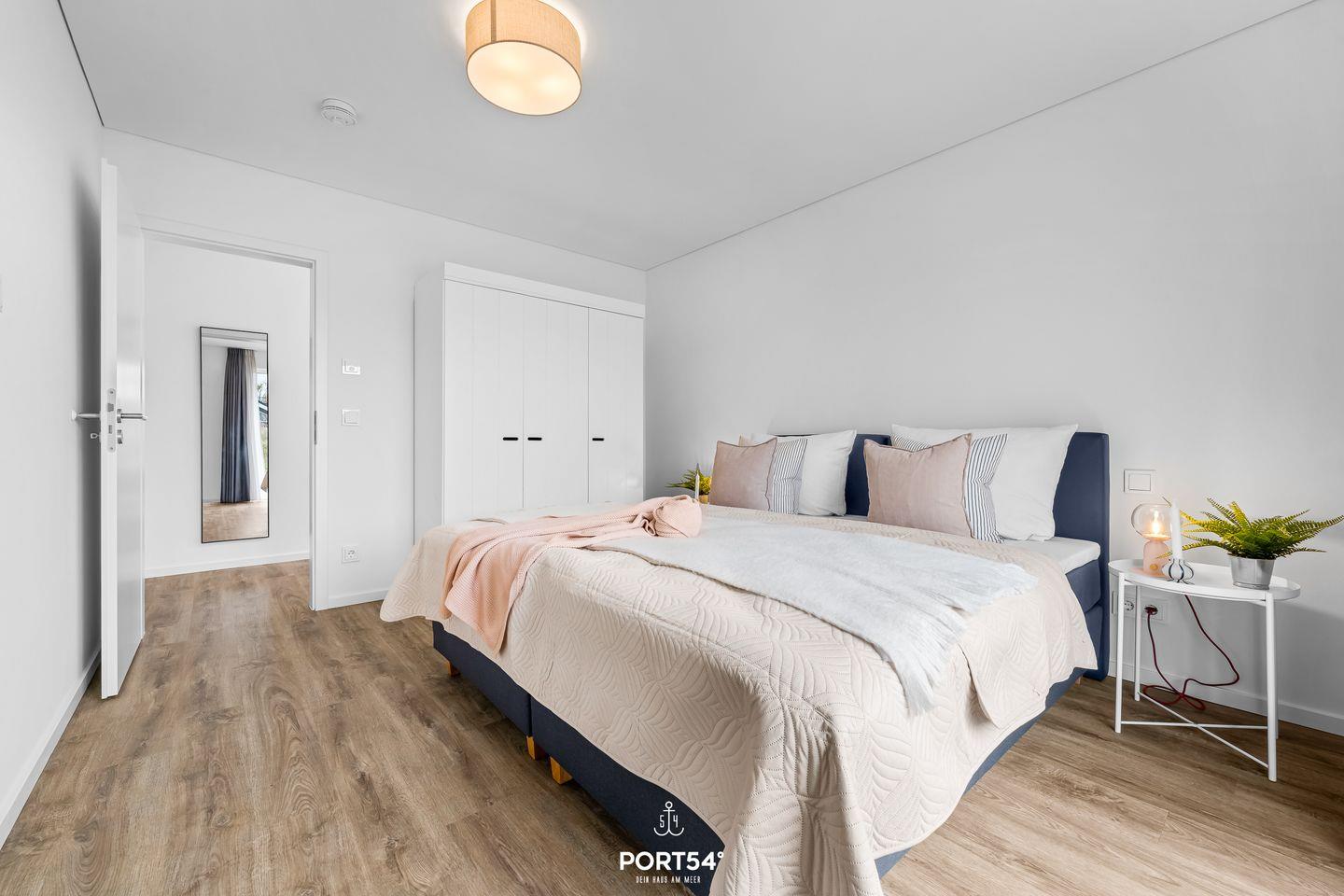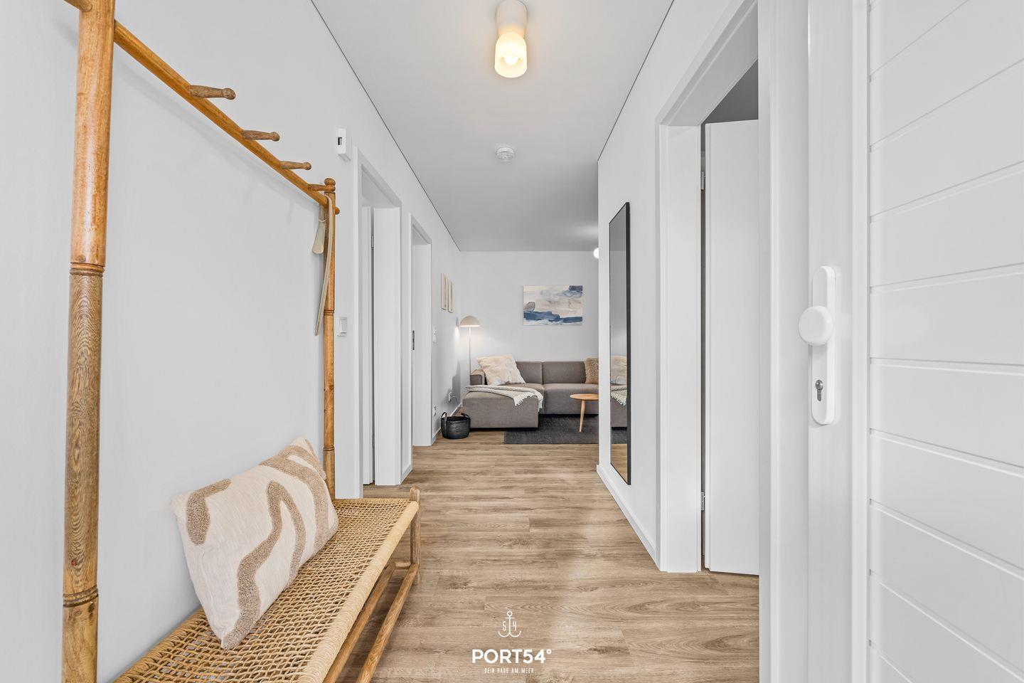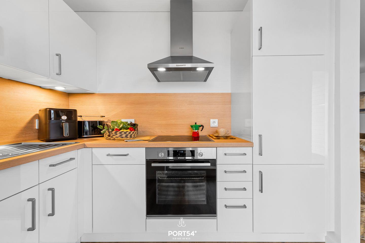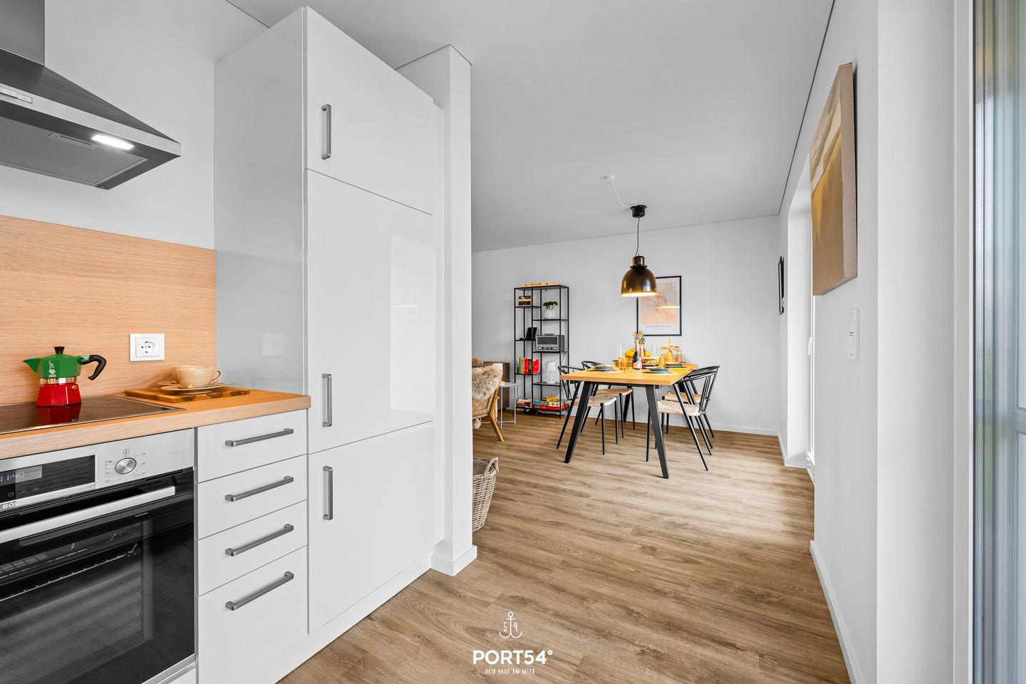 Die im Jahr 2025 fertiggestellte Unterkunft befindet sich im Erdgeschoss einer Ferienanlage und verfügt über drei Zimmer, die sich ideal für bis zu vier Personen eignen. Dank der geschickten Raumaufteilung findest Du hier beste Voraussetzungen für einen erholsamen Aufenthalt, egal ob Du als Familie, Paar oder kleine Reisegruppe anreist. Der offen gestaltete Wohn- und Essbereich bildet das Herzstück der Wohnung. Die hochwertige, moderne Einbauküche ist offen zum Wohnzimmer angelegt und lässt hinsichtlich Ausstattung keine Wünsche offen. Dir stehen ein Induktionsherd, ein Backofen, ein Kühlschrank mit integriertem Gefrierfach, eine Spülmaschine, eine Heißluftfritteuse, eine Mikrowelle, eine Kaffeemaschine, ein Wasserkocher, ein Toaster, ein Mixer sowie sämtliche Küchenutensilien und Geschirr zur Verfügung. Für gemeinsames Kochen und genussvolles Essen sorgt der Esstisch im Essbereich. Die Fußbodenheizung gewährleistet Dir auch in der kühleren Jahreszeit angenehme Temperaturen.