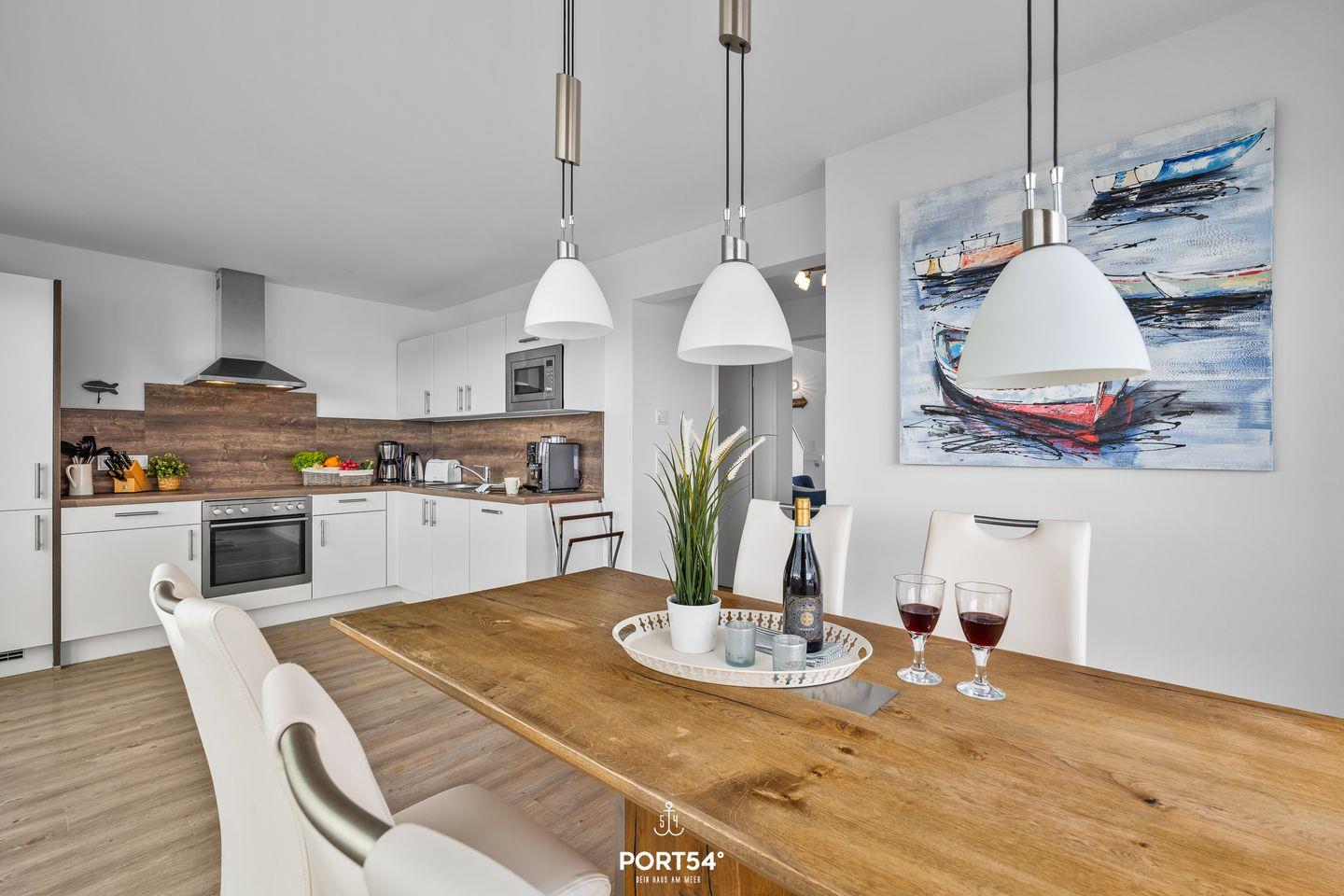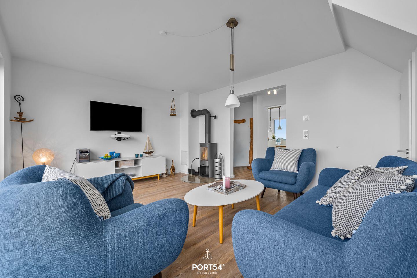 Im ersten Obergeschoss erwartet Sie ein lichtdurchfluteter Wohnbereich mit gemütlichem Kaminofen, der besonders an kühleren Tagen für behagliche Stunden sorgt. Ergänzt wird diese Ebene durch ein modernes Gäste-WC. Die angrenzende, halboffene Küche mit Essbereich ist voll ausgestattet und führt direkt auf den großzügigen Balkon. Dieser lädt mit Gartenmöbeln, Strandkorb, Sonnenschirm und Elektrogrill zu entspannten Sommerabenden und genussvollen Stunden im Freien ein.