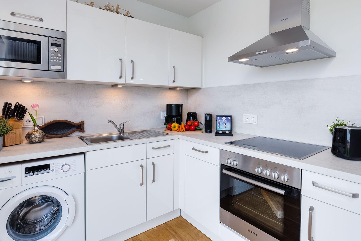 Im offen zum Wohnzimmer gestalteten Küchenbereich findest Du eine hochwertige Ausstattung vor. Dir stehen ein Ceranherd, ein Backofen, ein Kühlschrank mit integriertem Gefrierfach, eine Mikrowelle, eine Spülmaschine, eine Espressomaschine von Krups, eine Kaffeemaschine, ein Wasserkocher, ein Toaster, ein Stabmixer sowie umfangreiches Geschirr und zahlreiche Küchenutensilien zur Verfügung. Der angrenzende Essbereich mit Esstisch eignet sich ideal für gemeinsame Mahlzeiten.