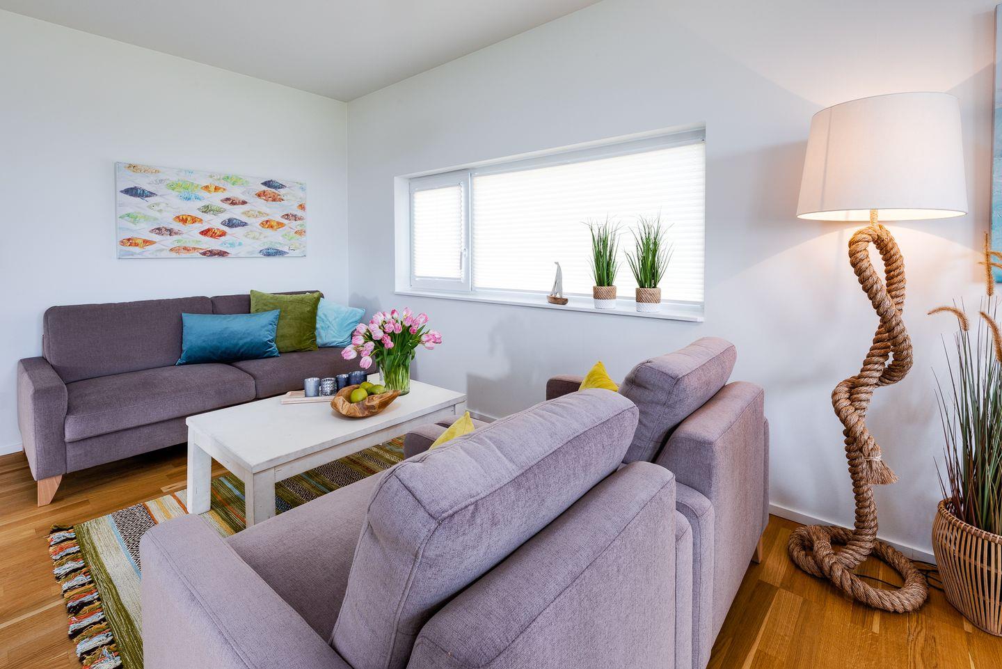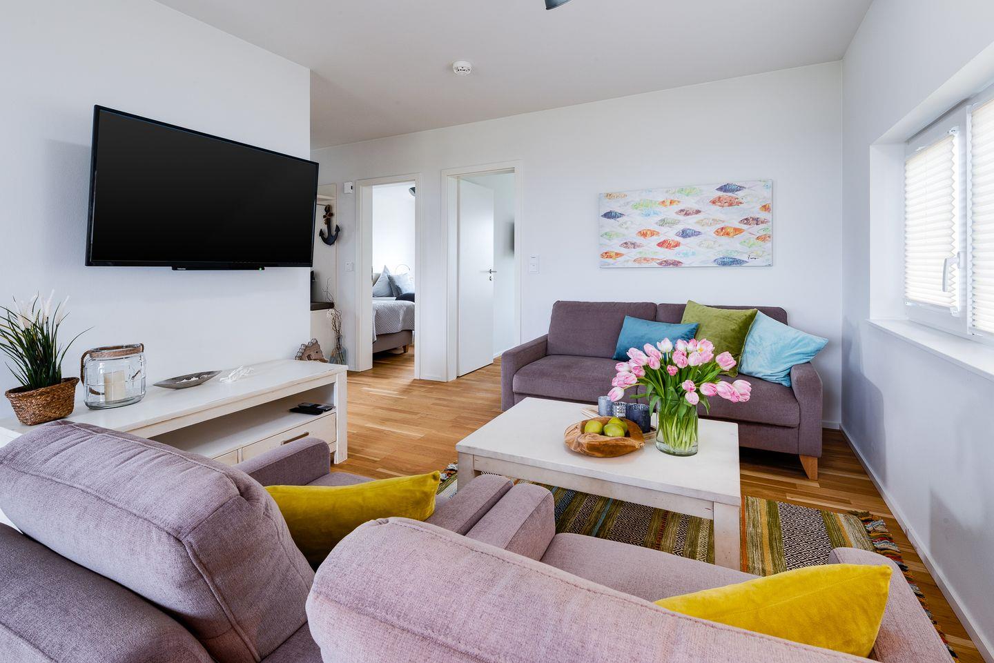Das Wohnzimmer ist modern und gemütlich eingerichtet und verfügt über ein komfortables Sofa, Sessel, eine Kommode sowie einen Kaminofen, der in der kühleren Jahreszeit für behagliche Wärme sorgt. Zusätzlich trägt eine Fußbodenheizung zu einem angenehmen Raumklima bei. Für Deine Unterhaltung stehen Dir zwei digitale Fernseher sowie kostenfreies WLAN zur Verfügung.