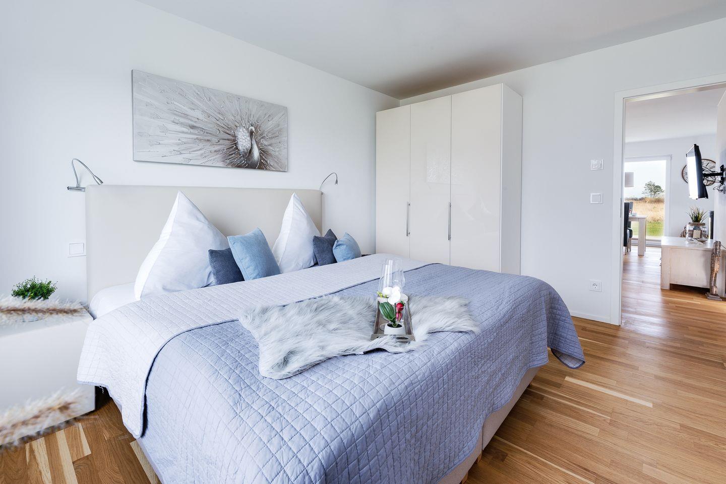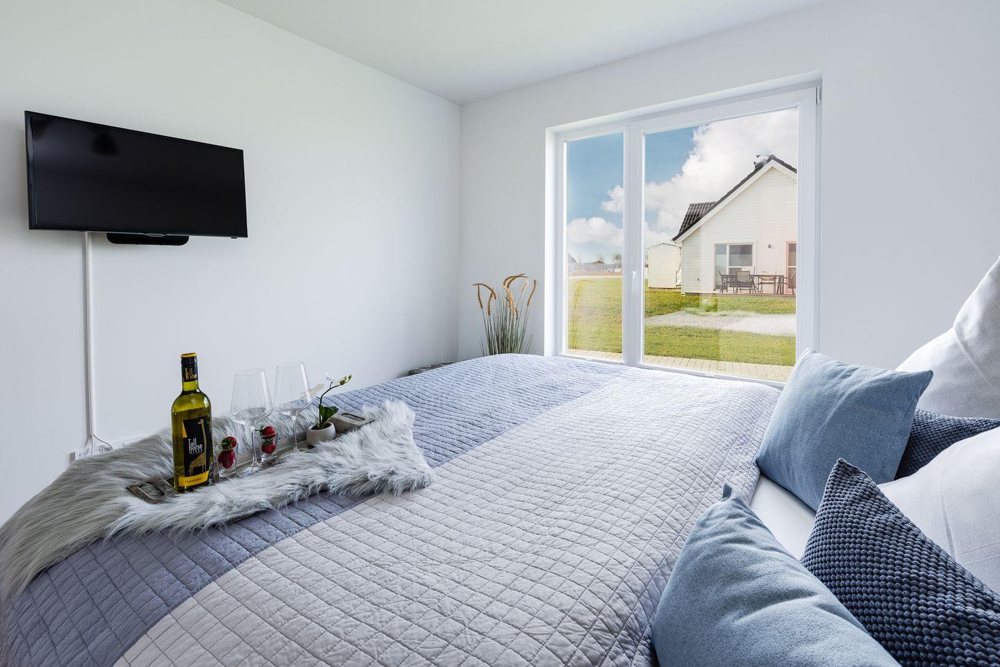 Das Hauptschlafzimmer hat ein Doppelbett und das zweite Schlafzimmer bietet zwei Einzelbetten. Der Wohnbereich mit Kamin und Flachbildfernseher sorgt für Gemütlichkeit, die offene Küche ist voll ausgestattet. Das Bad bietet Whirlpool-Badewanne und Infrarot-Sauna. Die Terrasse hat Gartenmöbel, Strandkorb, Sonnenschirm und Grill. PKW-Stellplatz und Fahrradschuppen sind vorhanden.