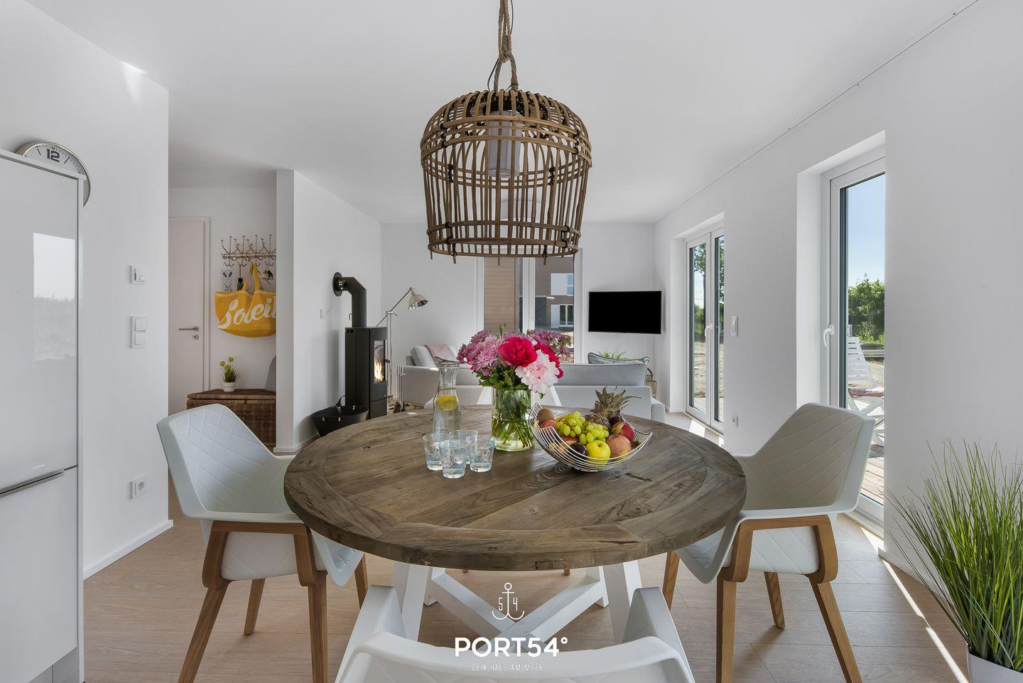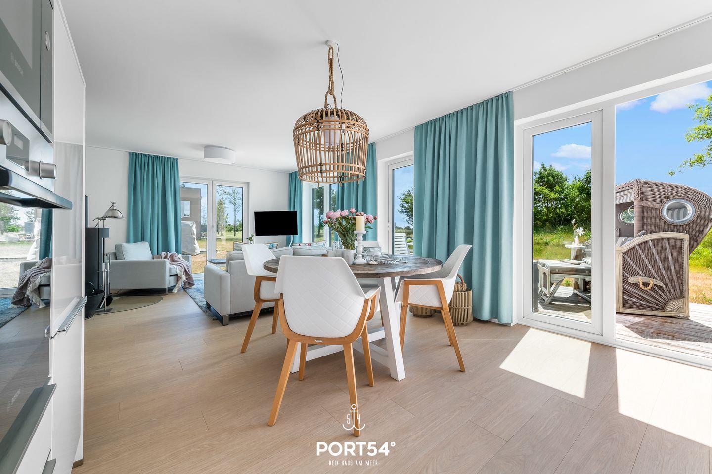 Angrenzend befindet sich eine hochwertige und voll ausgestattete Küche, in der es an nichts fehlt. Kocht hier nach Herzenslust und genießt die Abende mit euren Lieben am Esstisch, auf der Terrasse oder bei einem Grillabend in der frischen Ostseeluft. Die überdachte Südwest-Terrasse bietet hierfür das perfekte Ambiente. Lasst den Urlaubstag bei einem Glas Wein oder einem guten Buch in der Abendsonne ausklingen.