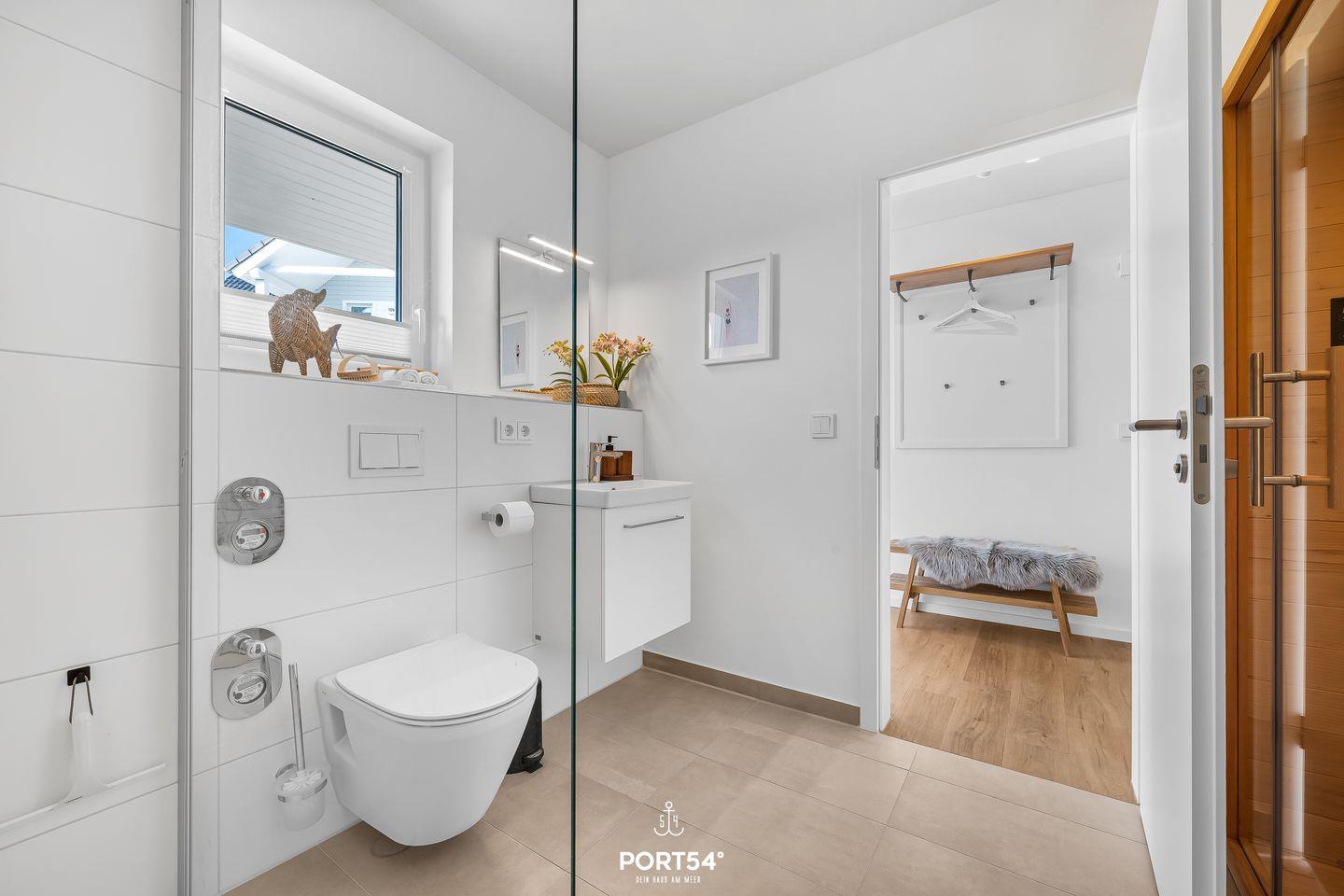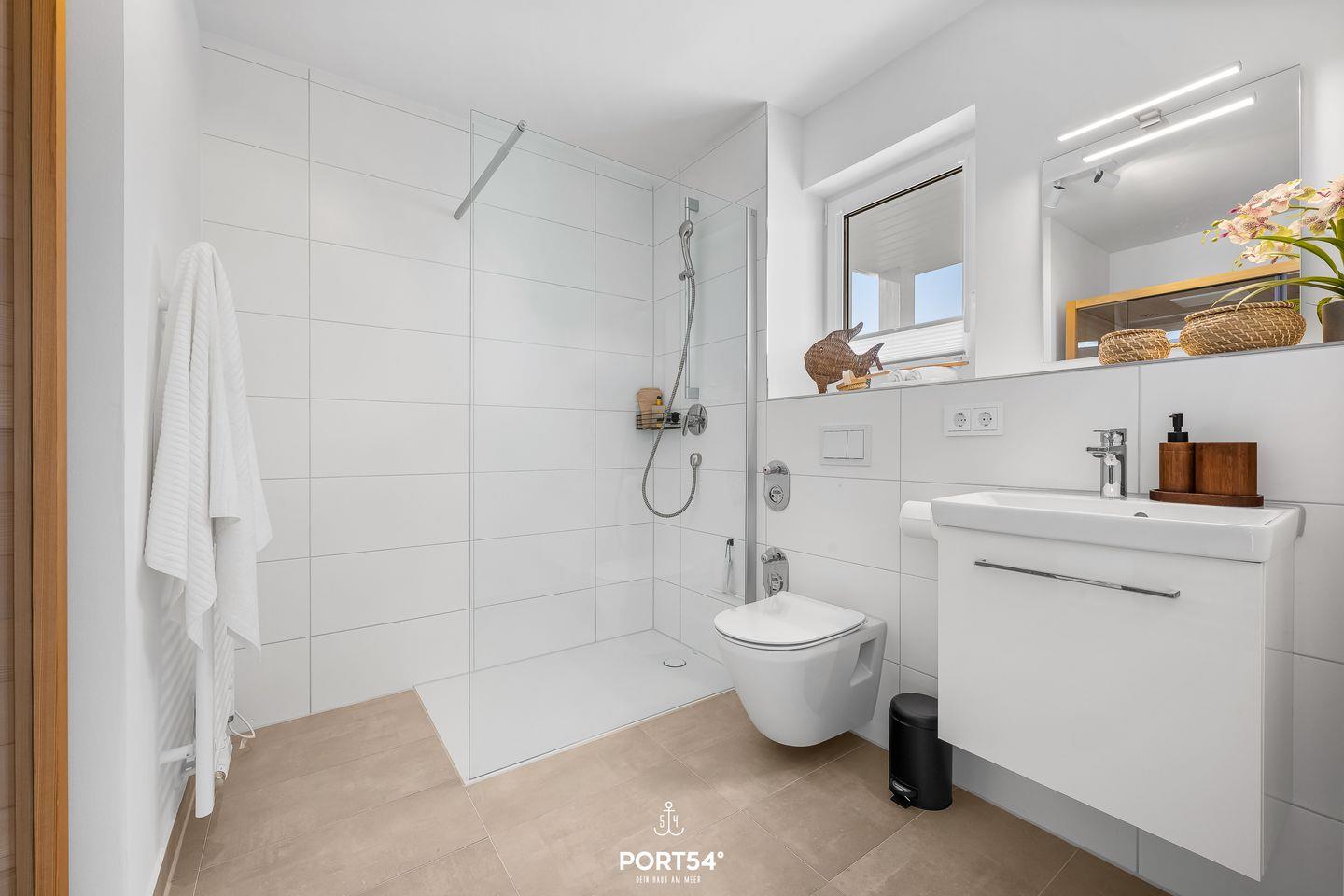 Das Badezimmer ist eine kleine Wellnessoase mit Infrarotsauna und bodengleicher Dusche – ideal, um den Alltagsstress hinter sich zu lassen. In der gesamten Ferienwohnung sorgt eine Fußbodenheizung für angenehme Wärme.