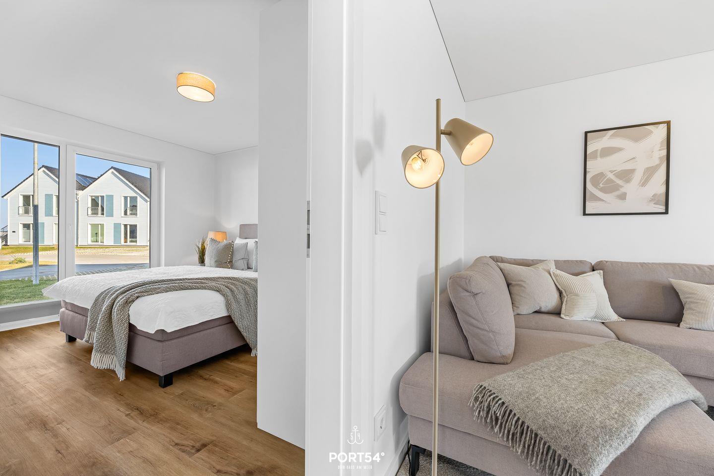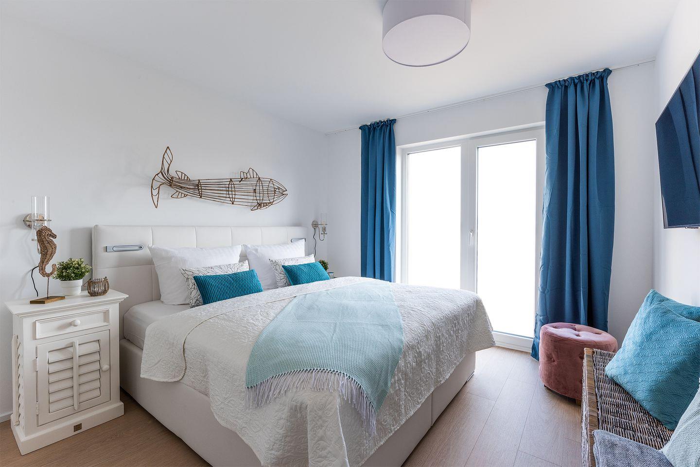 Die beiden Schlafzimmer sind hochwertig eingerichtet und sorgen für erholsame Ruhe nach einem ereignisreichen Strandtag. Das erste Schlafzimmer verfügt über ein komfortables Doppel-Boxspringbett (180 × 200 cm), das zweite über zwei hochwertige Einzel-Boxspringbetten (je 90 × 200 cm). Beide Zimmer sind mit einem Smart-TV und einem Kleiderschrank ausgestattet.