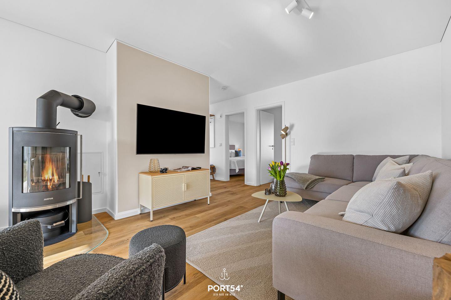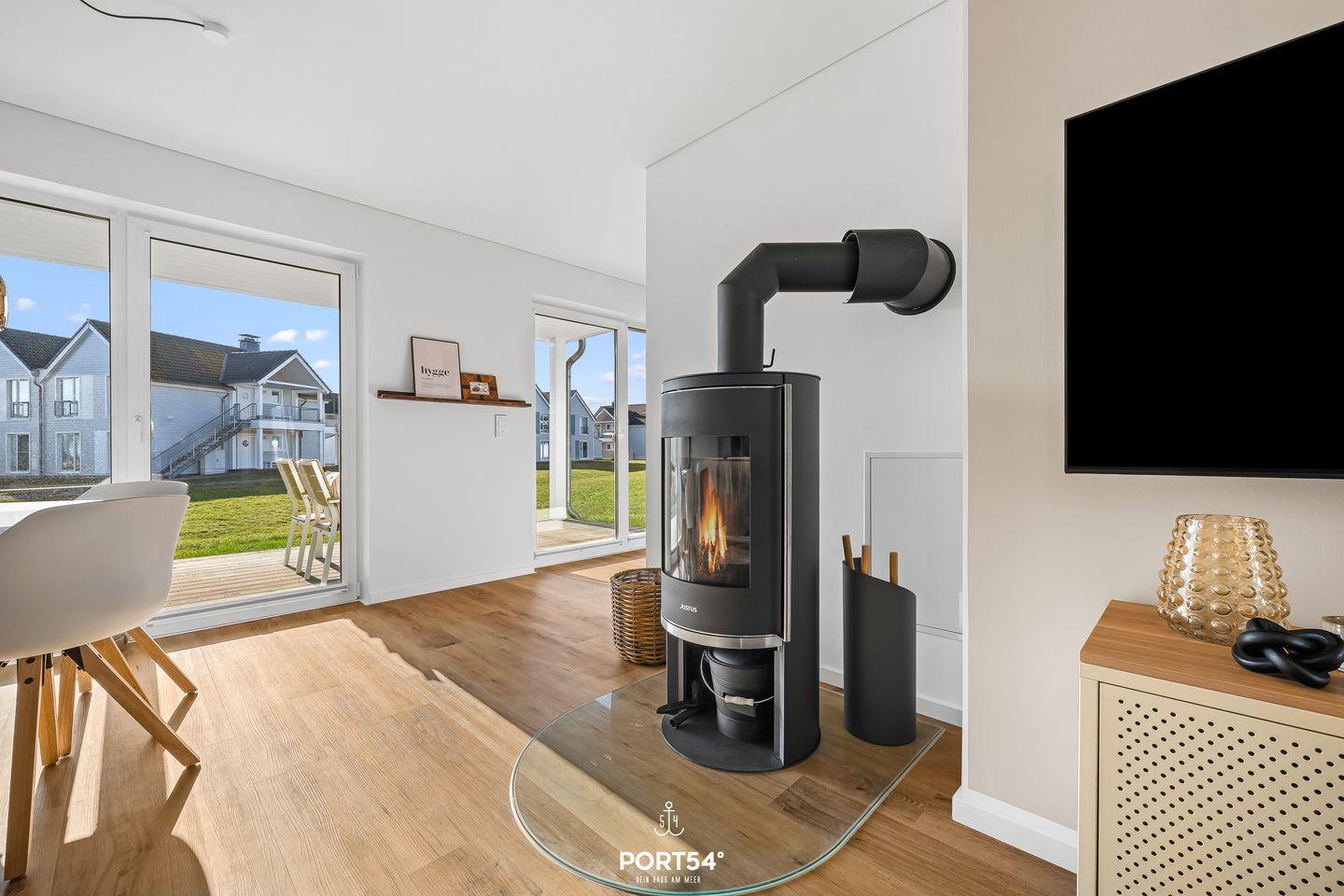 Die moderne Ferienwohnung SalzWasserHerz in Olpenitz bietet Sauna, Kamin, Terrasse und Strandnähe für entspannte Ostseeferien.