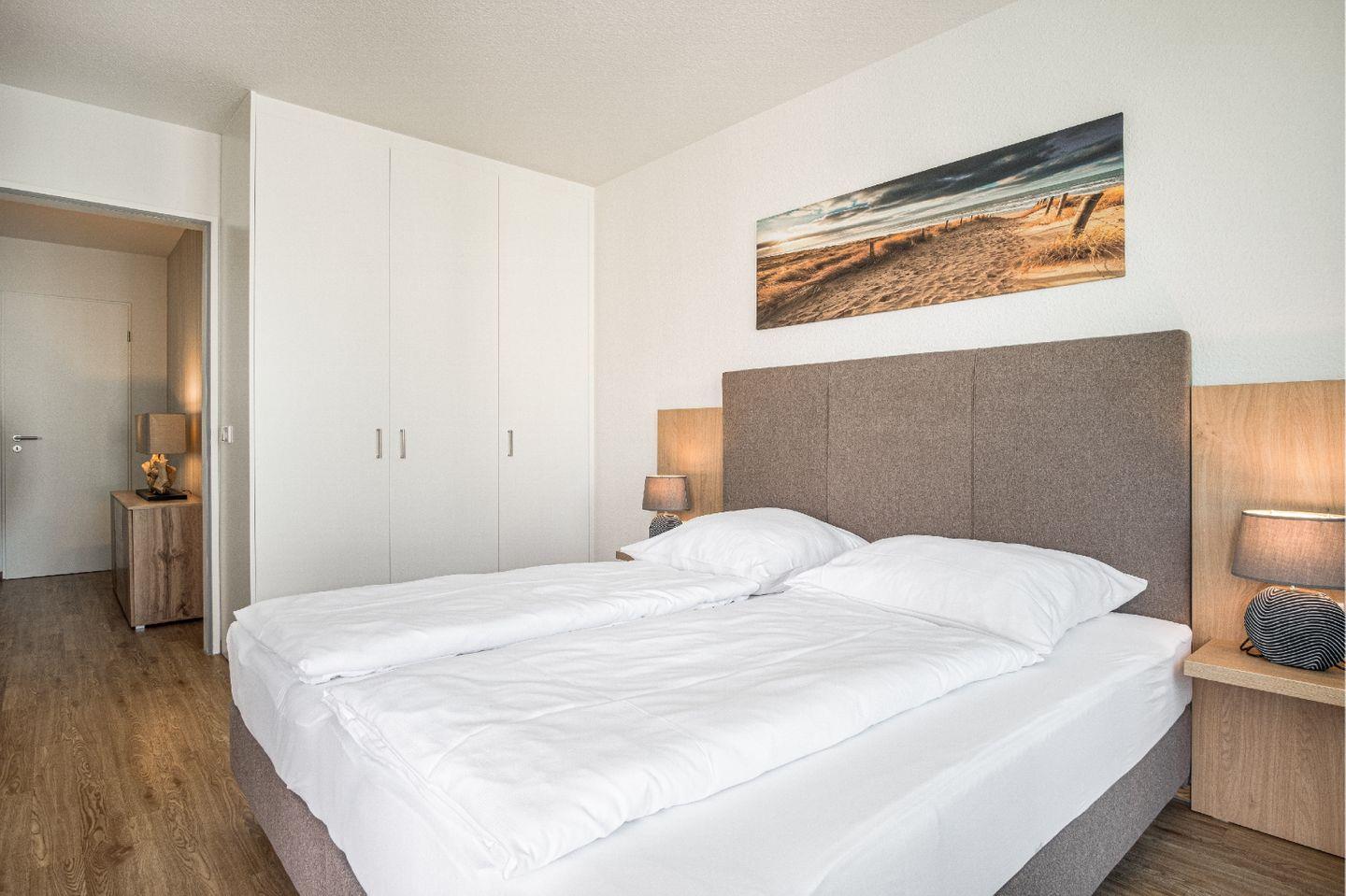 Schon beim Betreten erwartet Dich ein freundliches, lichtdurchflutetes Ambiente mit offenem Wohn- und Essbereich. Die Ferienwohnung verfügt über zwei separate Schlafzimmer, die jeweils mit einem hochwertigen Doppel-Boxspringbett (190 × 200 cm) ausgestattet sind. Verdunkelungsmöglichkeiten sorgen für Ruhe, Privatsphäre und erholsamen Schlaf.