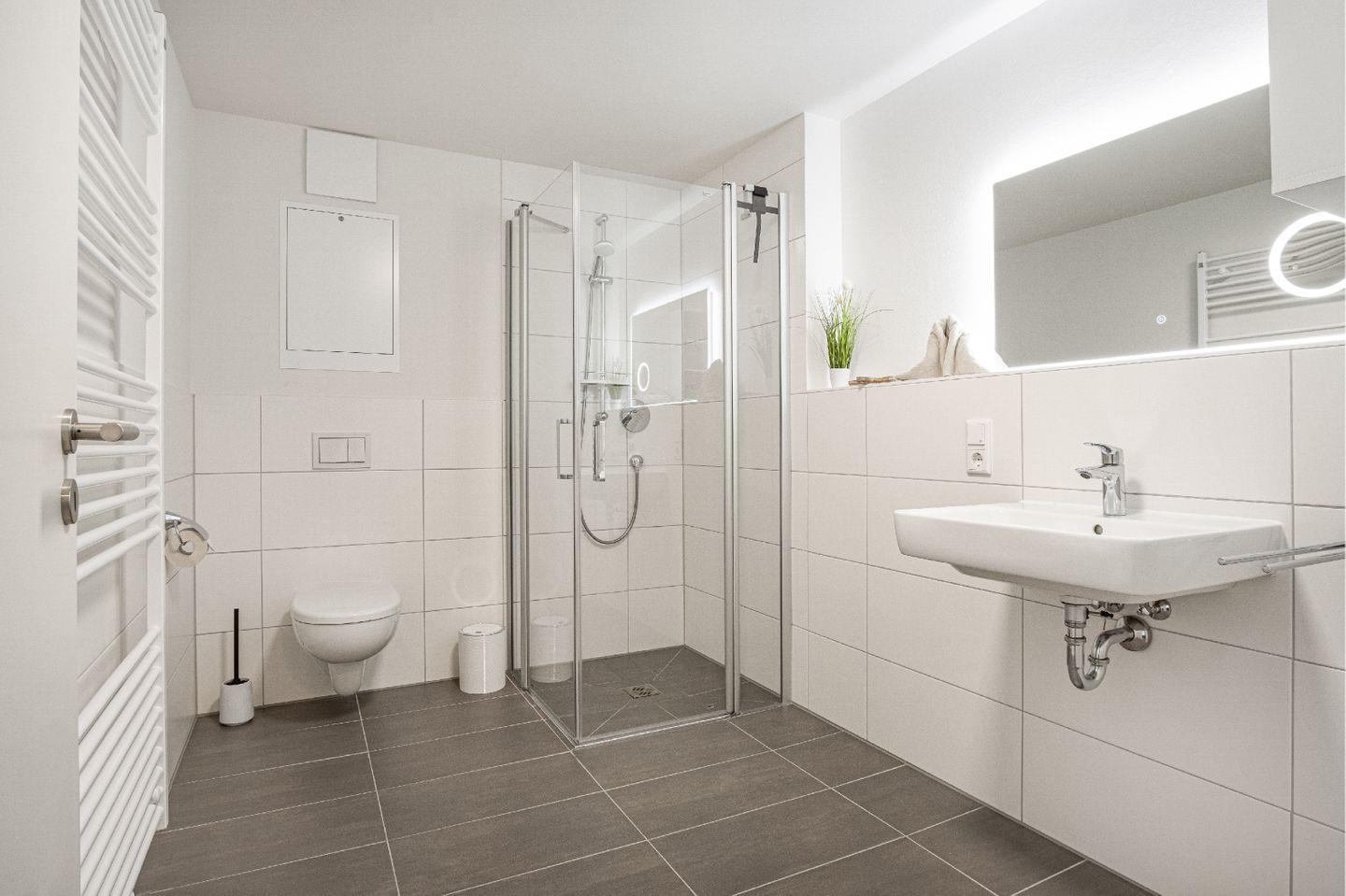 Das helle Badezimmer ist modern ausgestattet und verfügt über einen Haartrockner sowie einen Handtuchtrockner, sodass Du Dich rundum wohlfühlen kannst.