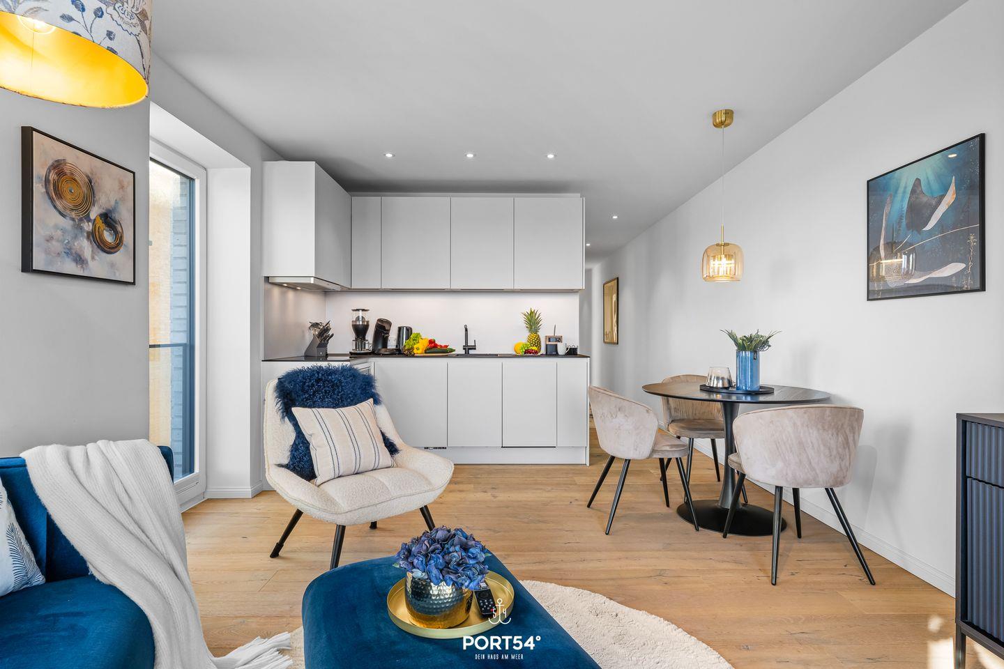 Direkt vor den bodentiefen Fenstern entfaltet sich ein atemberaubender Meerblick, der das gesamte Apartment mit natürlichem Licht durchflutet. Jeden Tag erwartet Dich ein fantastischer Blick auf die Ostsee – vom ersten Sonnenstrahl bis zum beruhigenden Sonnenuntergang. Der offene Wohn- und Essbereich ist der perfekte Ort, um den Tag zu genießen: Vom Kochen bis zum entspannten Verweilen bietet Dir dieser Raum alles, was das Herz begehrt.