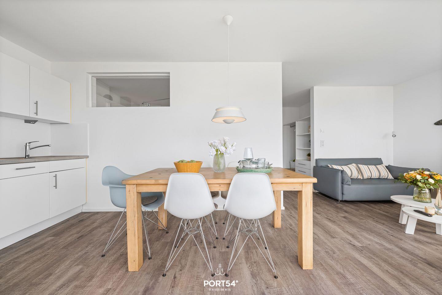 Das Wohnzimmer ist offen mit der voll ausgestatteten Küche verbunden und bietet Dir eine angenehme Wohnatmosphäre mit bequemem Sofa, Sessel und Essbereich. Für Unterhaltung sorgt ein Smart-TV, WLAN kannst Du im gesamten Objekt kostenfrei nutzen.