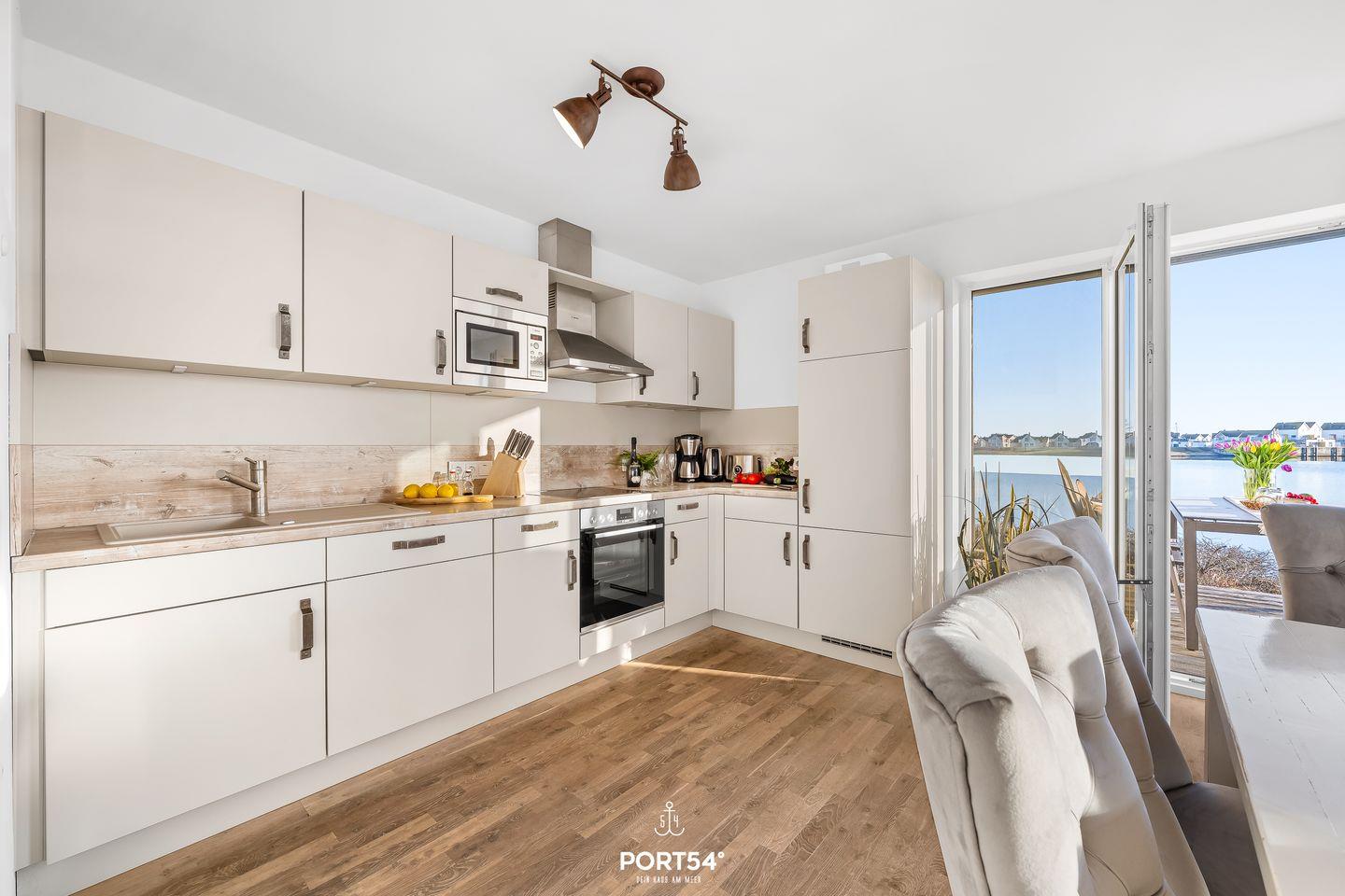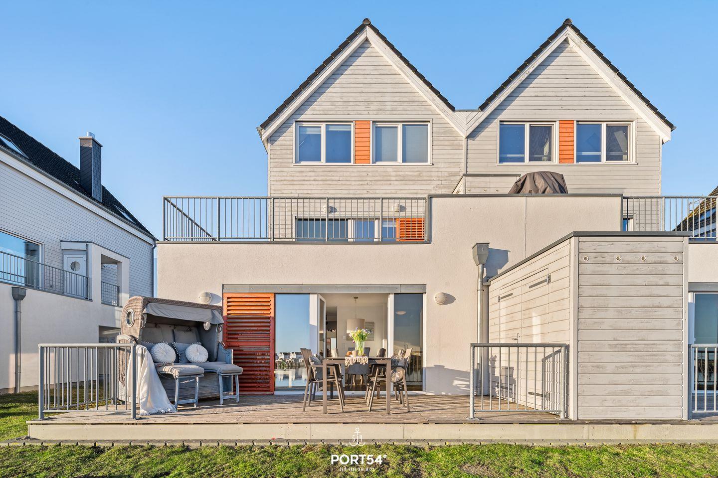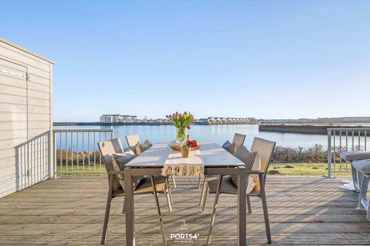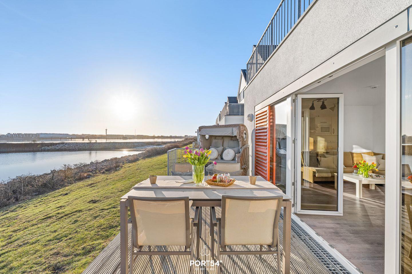 Moderne Ferienwohnung DreamLounge mit Meerblick, Sauna, Whirlwanne und Terrasse in erster Reihe am Wasser.